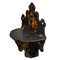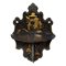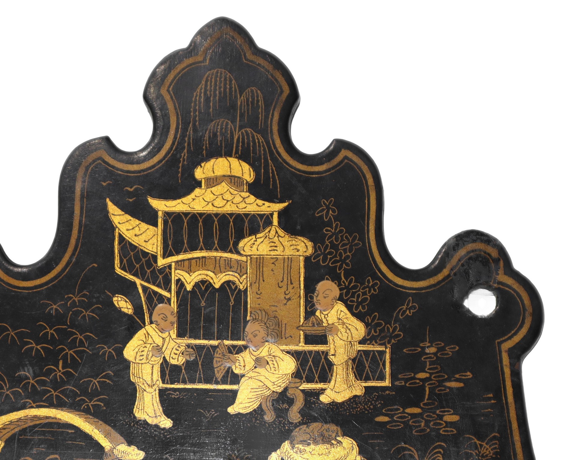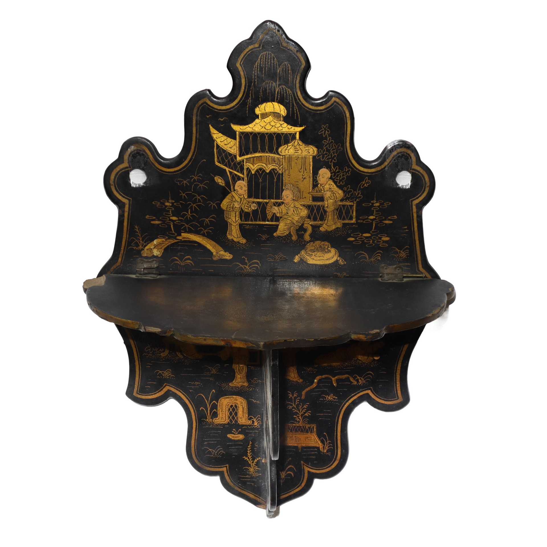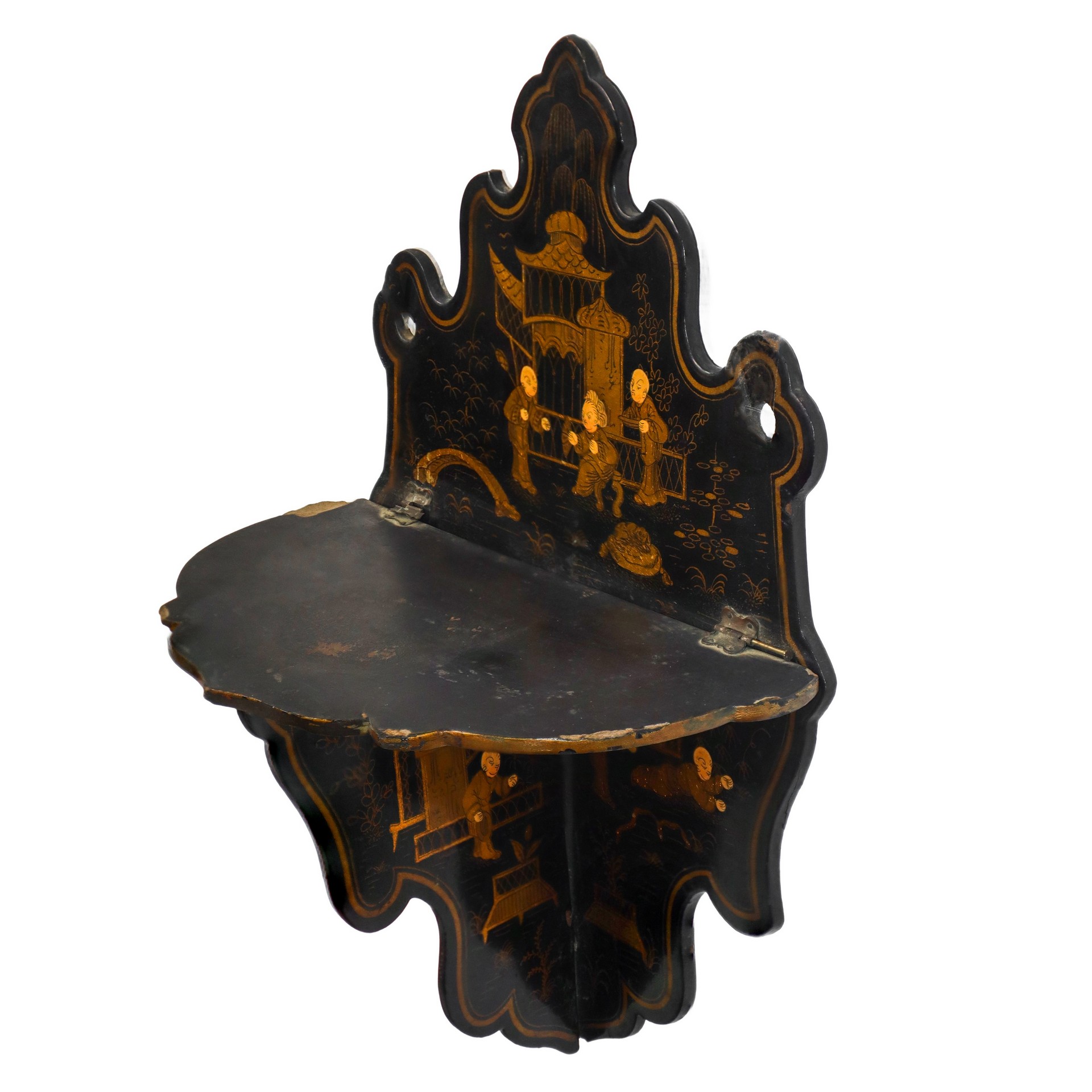 Piccola mensola giapponese e placca da muro in papier-mâché con scene di vita quotidiana dipinte in oro su lacca nera, 19° secolo