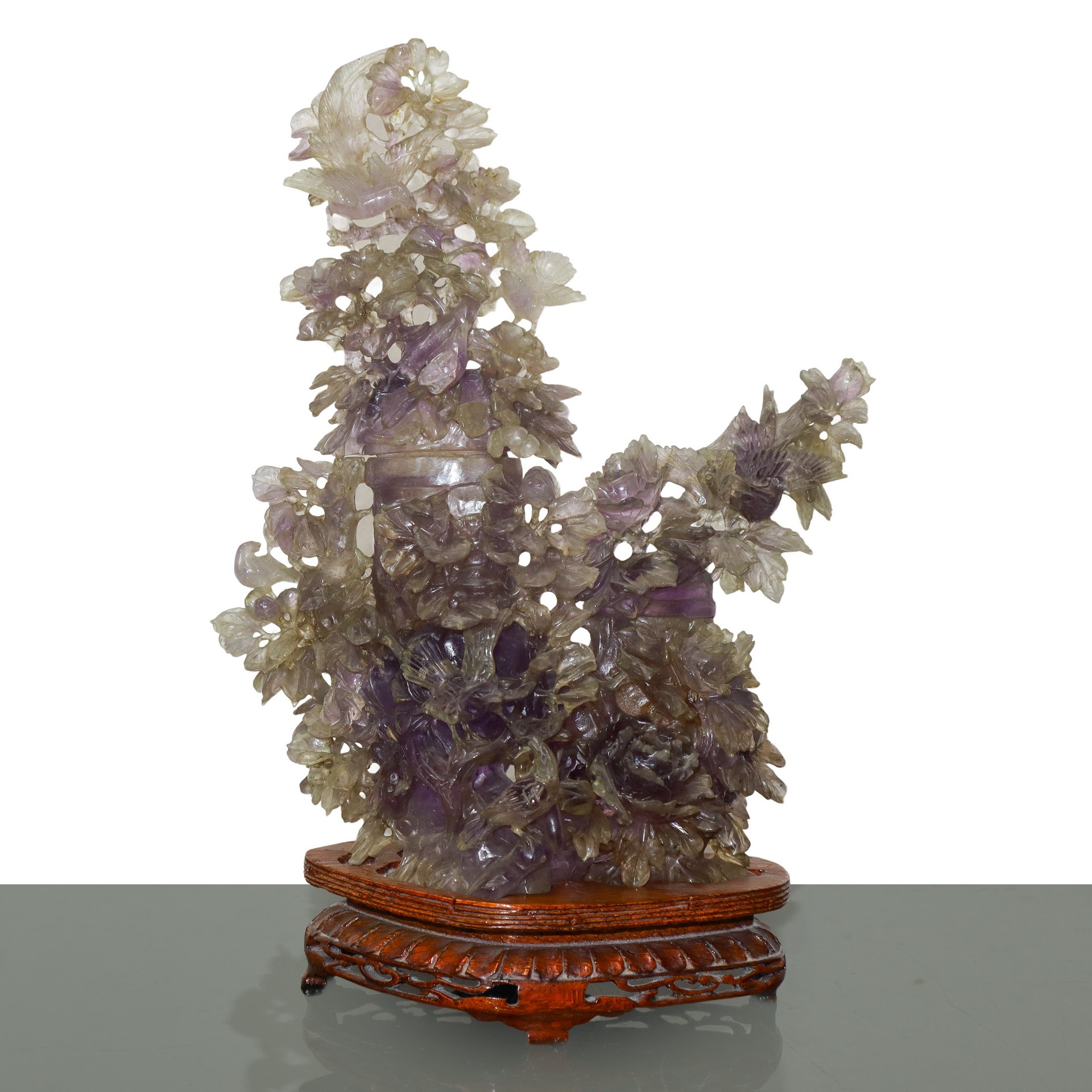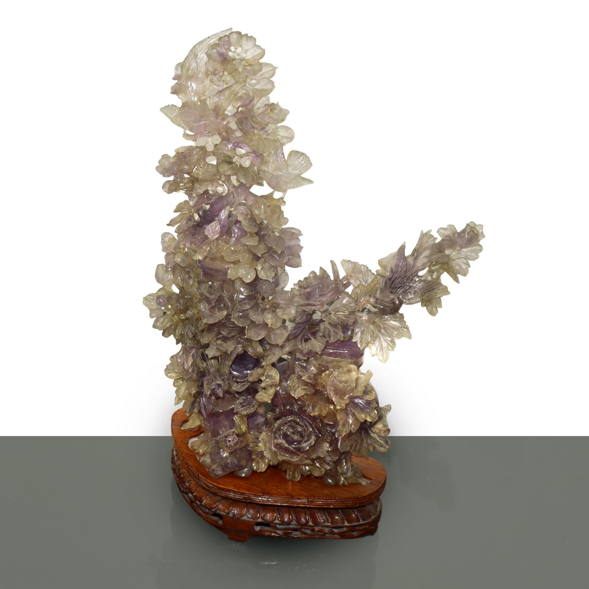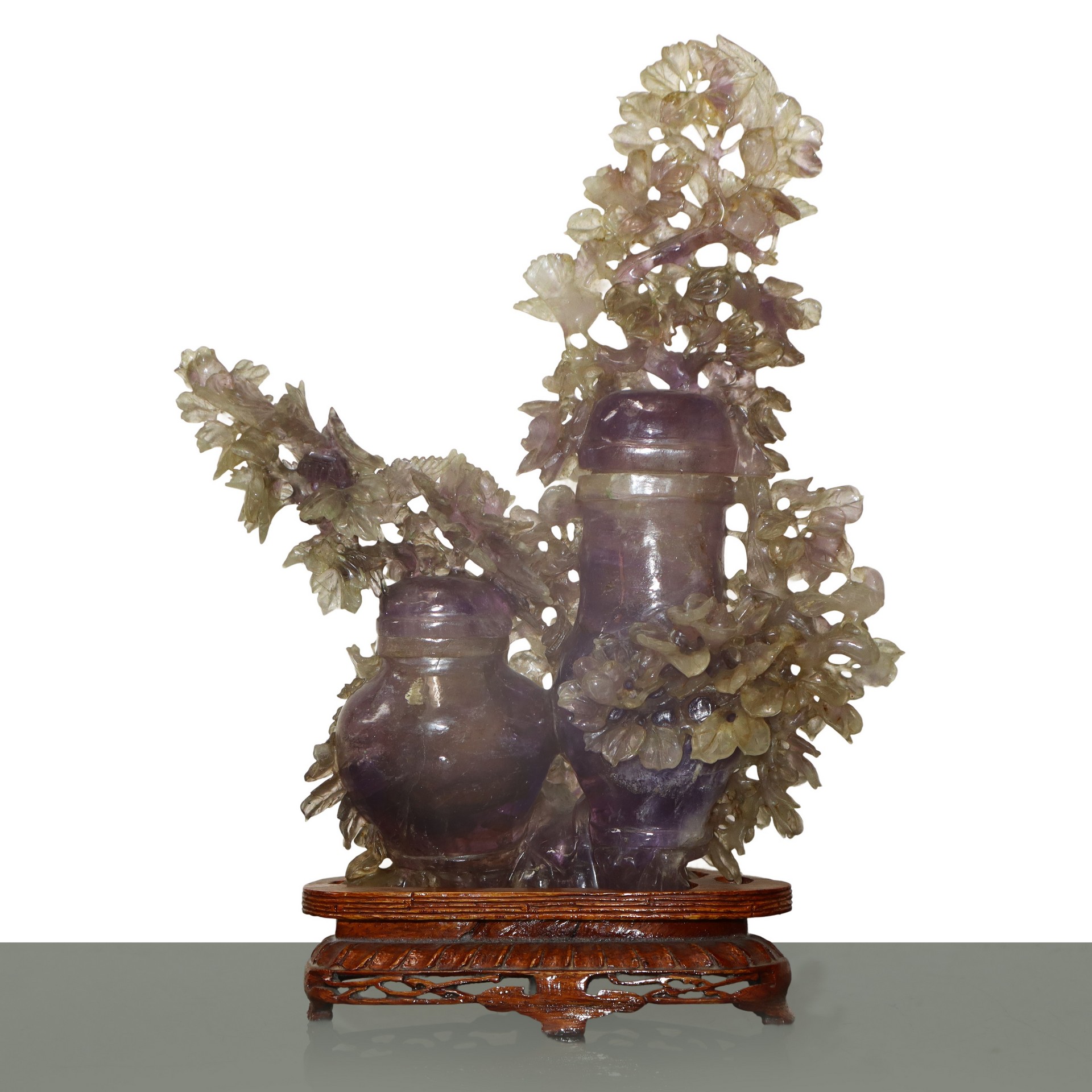 Coppia di poutiche in ametista con grande decoro floreale con base in legno con base h cm 32,5