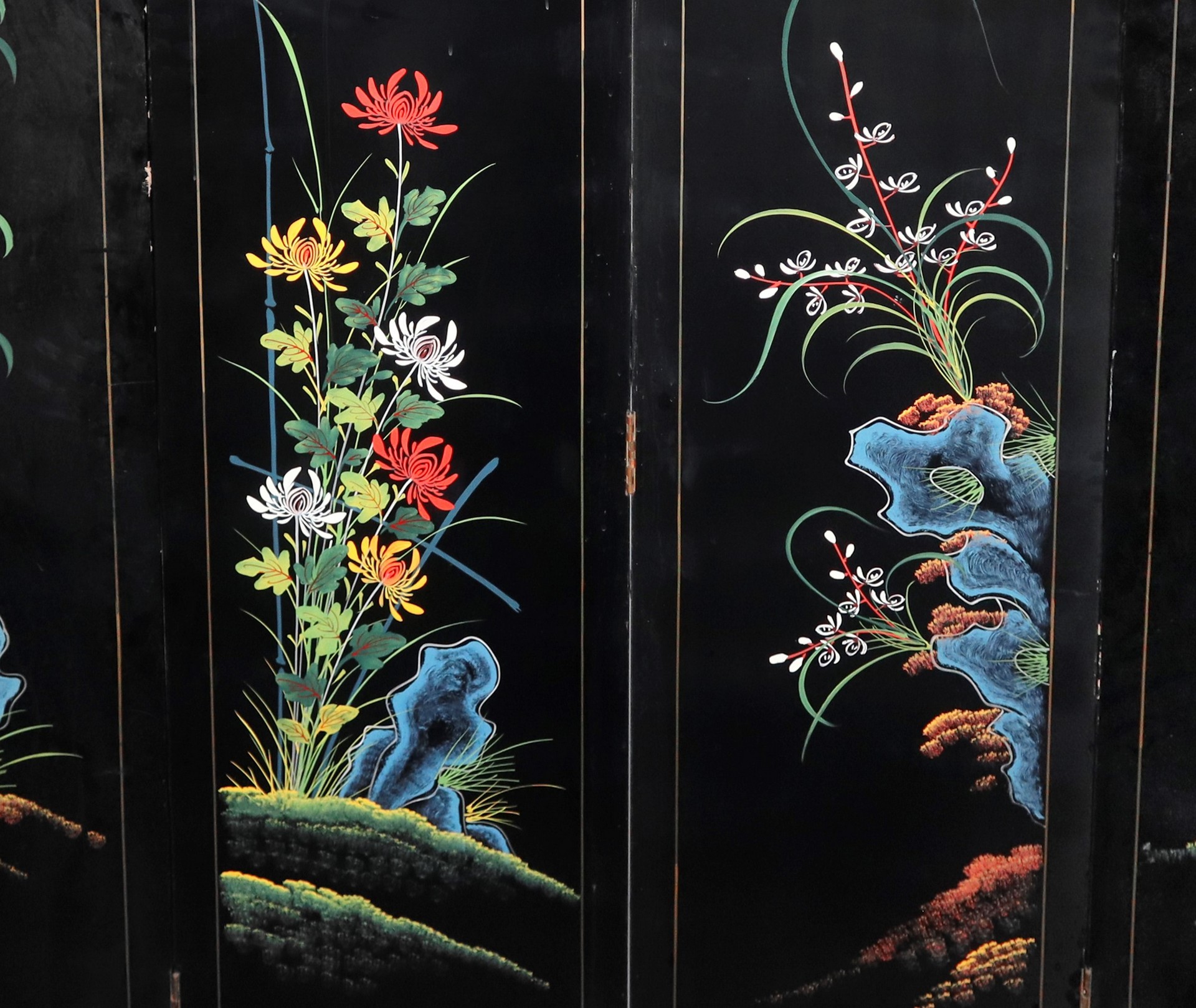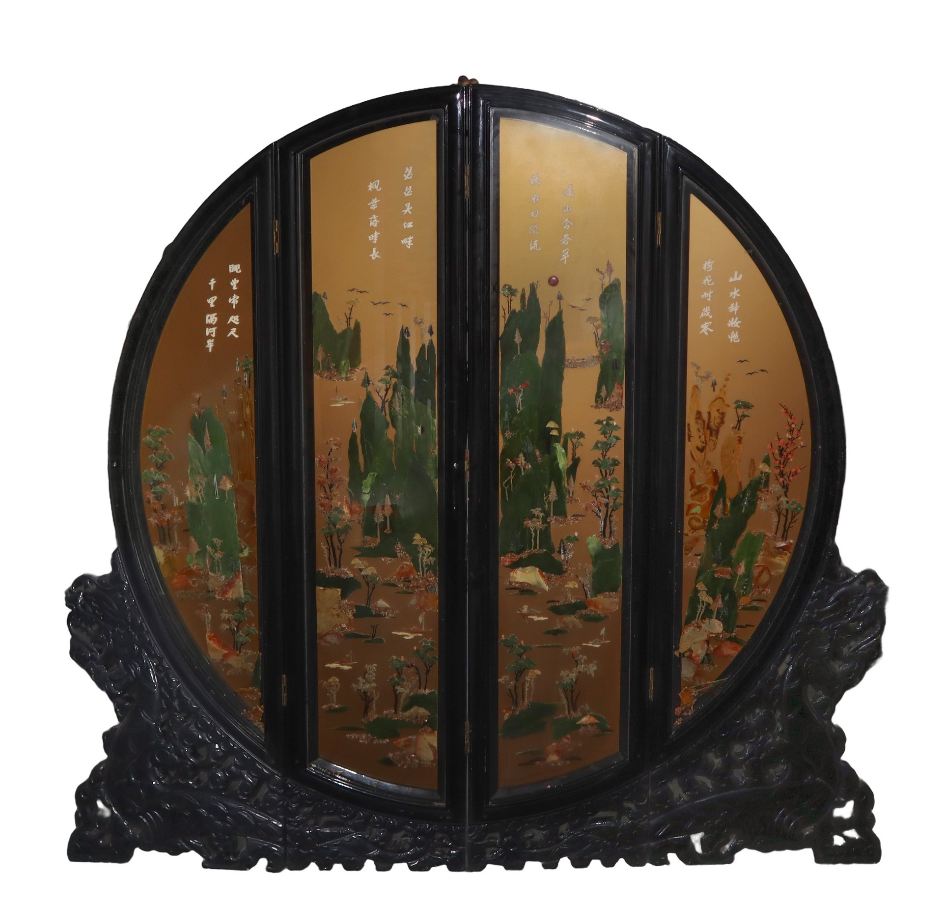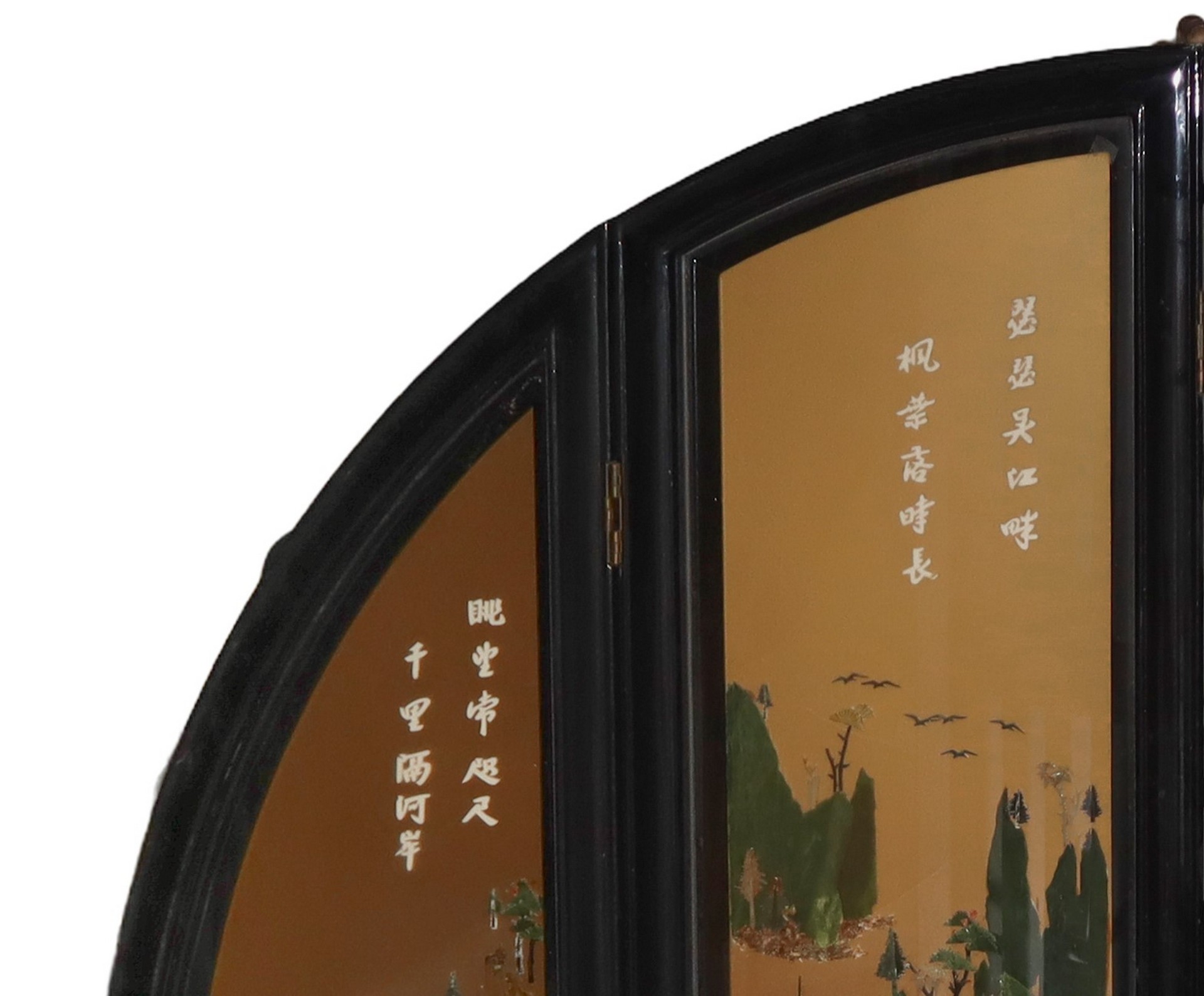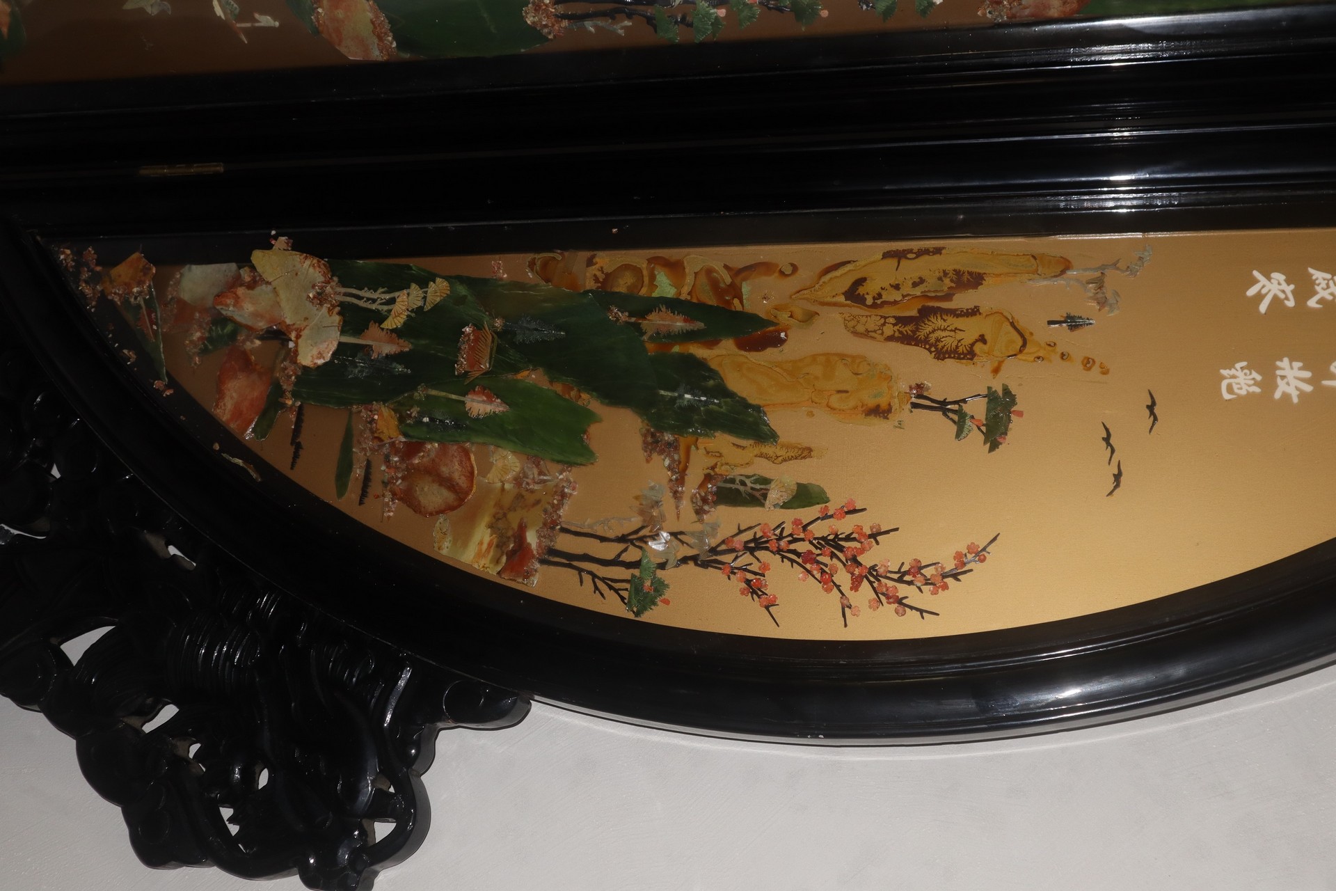 Con applicazione sotto vetro di giade, corniole, e pietre varie a motivi floreali. Retro interamente dipinto a mano. Prensenti alcune scollature delle decorazioni.