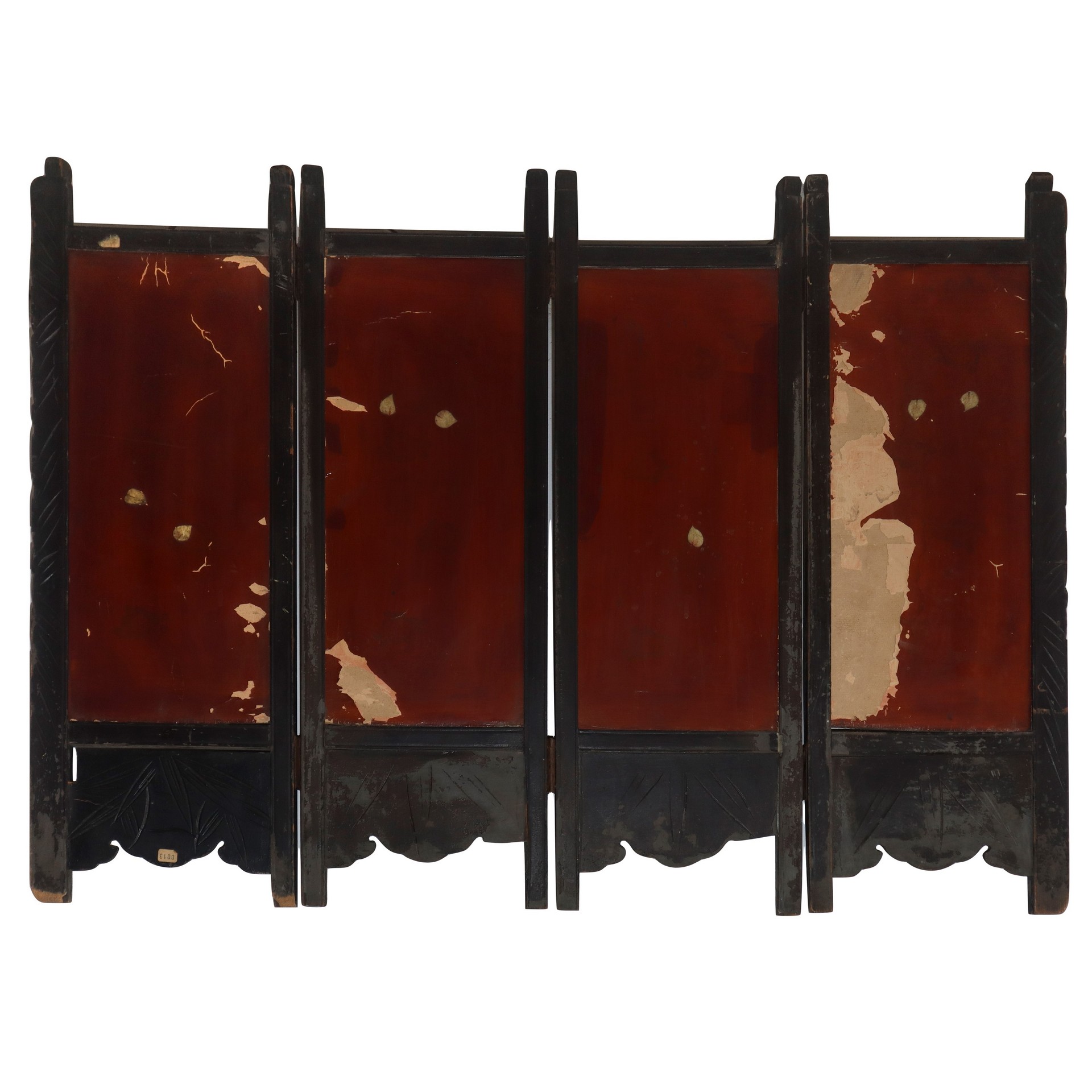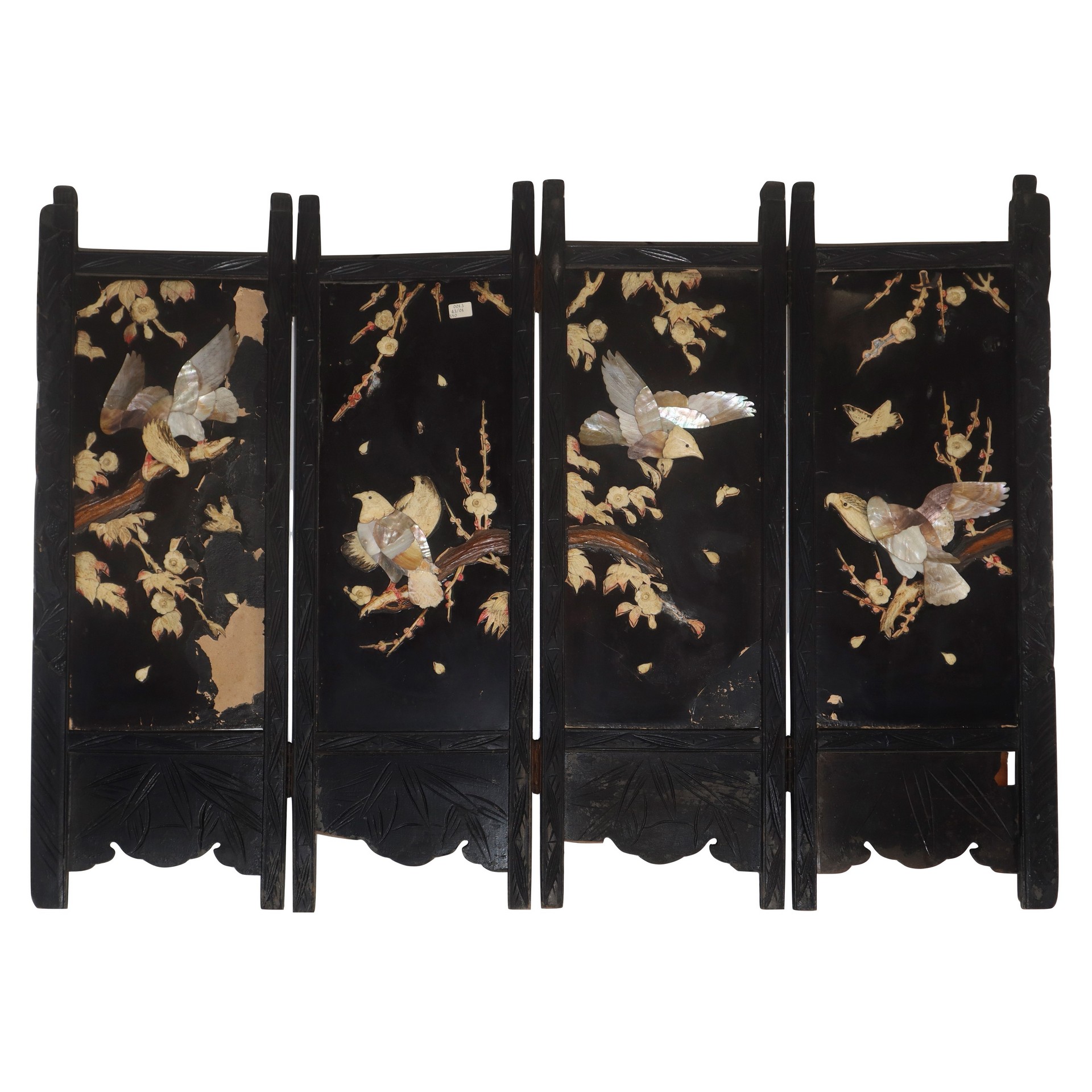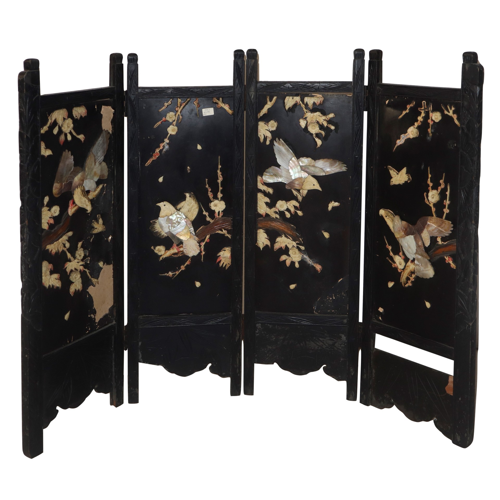 Separè cinese basso in legno con inserti in madreperla e legni chiari. H cm 71 x L 98 Da restaure, presenti mancanze e segni d'usoDa restaure, presenti mancanze e segni d'uso