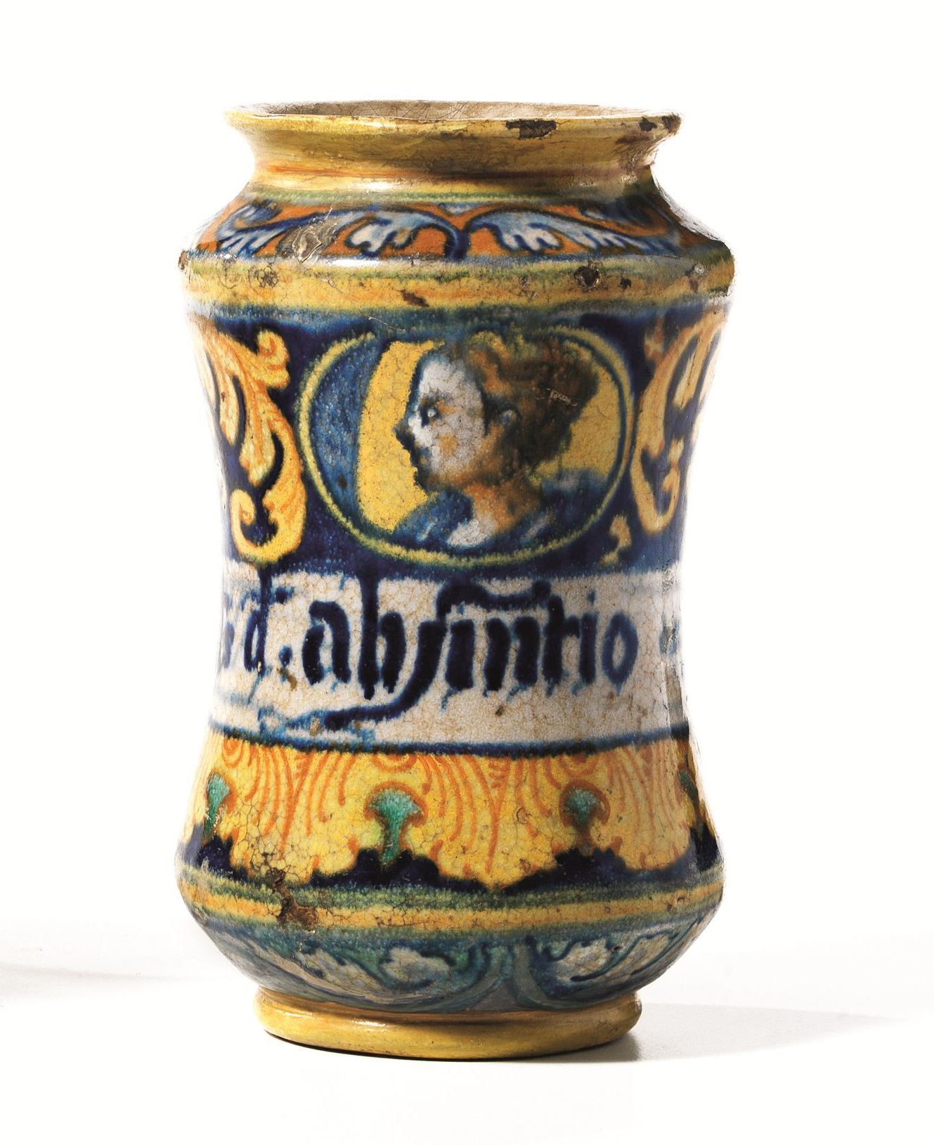 in maiolica decorata in policromia in blu cobalto, giallo, giallo-arancio, a cilindro appena rastremato con piede piano ad orlo arrotondato. Decoro a fasce parallele a racemi fogliati, centrato da due medaglioni di cui uno con ritratto e l’altro con l’emblema del cane sormontato da tre stelle. Cartiglio centrale con scritta apotecaria in caratteri gotici, alt. cm 16. Restauri