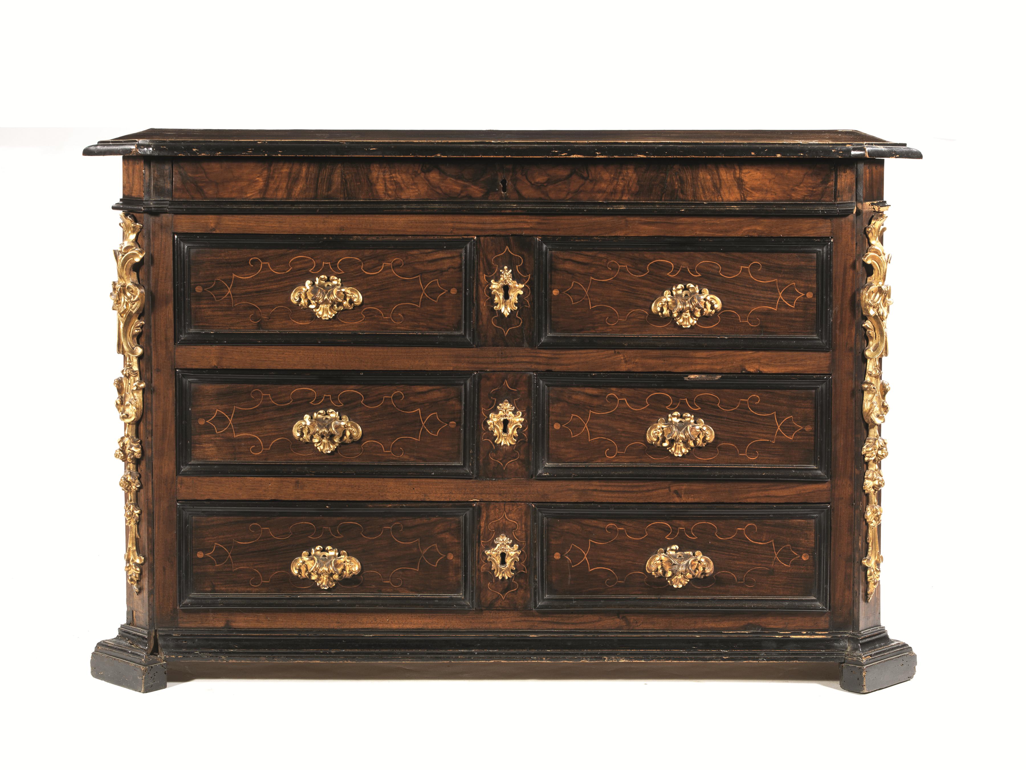 in noce intarsiato con profili in legno ebanizzato, piano con angoli scantonati, un sottile cassetto sotto al piano e tre sottostanti decorati da riserve intarsiate mistilinee, inquadrati da lesene angolari con applicazioni in legno intagliato e dorato, base modanata, piedi a mensola, cm 97x63x146, danni e mancanze