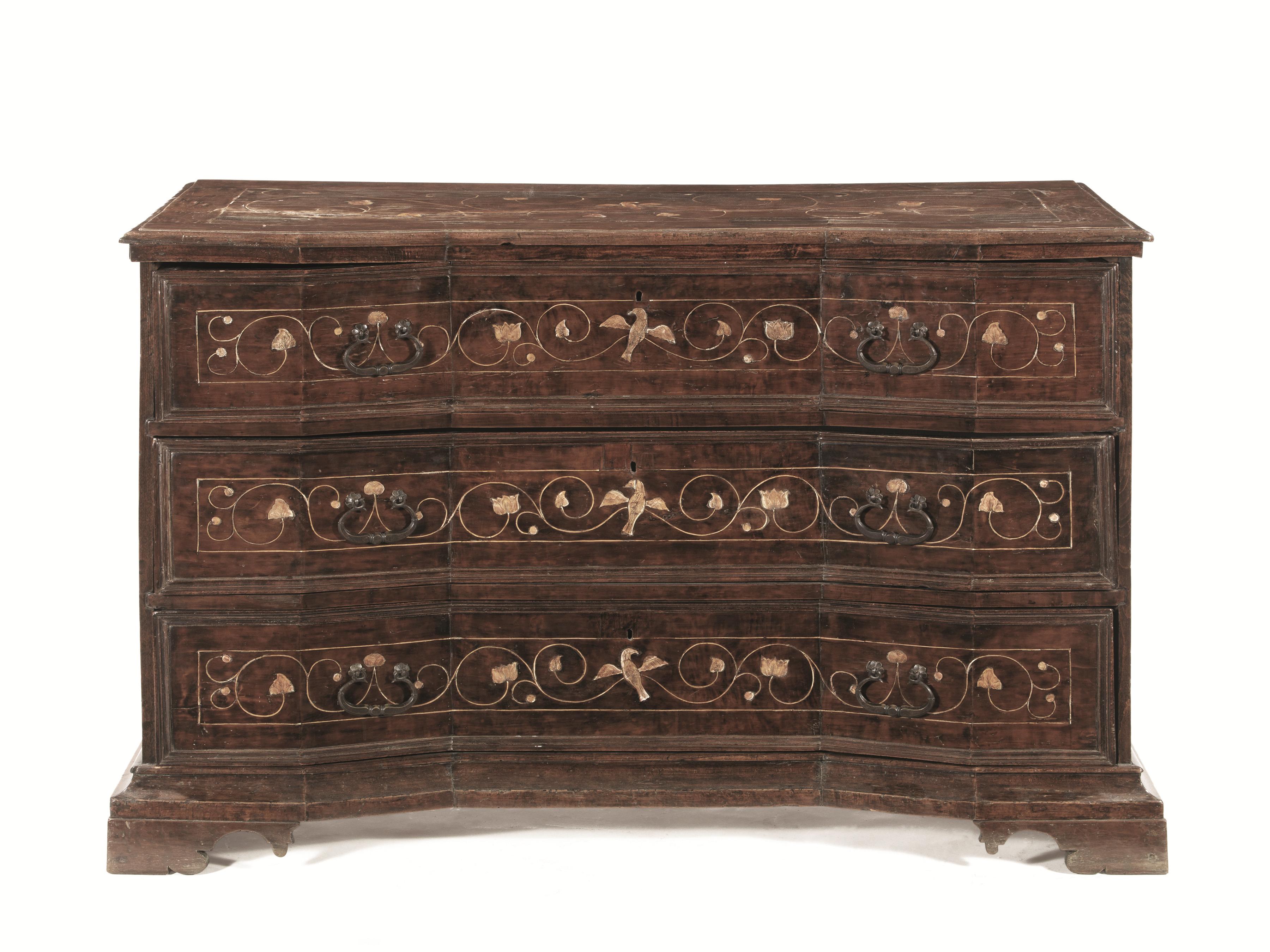 in noce, piano sagomato con becco di civetta, fronte spezzato a tre cassetti e intarsiato in osso con piccoli volatili da cui partono sottili girali vegetali terminanti in foglie e fiori, base modanata, piedi a mensola, cm 90x59x138, danni al piano