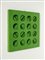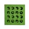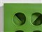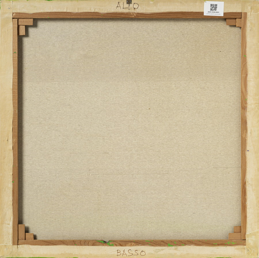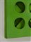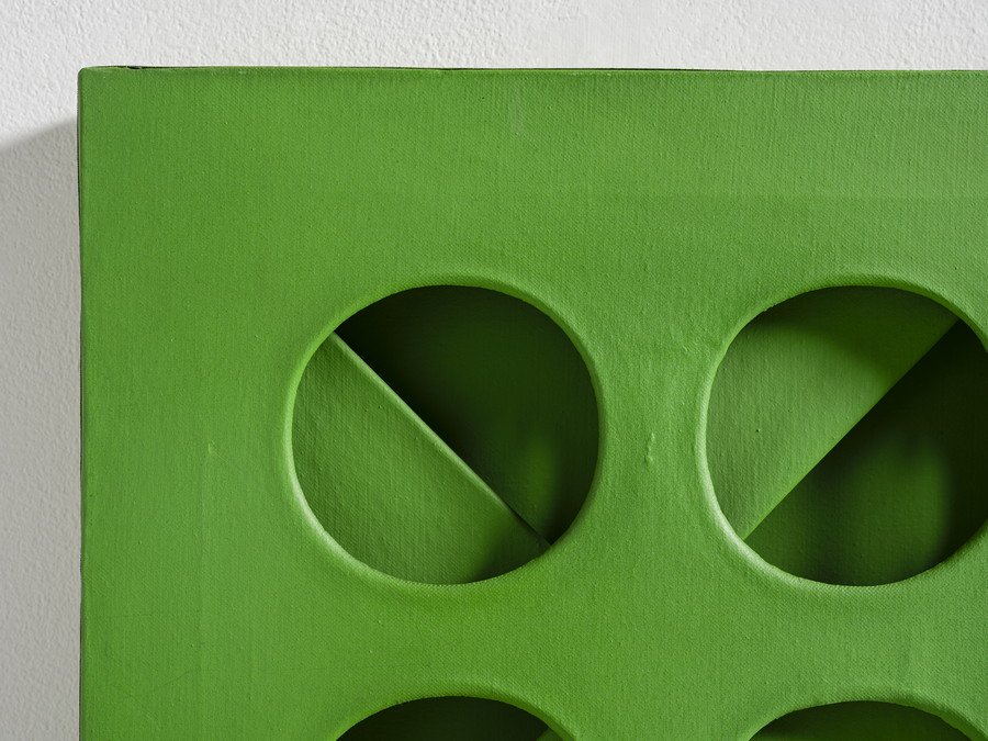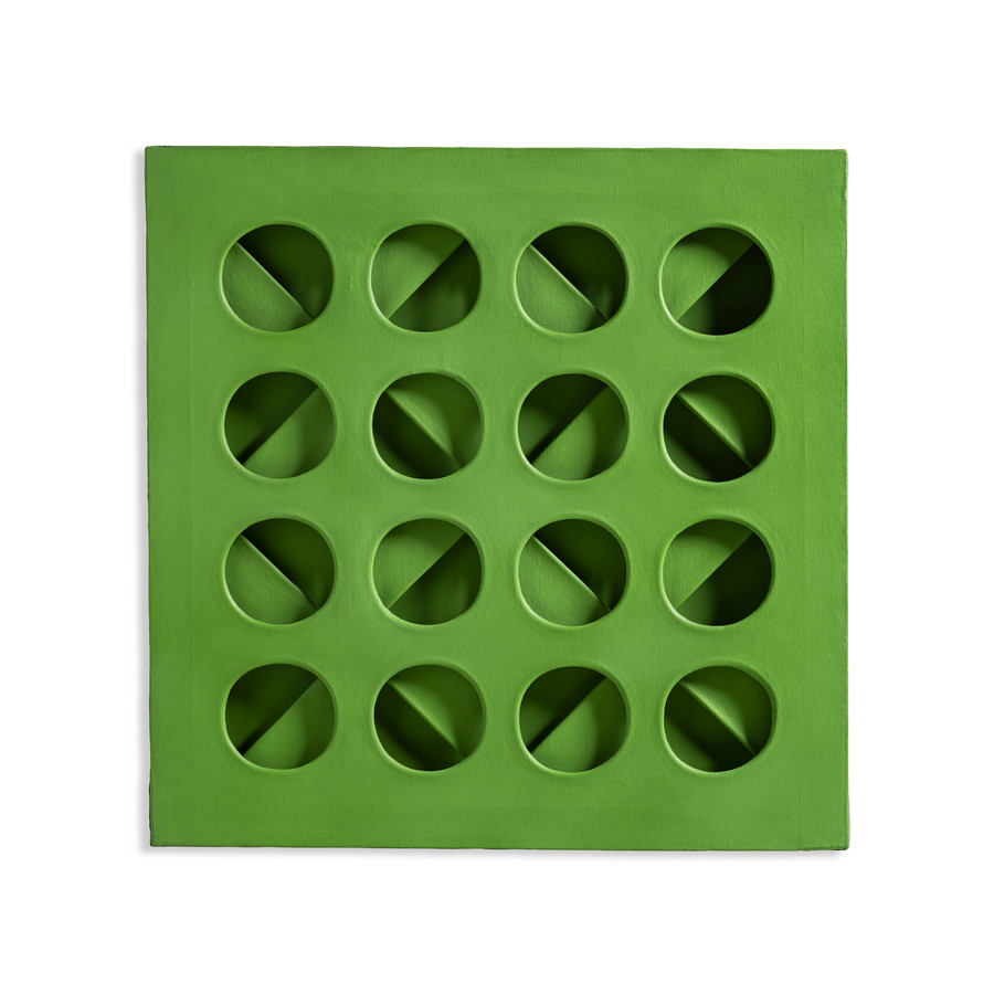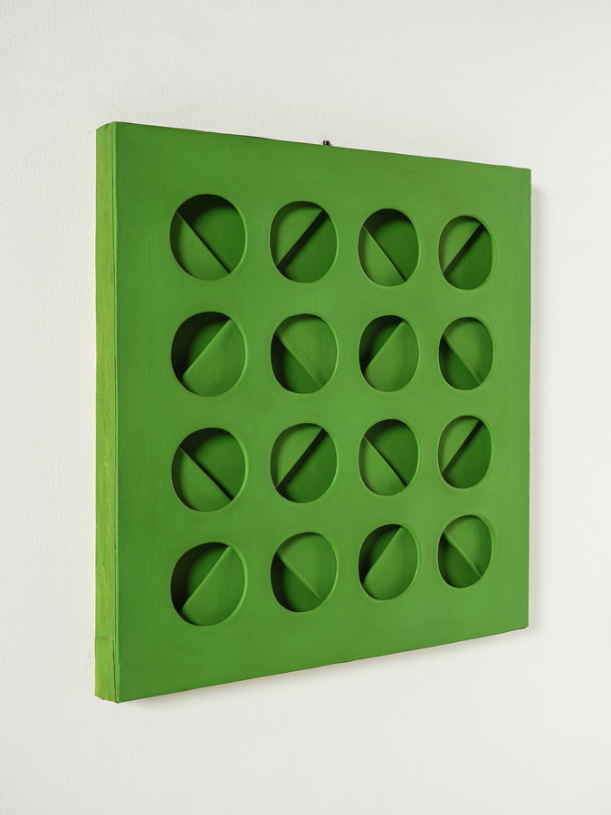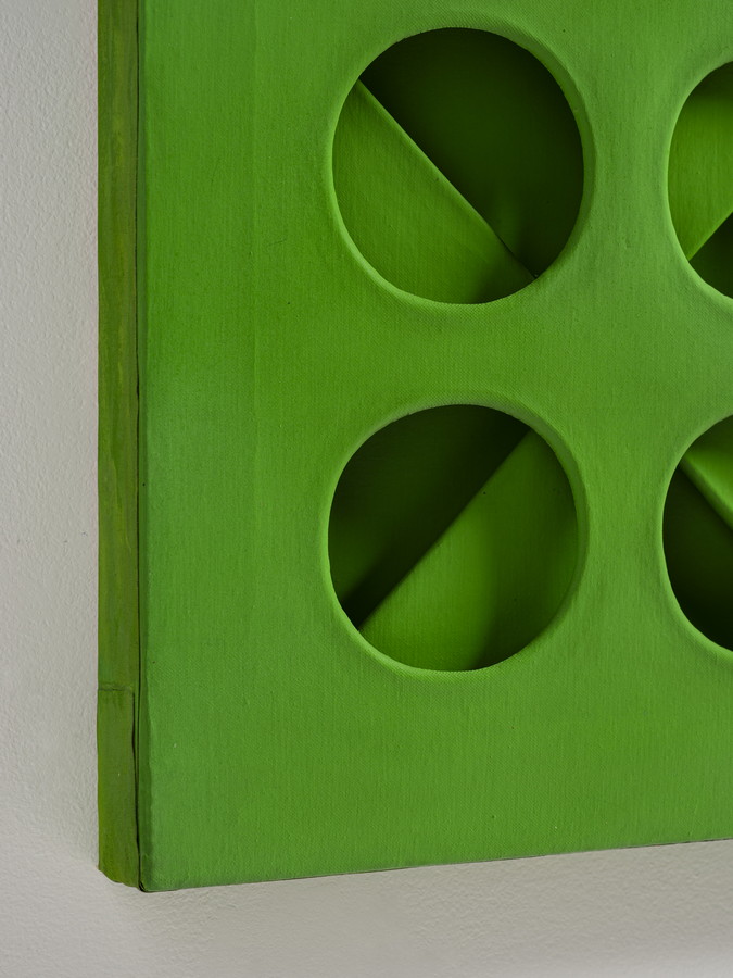 In quest'opera sedici aperture circolari si dispongono in una griglia rigorosa e modulare, ritmo preciso che governa l'intera superficie. Le tre tele sovrapposte, sfalsate secondo una diagonale costante, moltiplicano le relazioni tra luce e ombra all'interno di ciascun cerchio, generando una profondità vibrante sotto l'uniformità cromatica del verde. Il colore - unico, assoluto - non decora: definisce lo spazio come un campo energetico coerente, in cui ordine razionale e tensione percettiva convivono in equilibrio sottile. Monocromia e vuoto non sono assenza, ma principio generativo di forma.