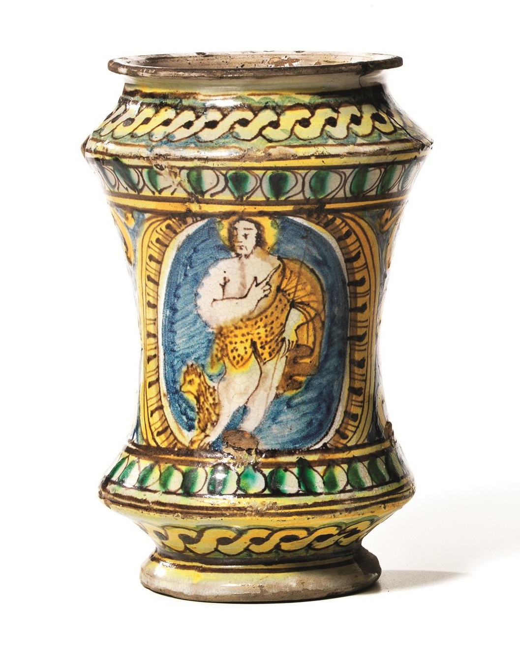 in maiolica decorata in policromia, sul fronte figura di San Giovanni Battista e sul verso fronde vegetali raccolte attorno ad un decoro centrato da una rosetta attorniata da foglie allungate disposte simmetricamente, alt. cm 18. Felature passanti all’orlo