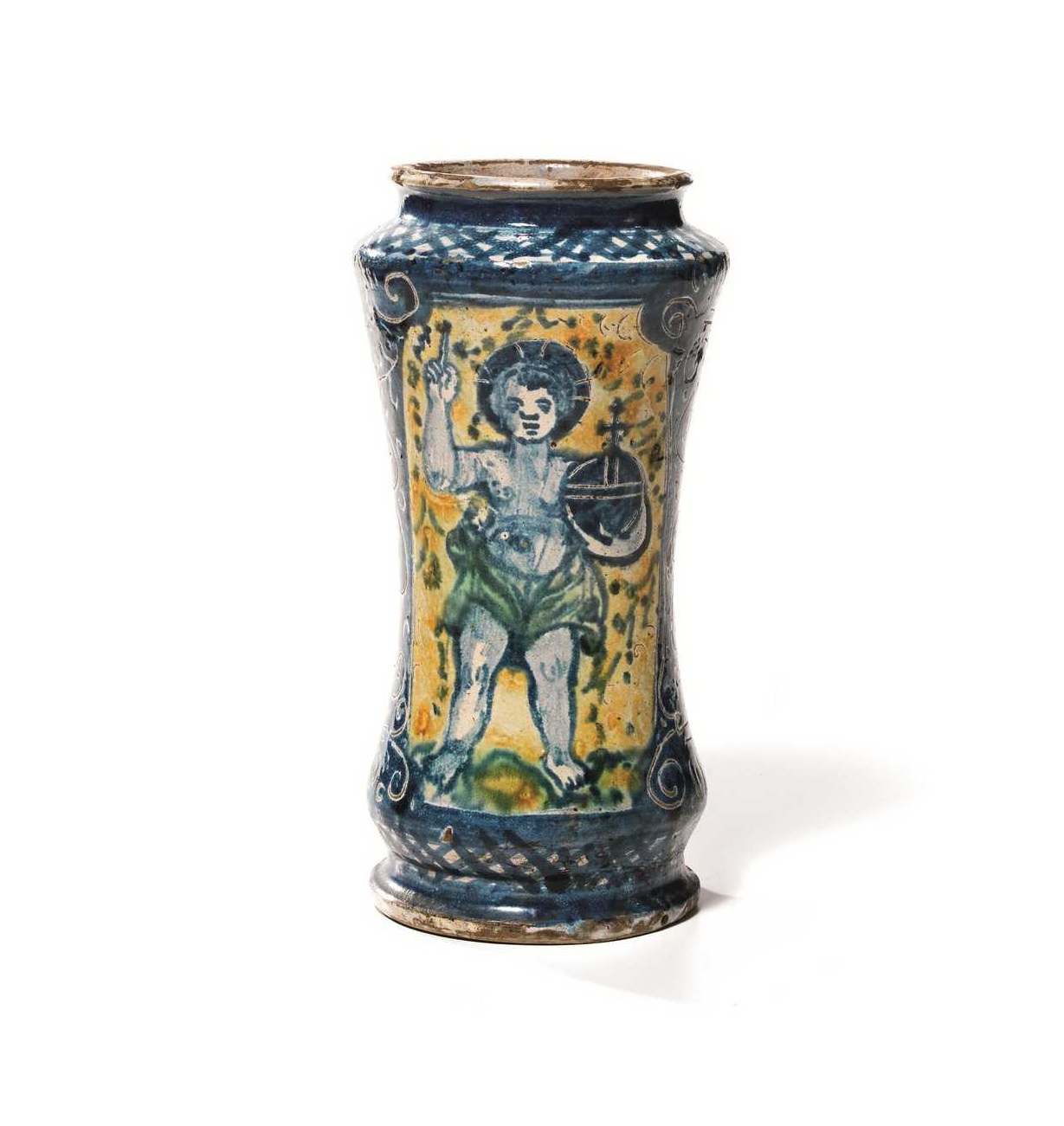 in maiolica, di forma allungata e rastremata, decorato sul fronte con figura di San Giovanni in una cornice su campo giallo. Sul retro un decoro a trofei in manganese, delineato con rapidità con tocchi di giallo su fondo blu, alt. cm 29