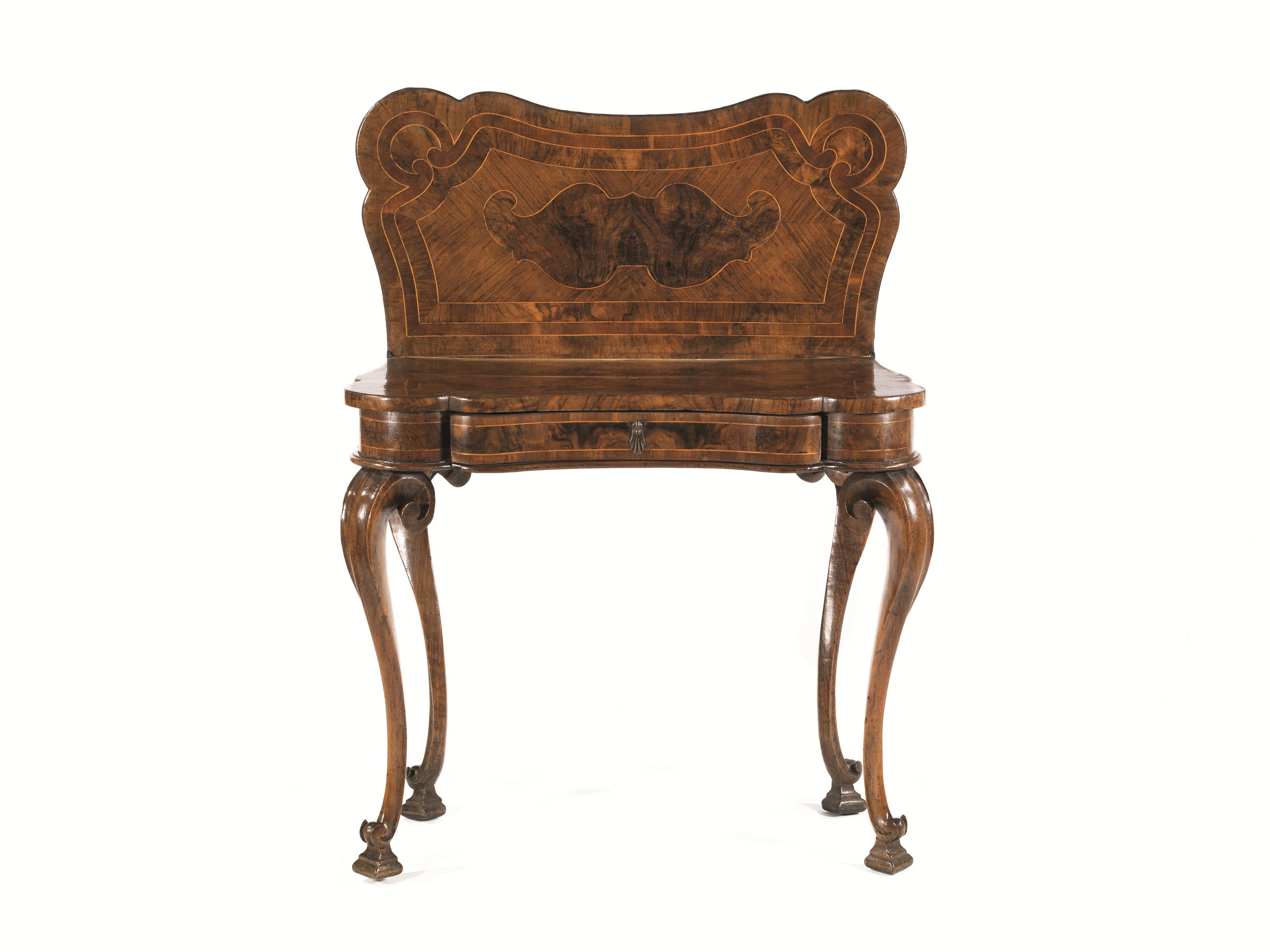 TAVOLINO DA GIOCO, FERRARA, SECOLO XVIIIlastronato in radica di noce, piano...