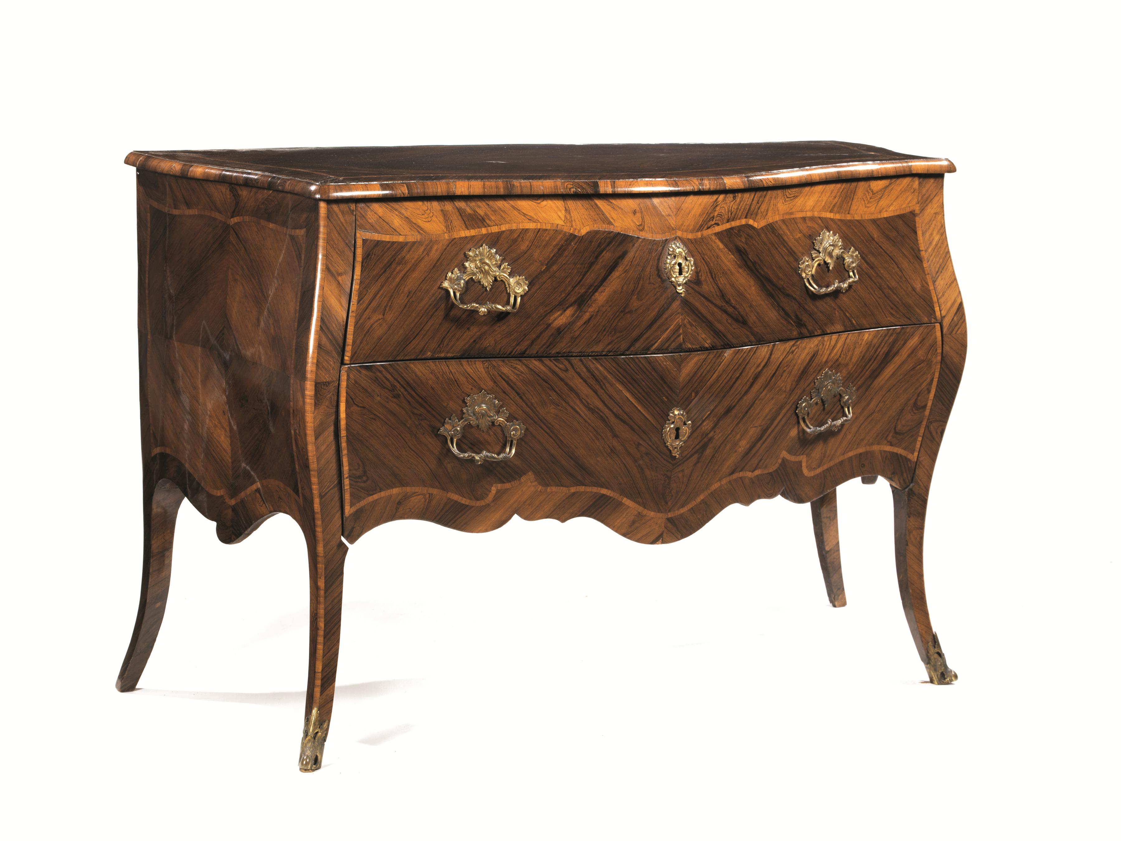 in noce intarsiato in bosso, piano sagomato, fronte mosso decorato con riserva mistilinea e due cassetti con maniglie e bocchette in bronzo dorato, gambe a sciabola con scarpette in bronzo, cm 90x60x135