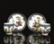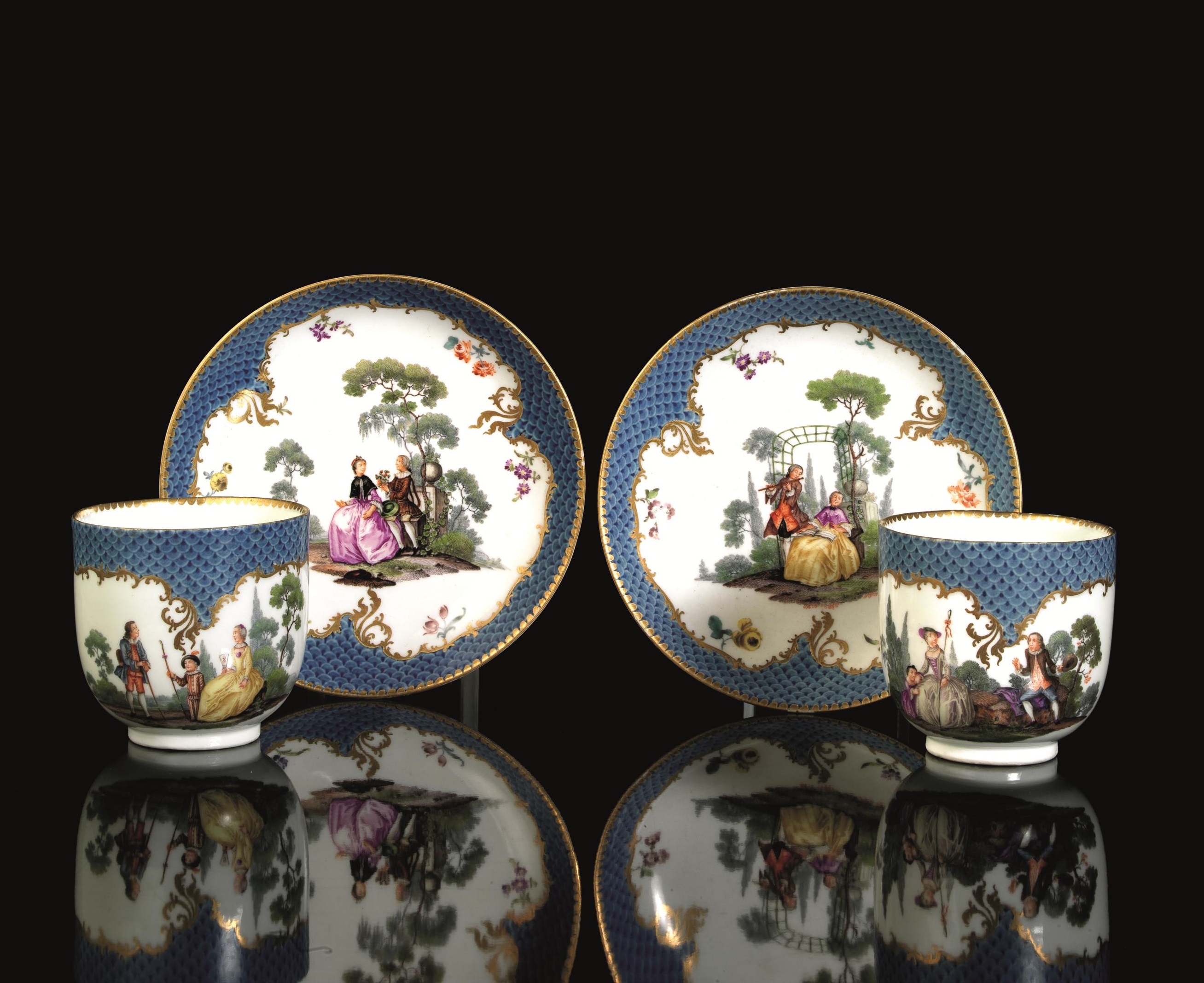 in porcellana dipinta in policromia e oro, decorate con scene galanti incorniciate da motivo a scaglie in azzurro, opera forse del pittore F.E.Meyer. Marca in blu e numero 54 in oro sotto ciascun pezzo, tazzine alt. cm 7, piattini diam. cm 13,3 (4)