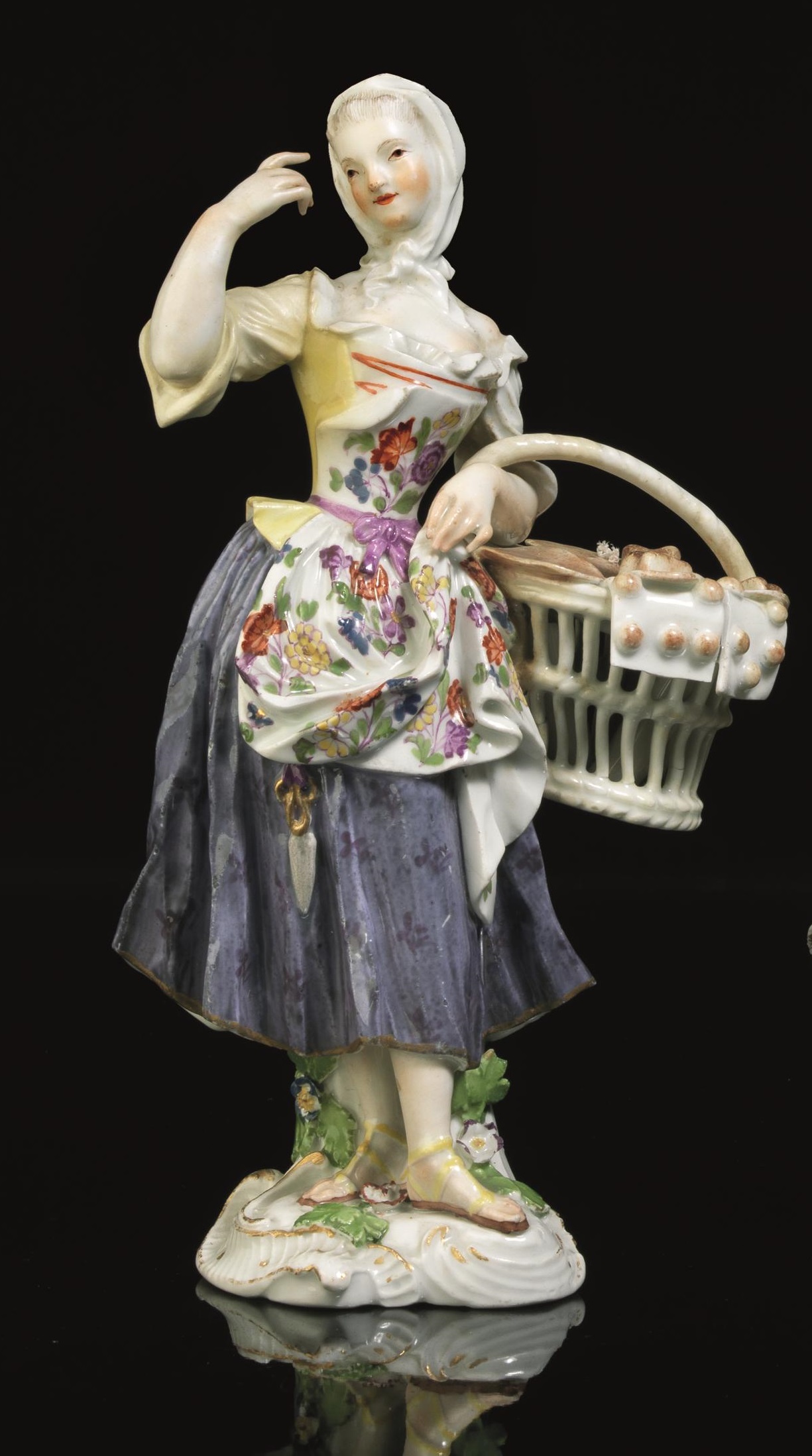 in porcellana dipinta in policromia, raffigurante venditrice di dolci, modellore J.J. Kaendler. Marca in blu sul retro, alt. cm 19,5. Difetti