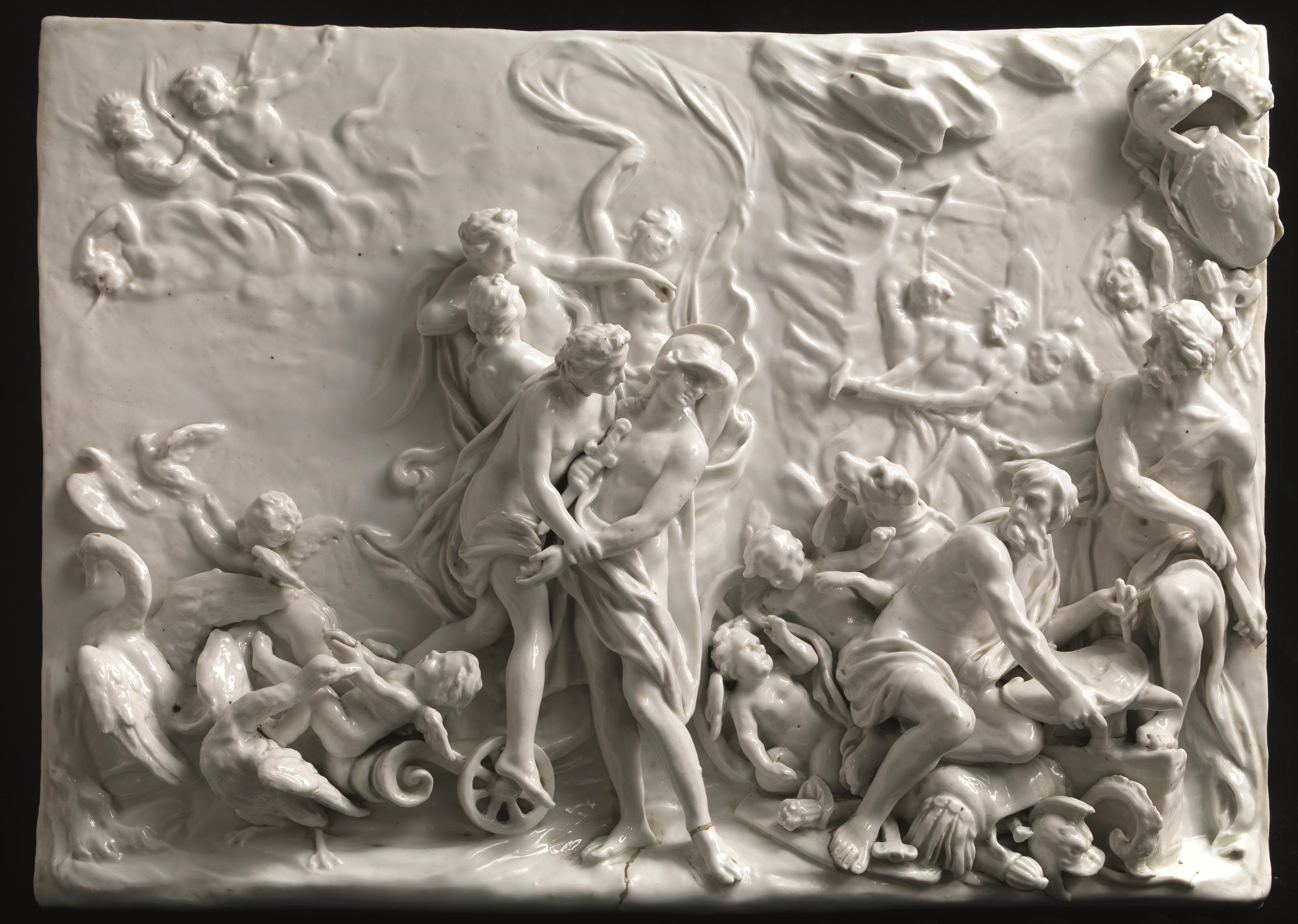 Il rilievo raffigura l’Allegoria dell’Inverno, con Marte e Venere al centro e sulla destra Vulcano all’opera nella sua Fucina. Esso ha come archetipo di derivazione una de Le Stagioni ideate e realizzate dallo scultore bronzista Massimiliano Soldani Benzi nel 1709, su commissione di Ferdinando de’ Medici per omaggiare il cognato, l’Elettore Palatino Johann Wilhelm. I bassorilievi in bronzo sono conservati al Bayerisches Nationalmuseum di Monaco, mentre i modelli in terracotta sono esposti al Museo degli Argenti in Palazzo Pitti (D. Zikos, in La principessa saggia. L’eredità di Anna Maria Luisa de’ medici Elettrice Palatina, catalogo della mostra a cura di S. Casciu, Firenze 2006, pp. 196-198, cat. 48).