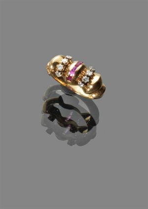 ANELLO Anello in oro giallo con incastonati piccoli rubini taglio baguette e diamanti taglio 8/8 per complessivi ct 0,16 ca Peso gr 5,90 Periodo 1940 Yellow gold ring set with small baguette cut rubies and 8/8 diamonds for a total approx 0.16 ct Weight 5.90 gr period 1940's