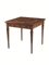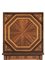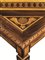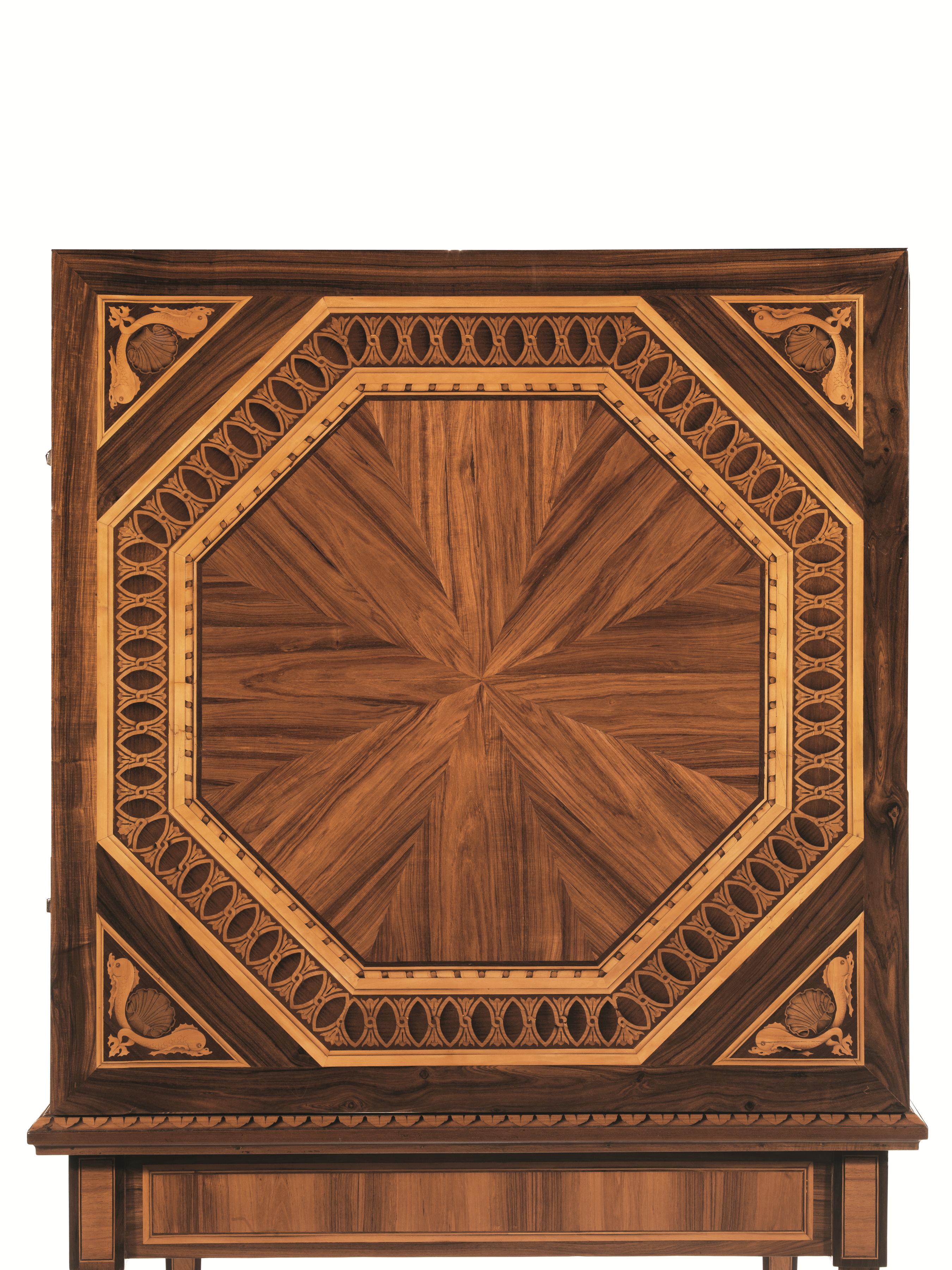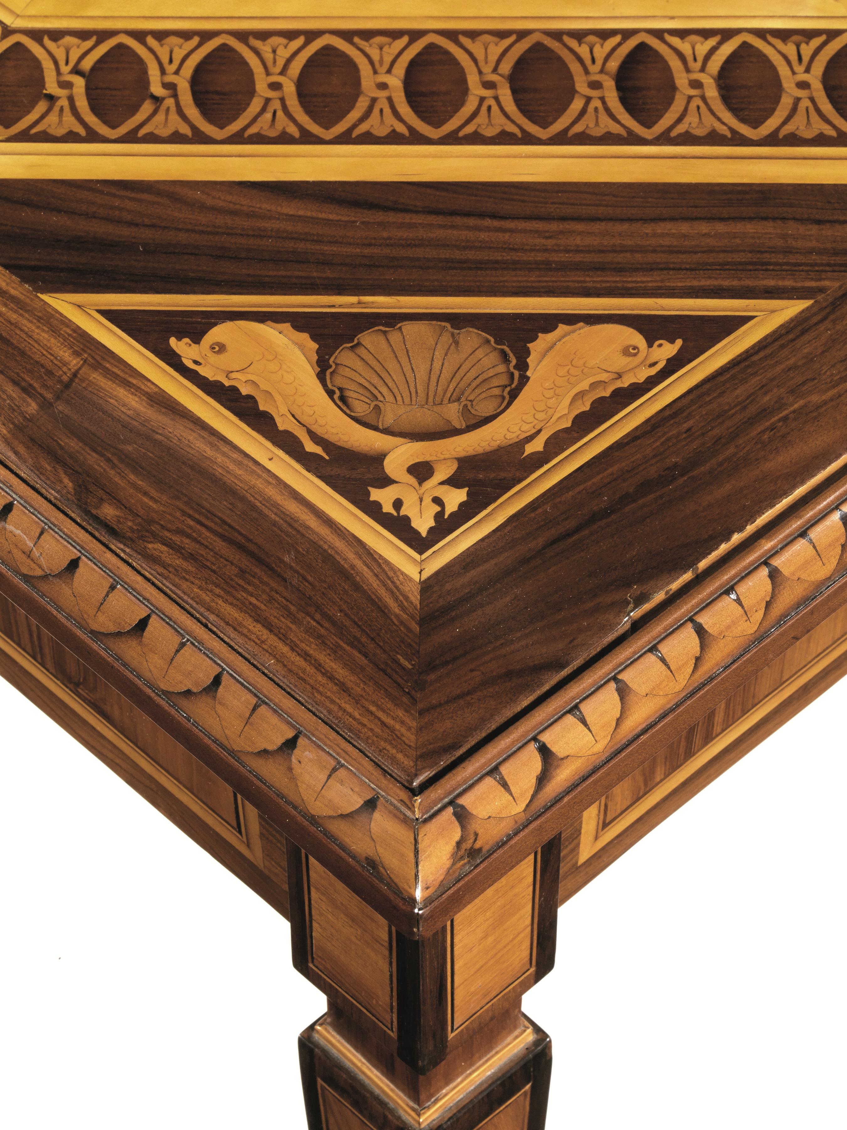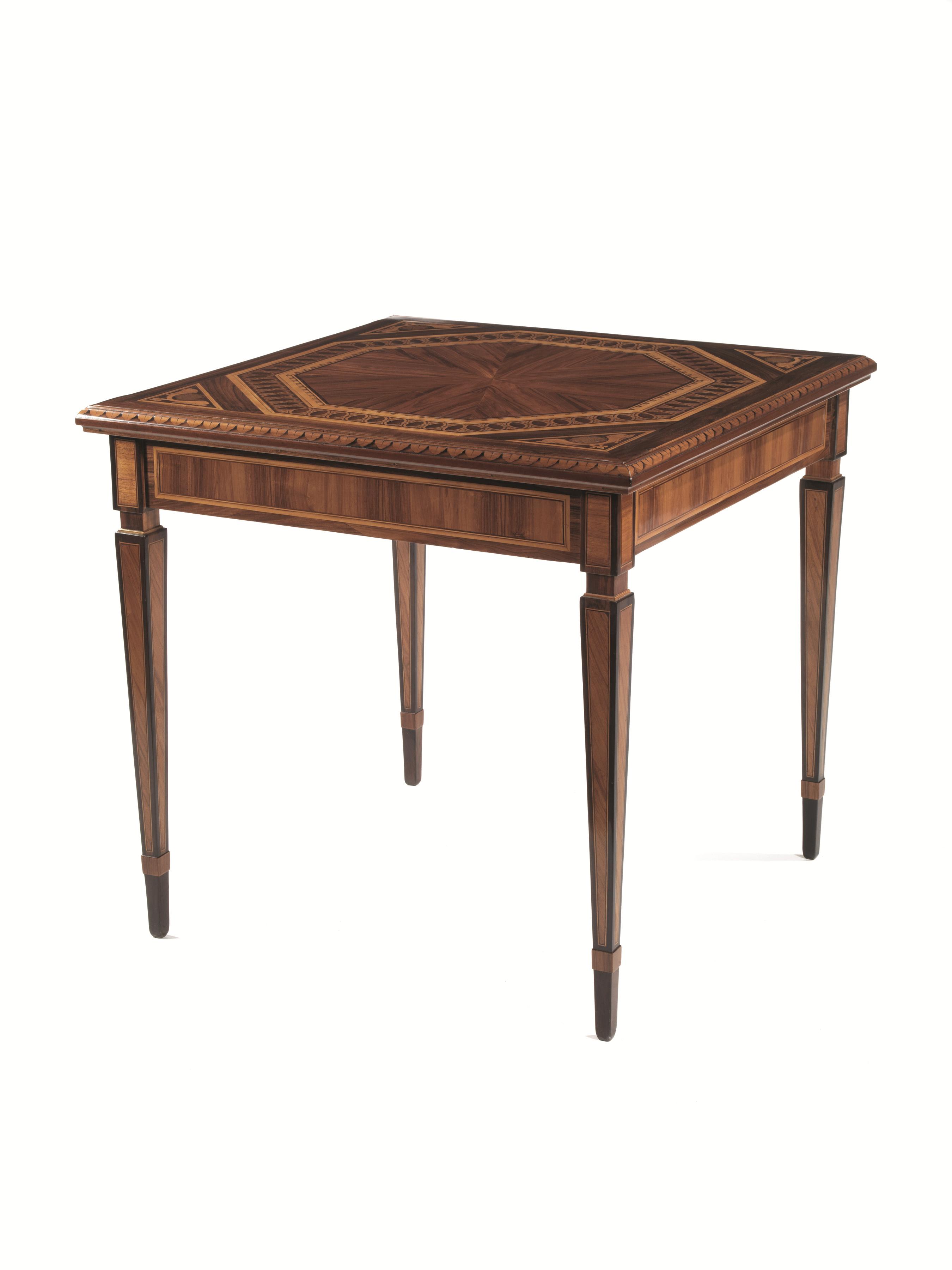 in legno impiallacciato ed intarsiato con ampio medaglione ottagonale bordato da fascia a nastro intrecciato a spirale, a sua volta circoscritto da una fascia decorata con motivi ovoidali entro cornice in legno chiaro. Il piano è decorato agli angoli da delfini dalle code intrecciate affiancanti una conchiglia, ed è sorretto da quattro gambe troncopiramidali con collarino, filettate in legno chiaro; l’interno del tavolo è rivestito in carta coeva, cm 77,7x81,5x81,5