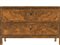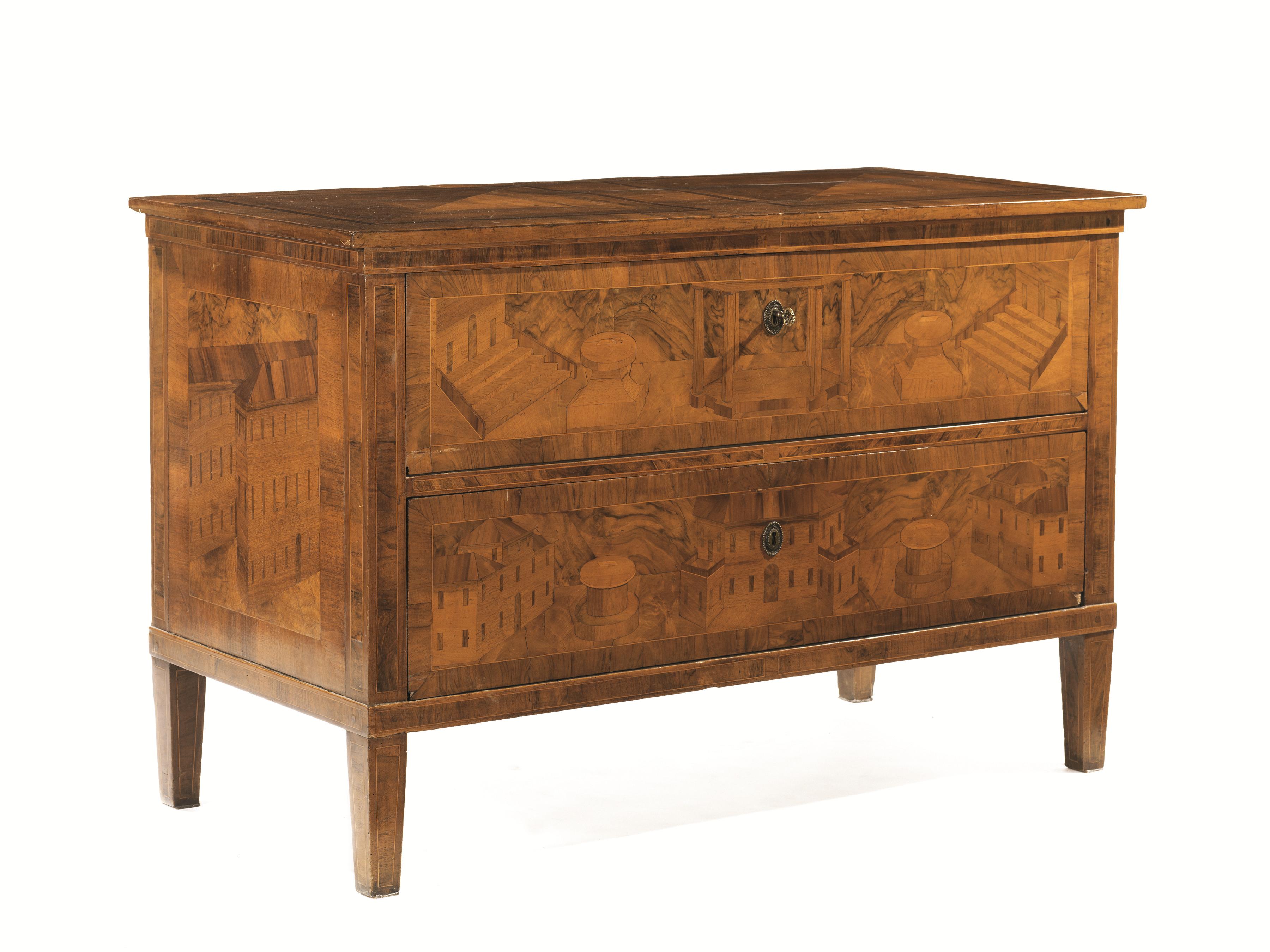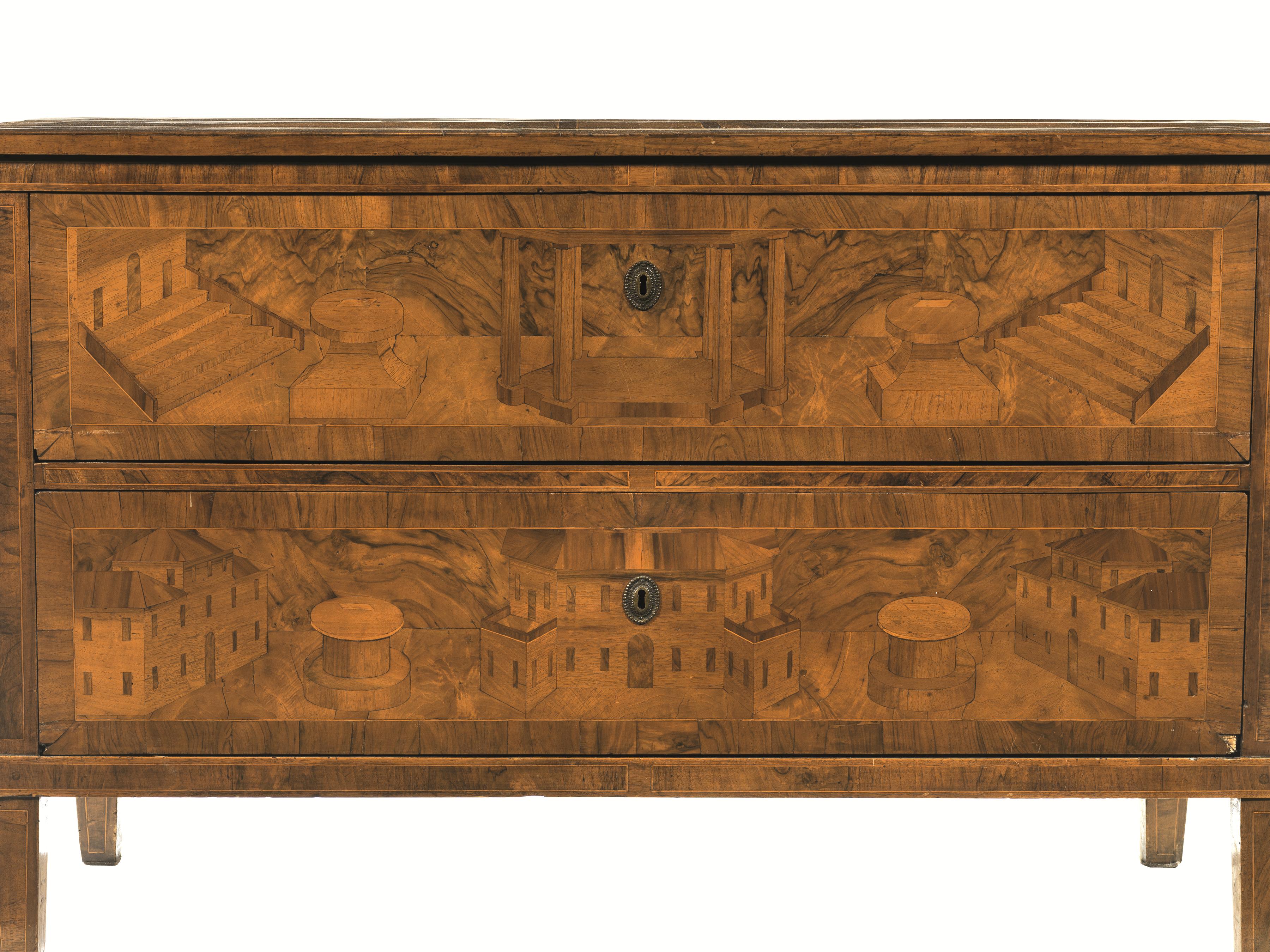 in noce e radica di noce intarsiato e filettato, piano rettangolare, due cassetti sottostanti e fianchi intarsiati con vedute architettoniche, gambe troncopiramidali, cm 87x62,5x138, piccoli danni