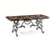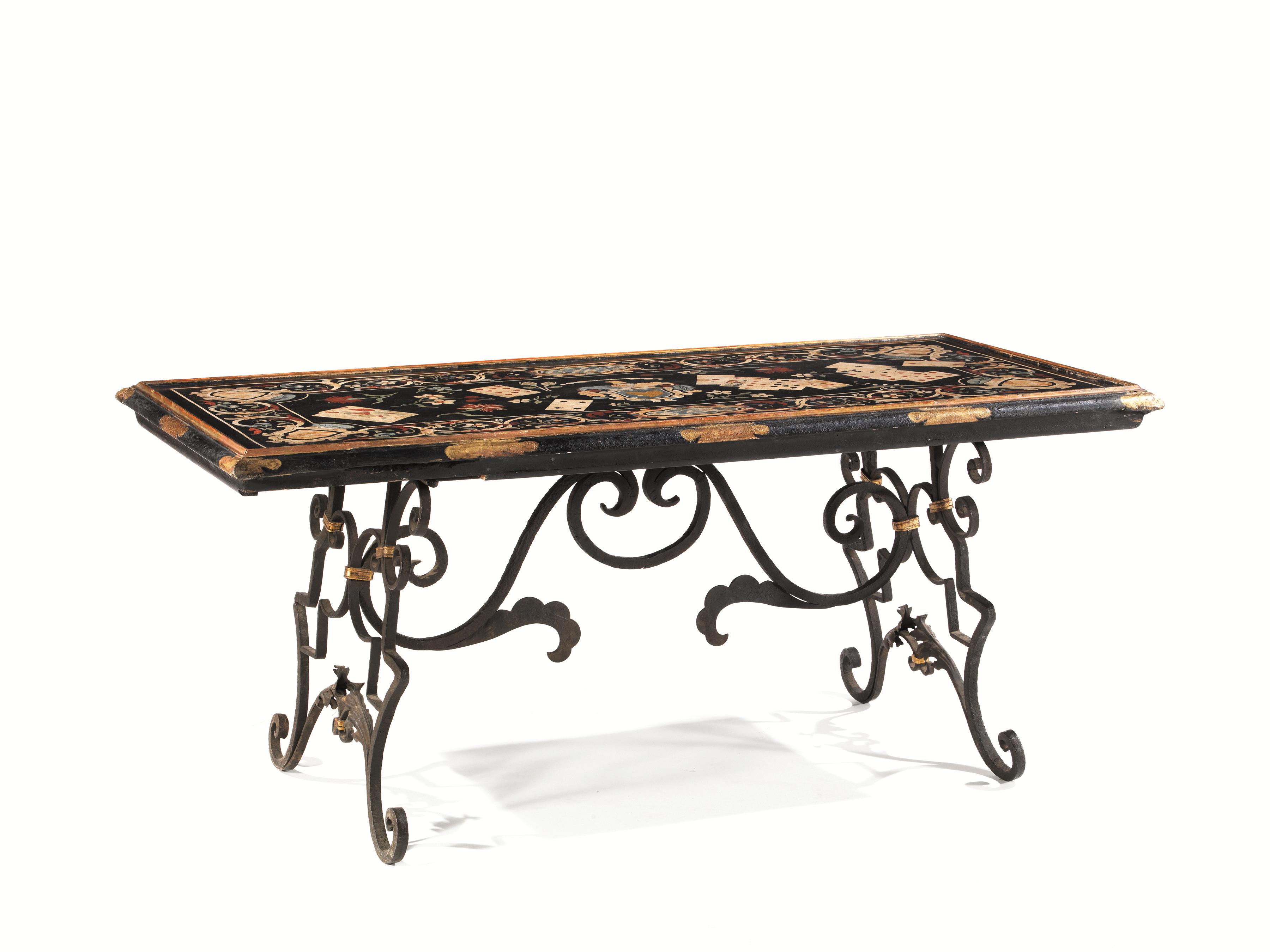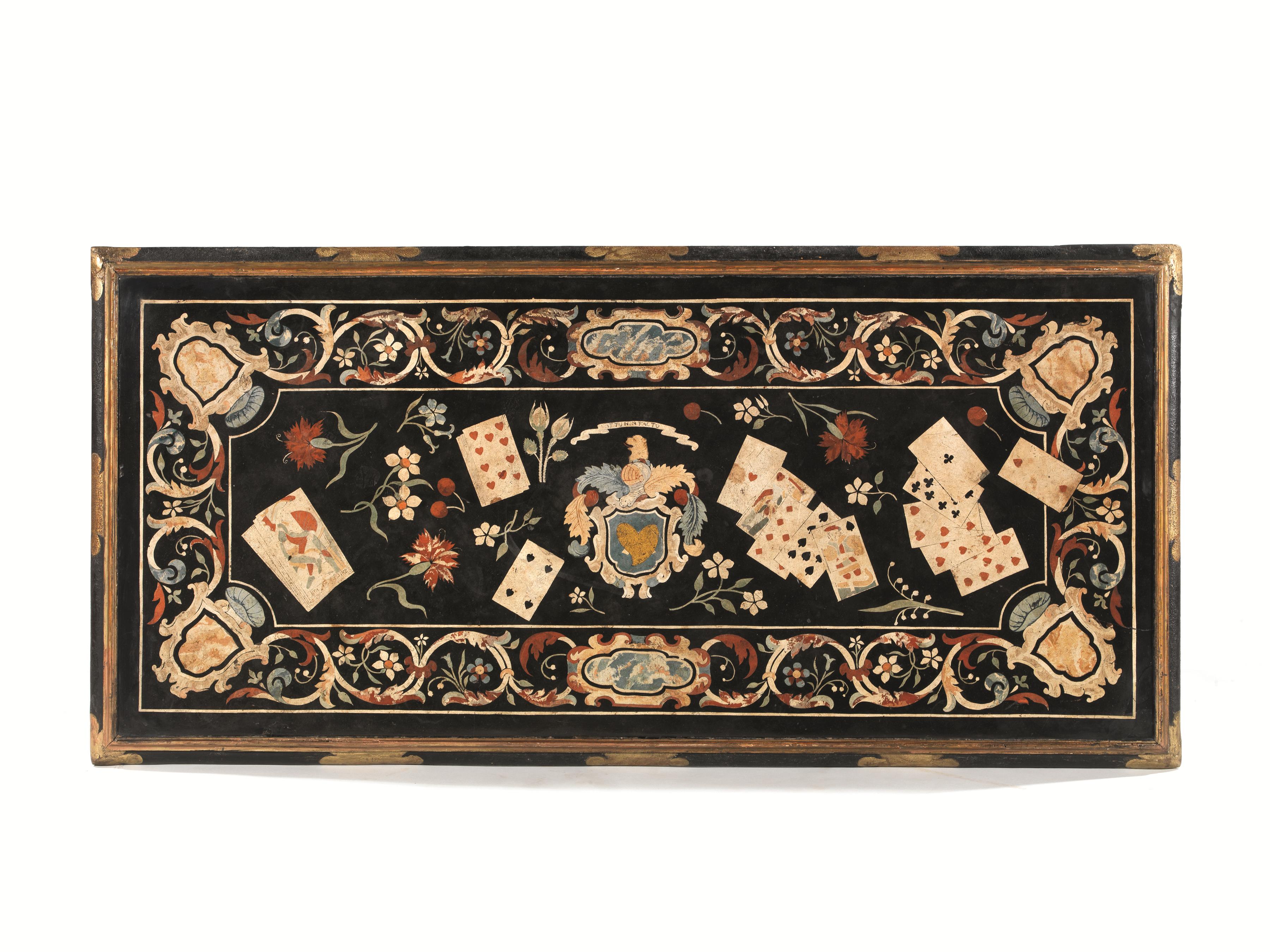decorato in policromia con cartelle barocche alternate a girali vegetali, agli angoli sono presenti motivi a scudo, il riquadro centrale è decorato con carte da gioco alternate a garofani selvatici, rose ed altri fiori, al centro stemma con cartiglio recante iscrizione "Fatto non facto”. Il piano è inserito all'interno di una cornice in legno ebanizzato e dorato, montato su base moderna in ferro battuto con decori a volute, cm 64x131, piccoli restauri