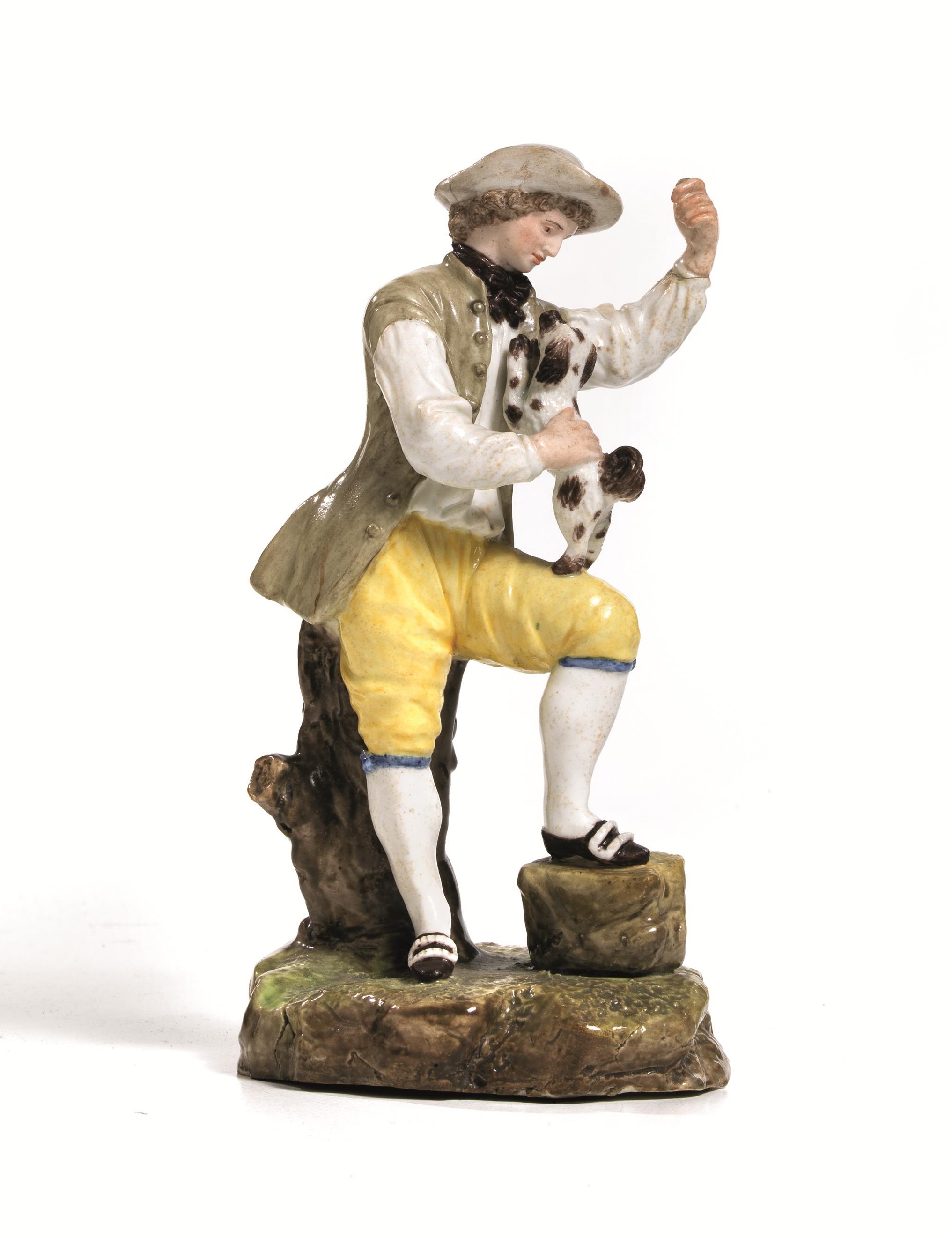 in porcellana dipinta in policromia raffigurante Giovane con cane, alt. cm 18. Restauro alla mano sinistra