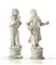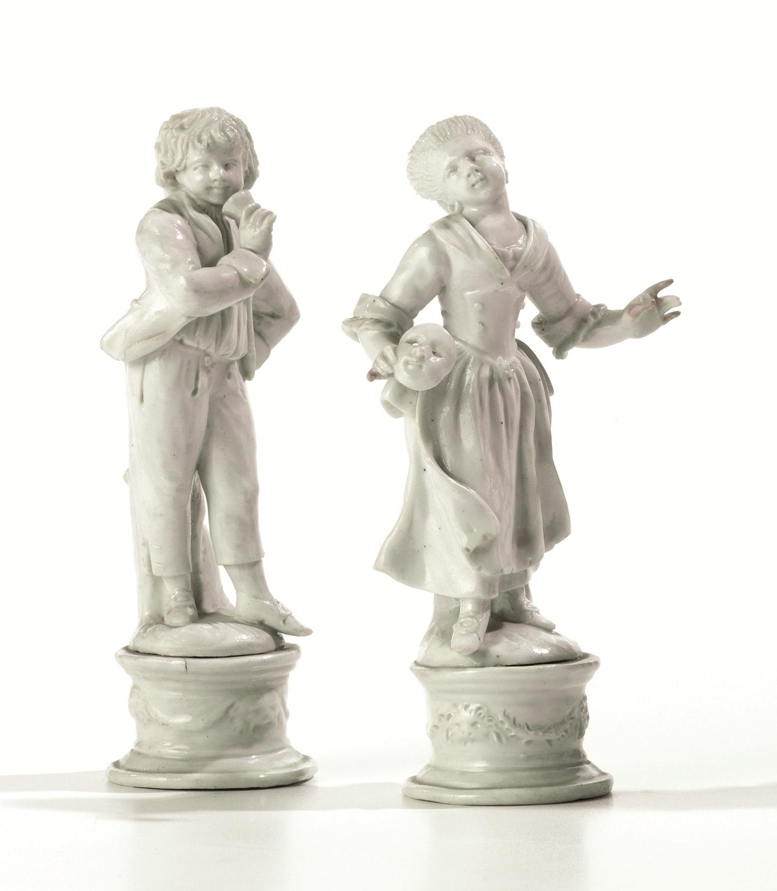 in porcellana bianca raffigurante fanciullo con bicchiere e fanciulla con maschera su base cilindrica decorata con festoni a rilievo, alt. cm 13,5. Difetti