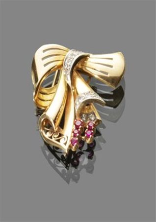SPILLA Spilla in oro giallo e inserti in oro bianco con pietre sintetiche Peso gr 15,30 Periodo 1940 yellow and white gold brooch with lab created stones. Weight 15.30 gr period 1940's