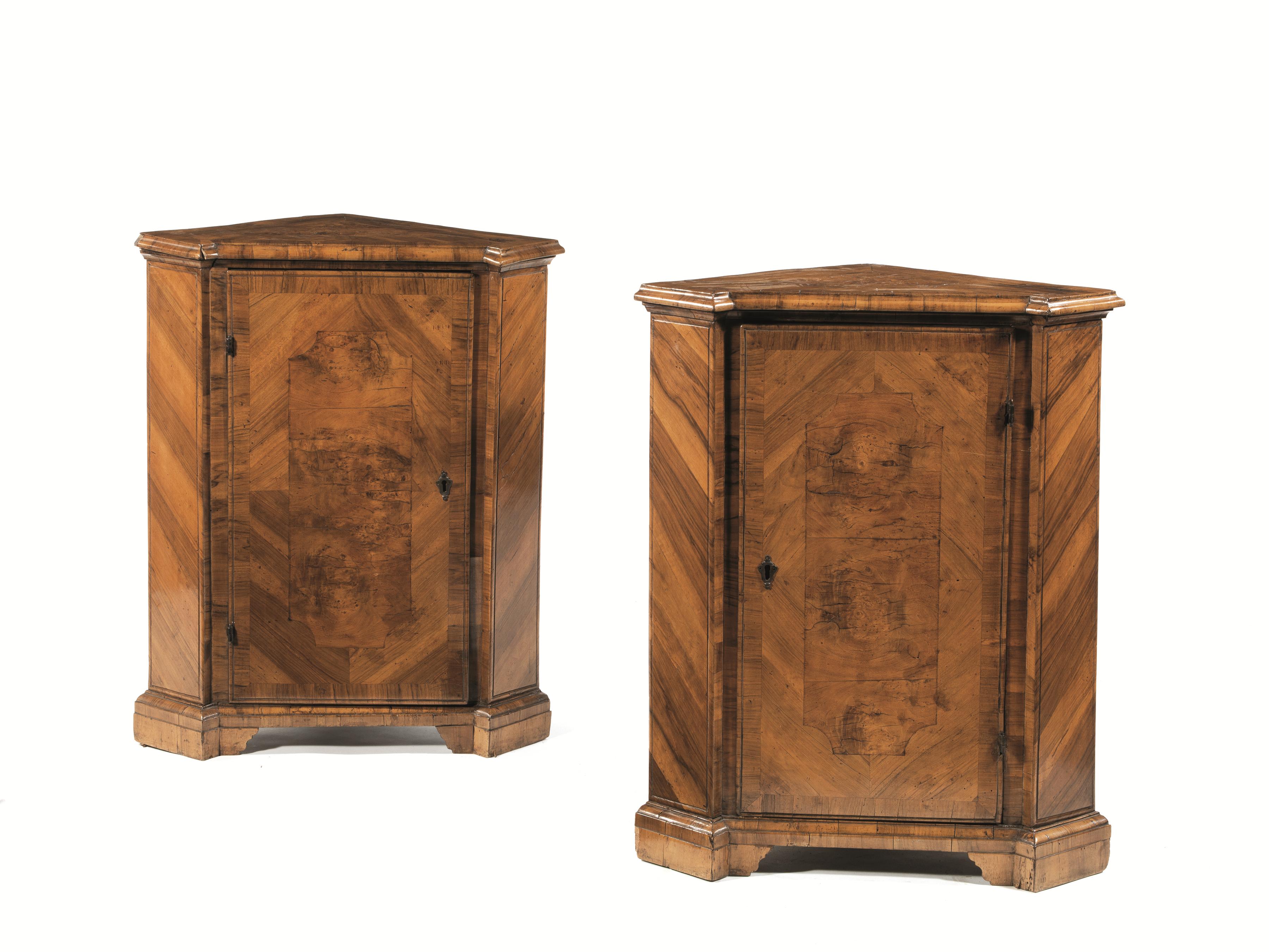 COPPIA DI ANGOLIERE, VENETO, SECOLO XVIIIlastronate in noce e radica di noce,...