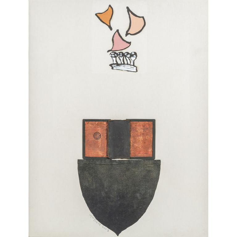 oil aquatint fabric and book cover on canvas 31 49x23 62 in