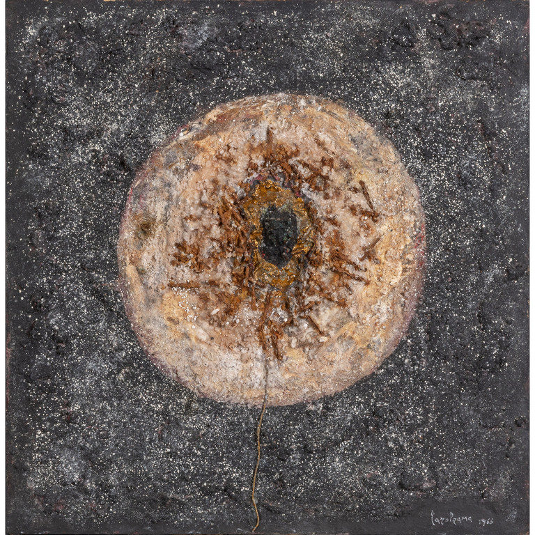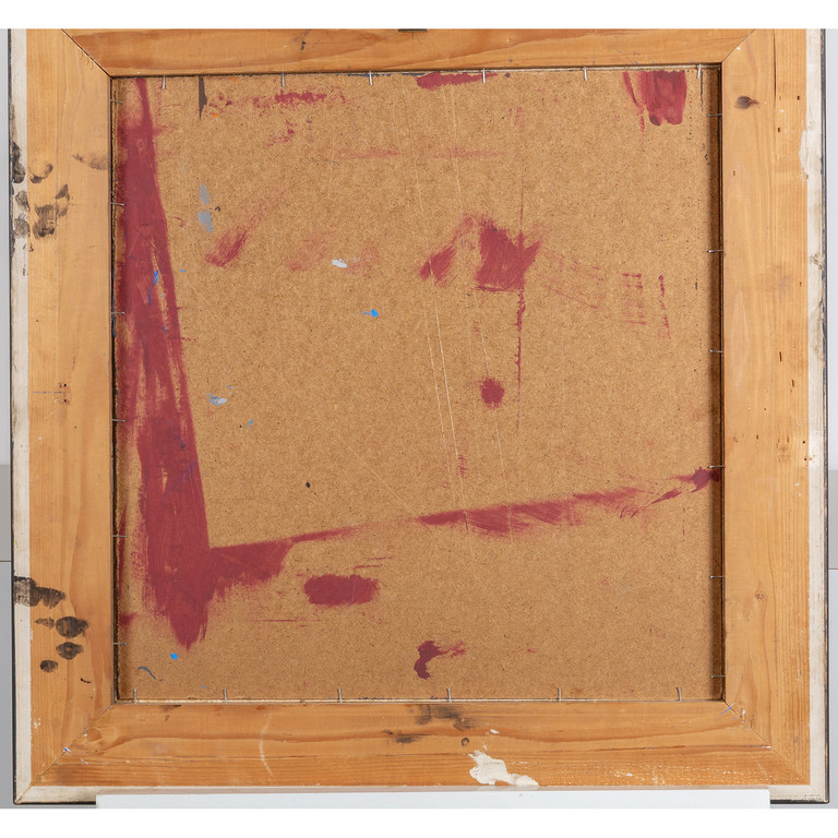 tecnica mista e inclusioni varie su tela su cartone cm 37 5x37 5