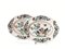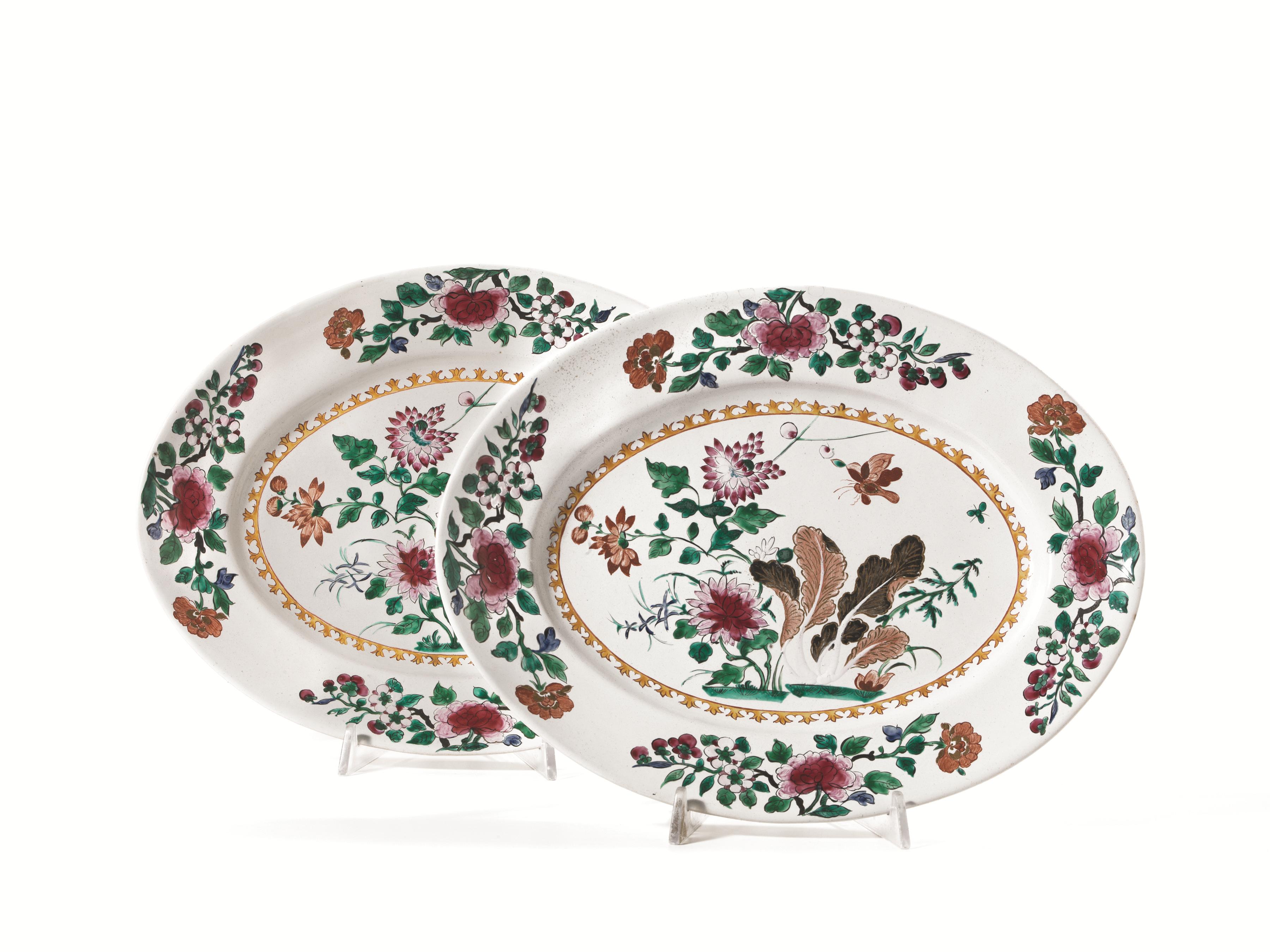 in maiolica, di forma ovale, foggiati a stampo con ampio cavetto e tesa larga appena rialzata su fondo piano. Il decoro in policromia a terzo fuoco nei toni del giallo, ocra, rosso, azzurro, verde rosa in due toni, porpora, bruno-nero e oro si presenta di ispirazione orientale accompagnata da una decorazione a fregio a frecce di Meissen che incornicia il cavetto, cm 26x33,5 (2)