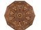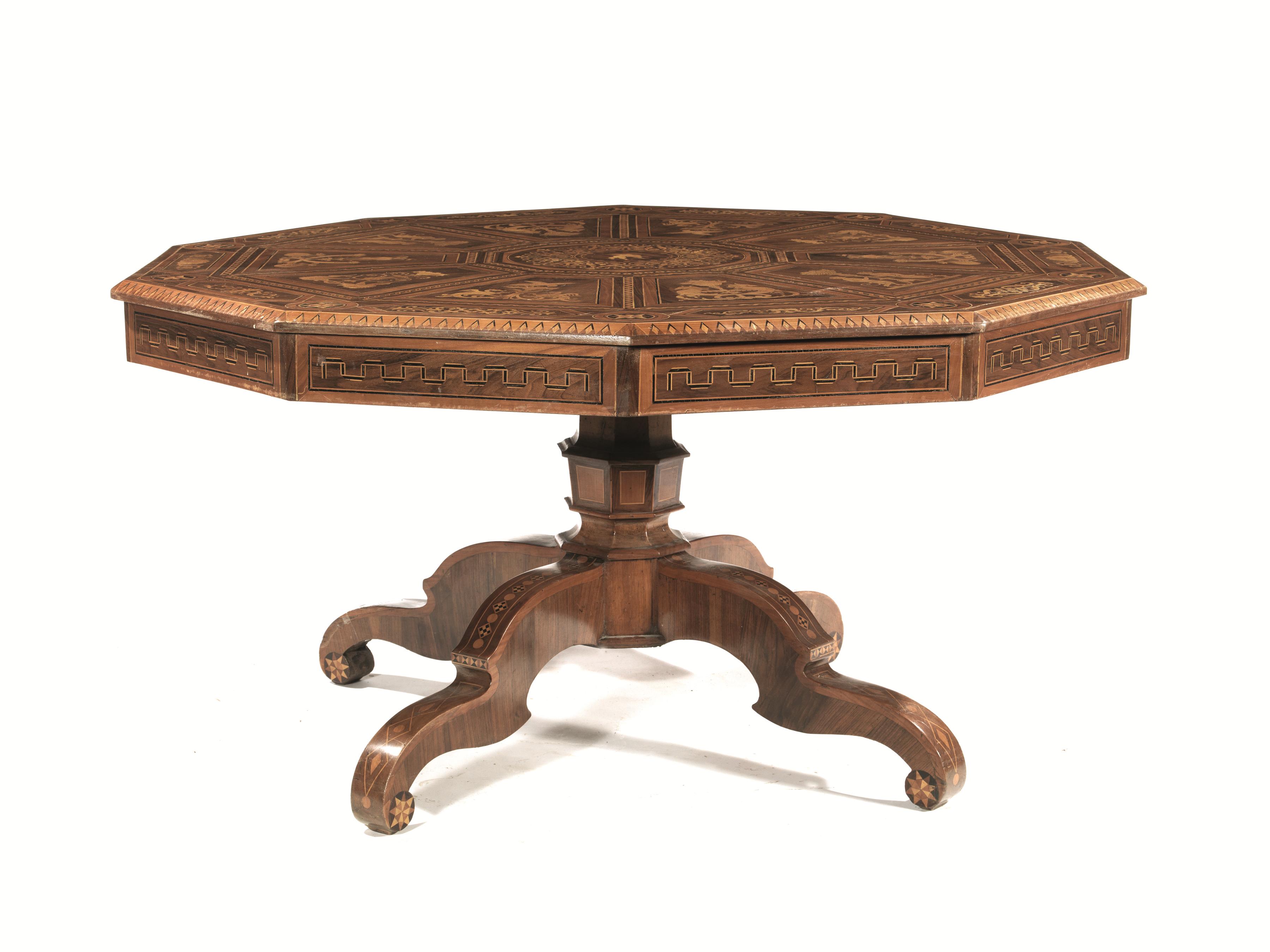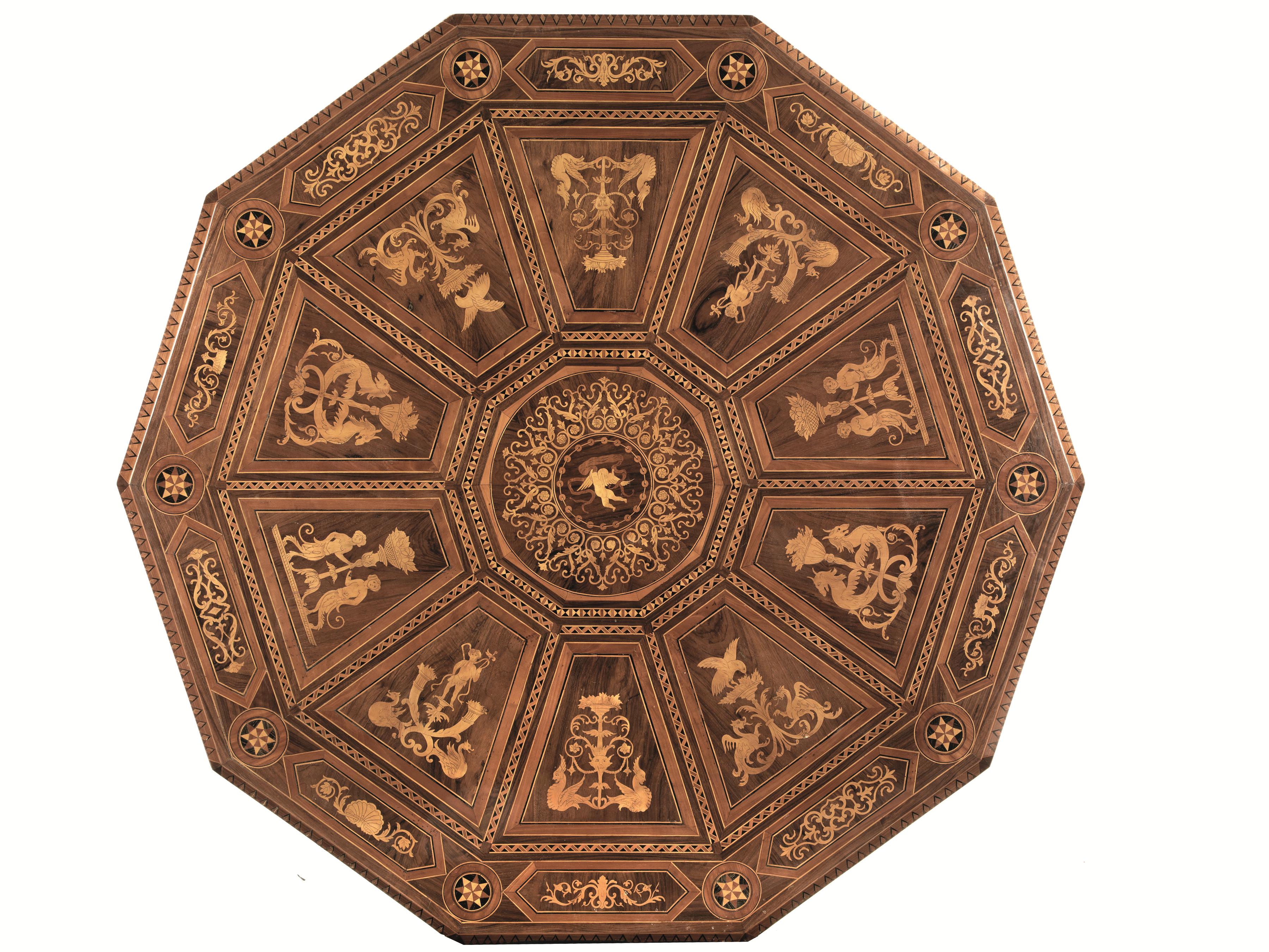 in noce e radica intarsiati, piano decagonale centrato da amorino in volo tra volute, riquadri geometrici con figure antropomorfe e animali, fascia decorata con motivo a meandro, fusto a balaustro su quattro gambe sagomate e intarsiate con motivi geometrici, piedi a ricciolo, diam. cm 154, alt. cm 80