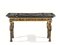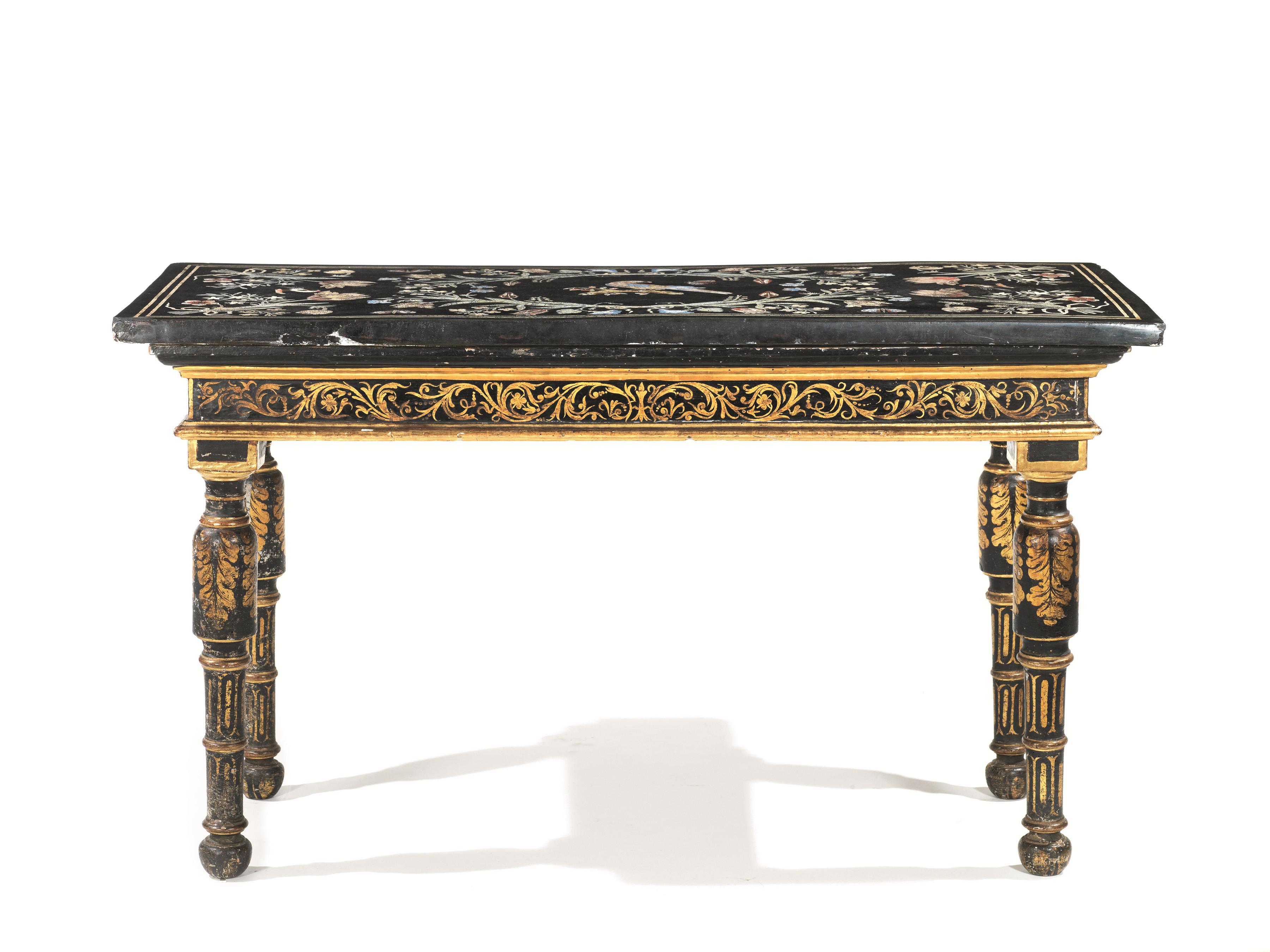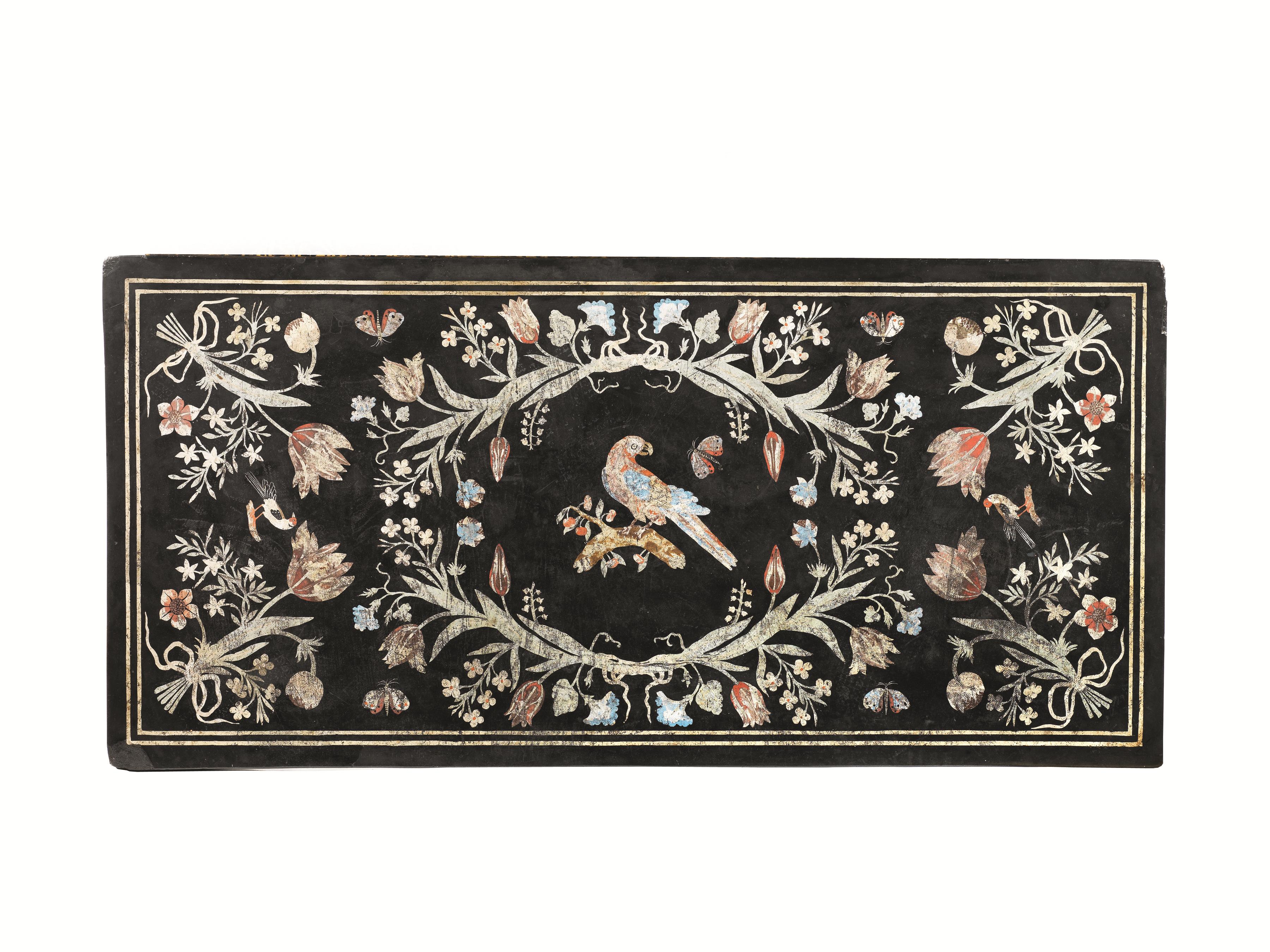 di forma rettangolare decorato con pappagallo, volatili e farfalle entro tralci vegetali e mazzetti di fiori, su base non pertinente in legno ebanizzato e dipinto in oro con motivo a girali vegetali nella fascia, gambe tornite a balaustro decorate in oro con palmetta di acanto e falsa baccellatura, piedi a cipolla, cm 81x67x140, difetti