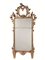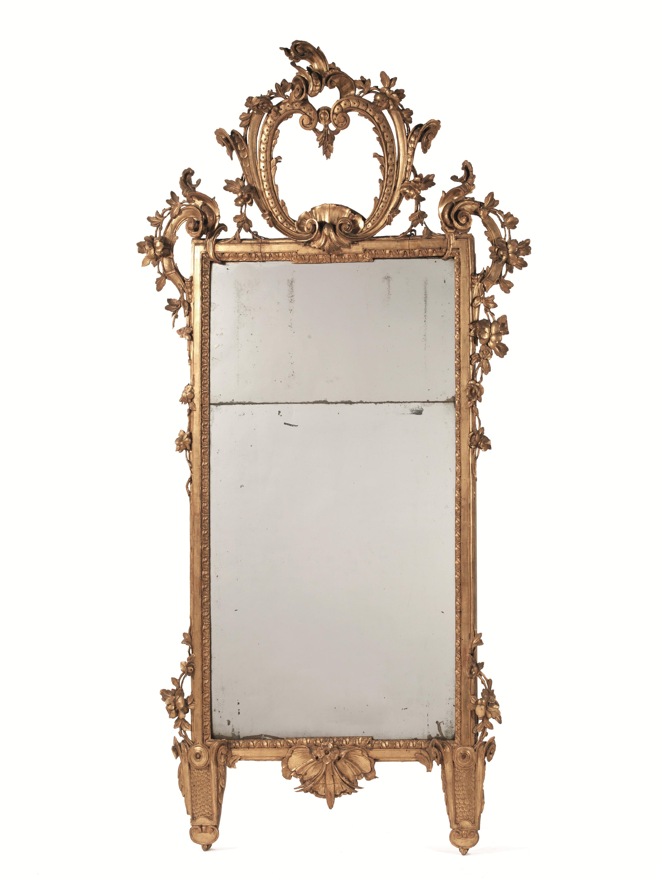 in legno intagliato e dorato, alta cimasa traforata a formare uno scudo con volute contrapposte, elegante fregio di fiori e foglie ricadente lungo i bordi, cornice rettangolare intagliata a motivi fogliacei, piedi a mensoloni con decoro a scaglie, cm 225x120, piccoli danni e mancanze
