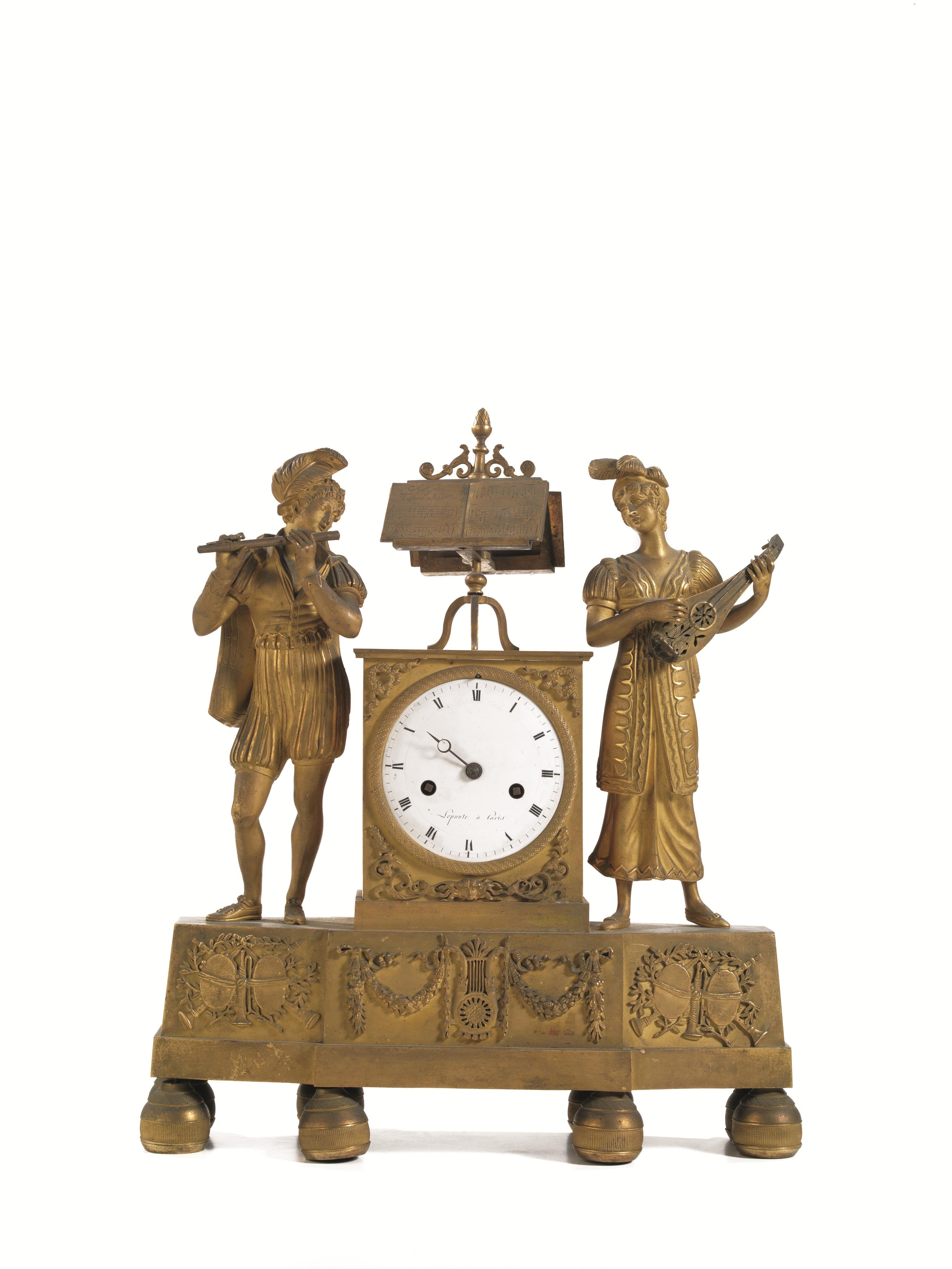 in bronzo dorato, cassa sormontata da spartito musicale e affiancata da suonatore di flauto e suonatrice di mandola a tutto tondo, quadrante in smalto con numeri romani firmato Leponte à Paris, base rettangolare sagomata poggiante su quattro piedini, meccanismo siglato MN, alt. cm 41, meccanismo da revisionare e mancante di una lancetta