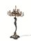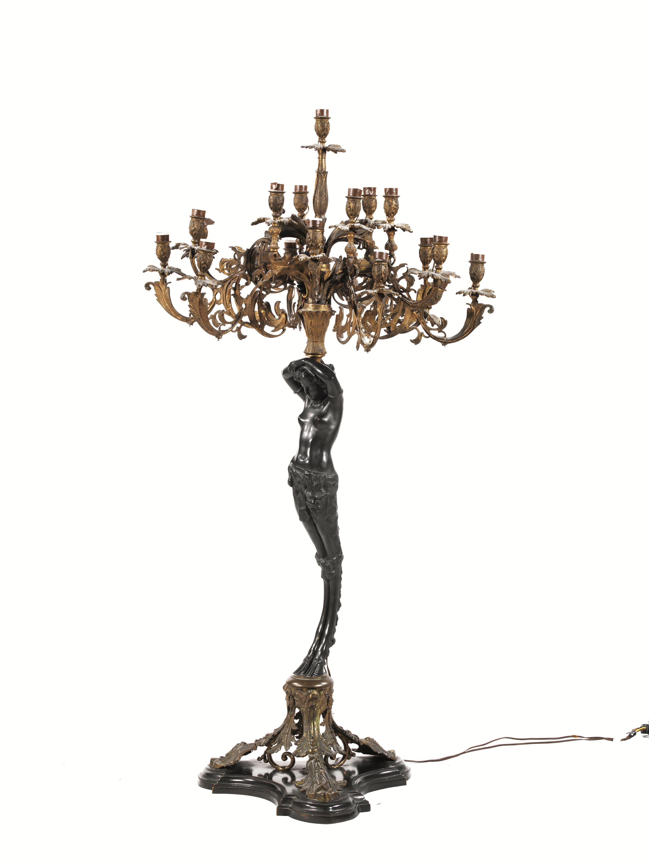 in bronzo patinato e parzialmente dorato, fusto modellato come un satiro, base tripode con volute, alt. cm 148 (completo di base in legno, alt. cm 83)