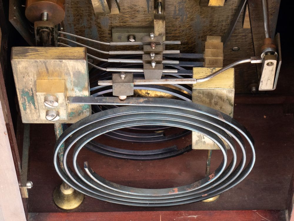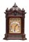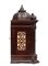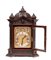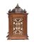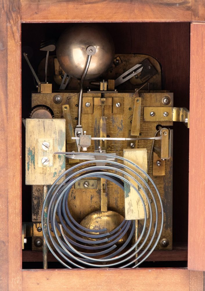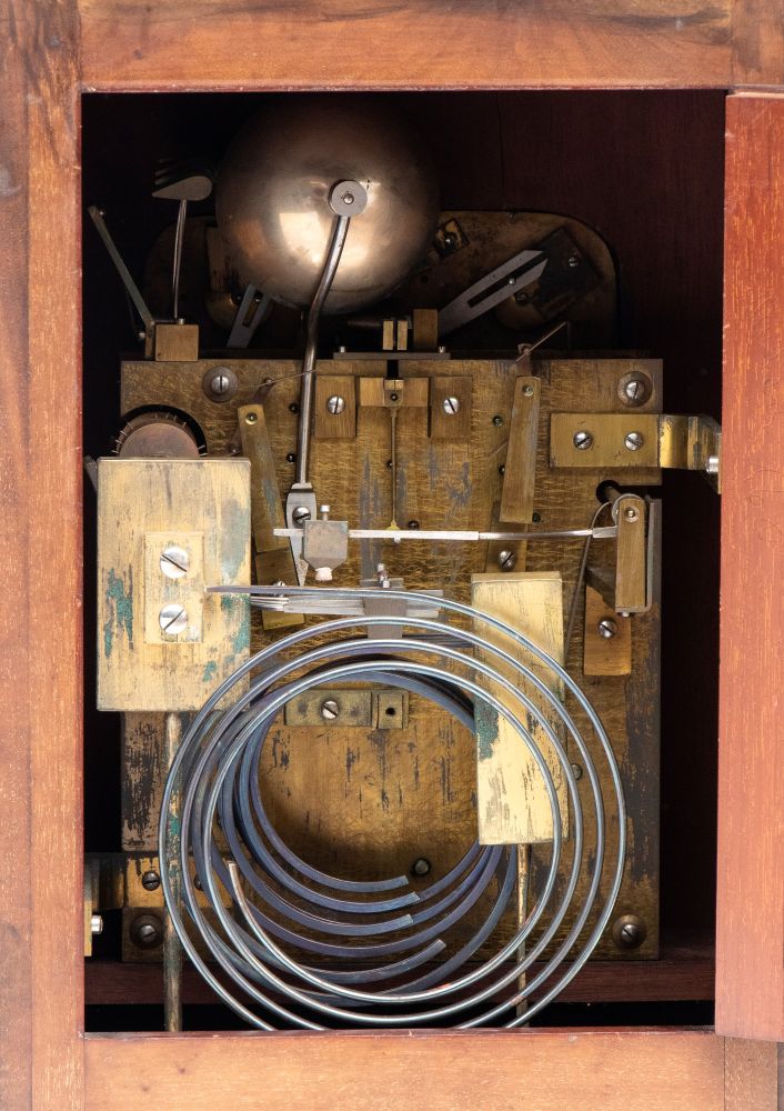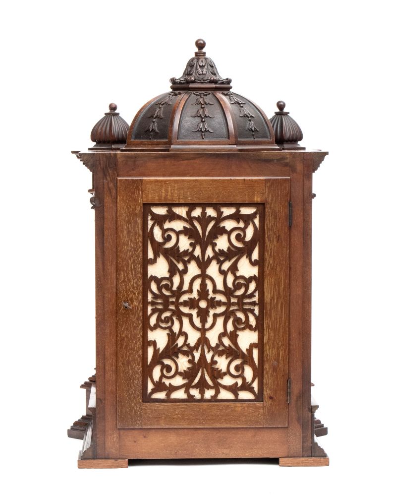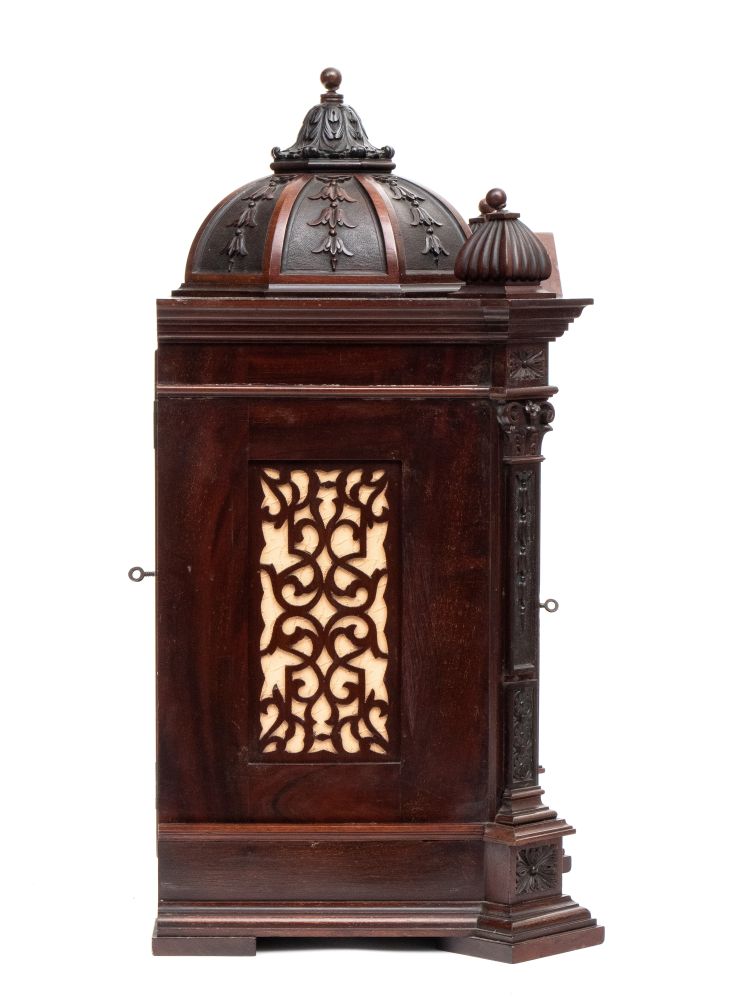 importante orologio da mensola in legno di mogano, riccamente scolpito e cesellato, con cassa architettonica sormontata da cupola a bulbo e pinnacoli laterali. Pannelli decorati con motivi fogliacei e riserve modanate. Quadrante in ottone dorato inciso a motivi vegetali, con numeri romani e lancette traforate; tre quadranti secondari per la regolazione delle suonerie. Firmato "Goldsmiths & Silversmiths Company, 112 Regent Street, London".