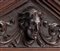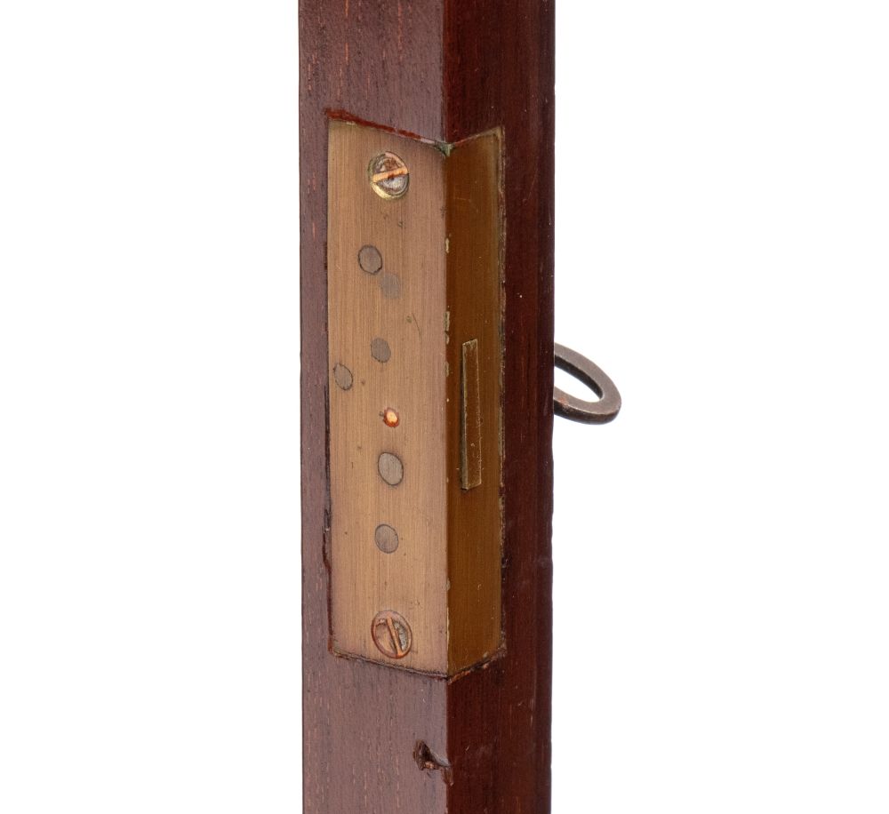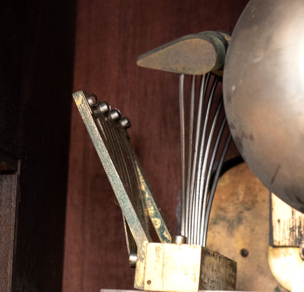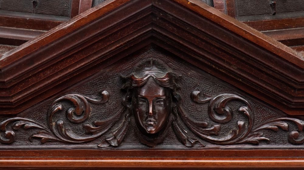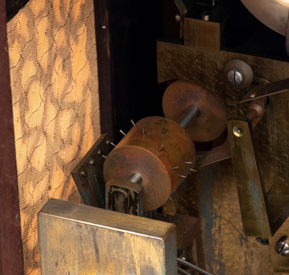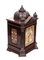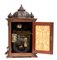 importante orologio da mensola in legno di mogano, riccamente scolpito e cesellato, con cassa architettonica sormontata da cupola a bulbo e pinnacoli laterali. Pannelli decorati con motivi fogliacei e riserve modanate. Quadrante in ottone dorato inciso a motivi vegetali, con numeri romani e lancette traforate; tre quadranti secondari per la regolazione delle suonerie. Firmato "Goldsmiths & Silversmiths Company, 112 Regent Street, London".
