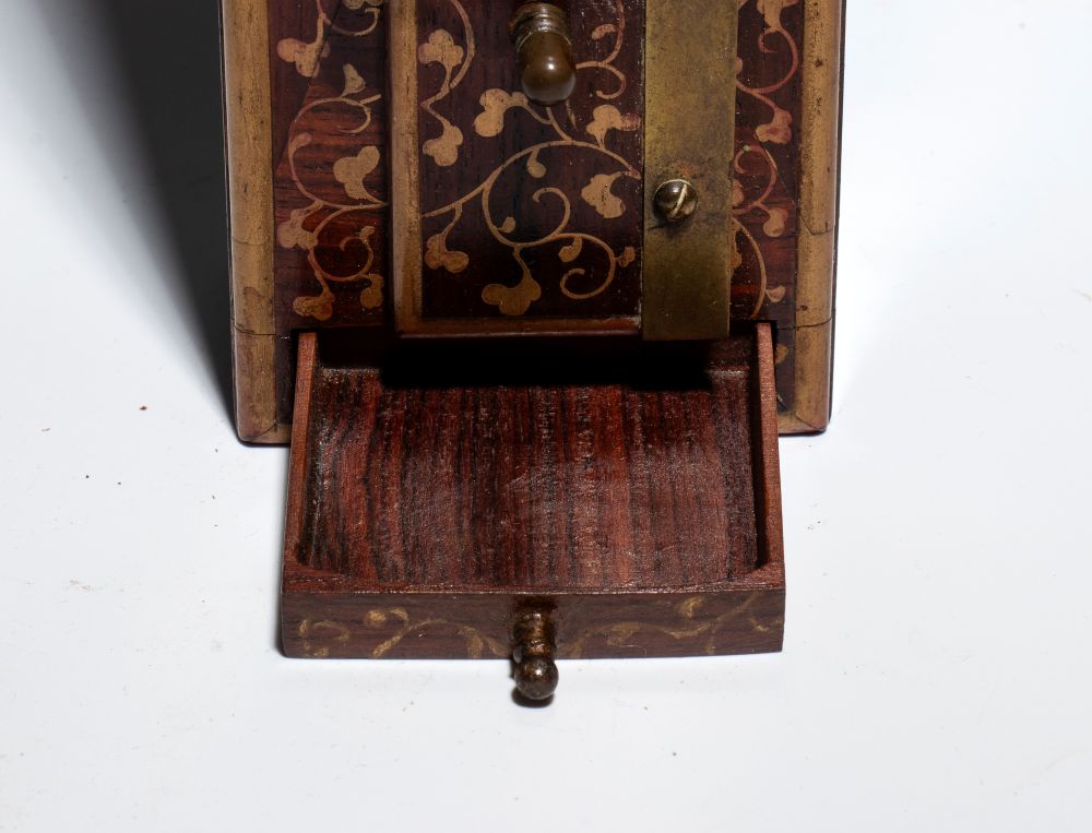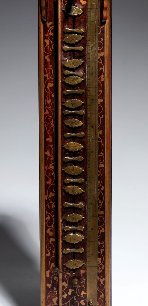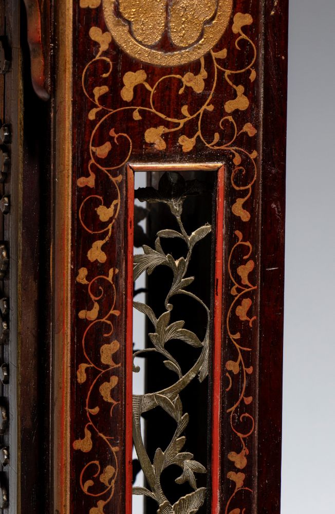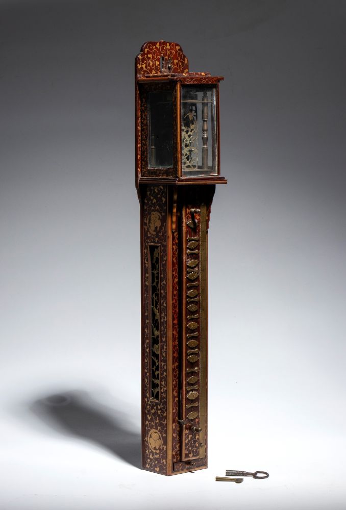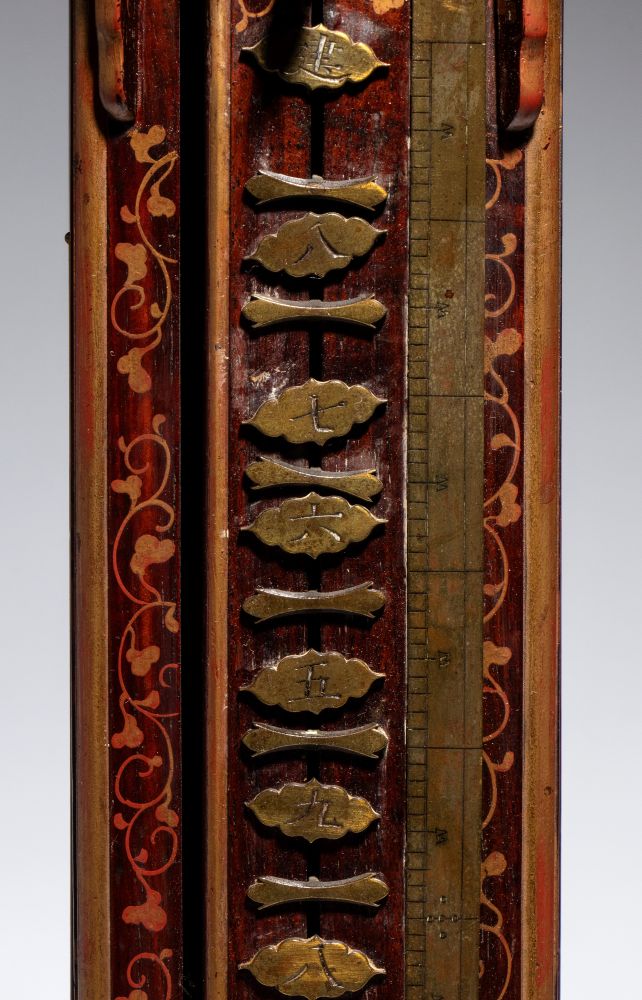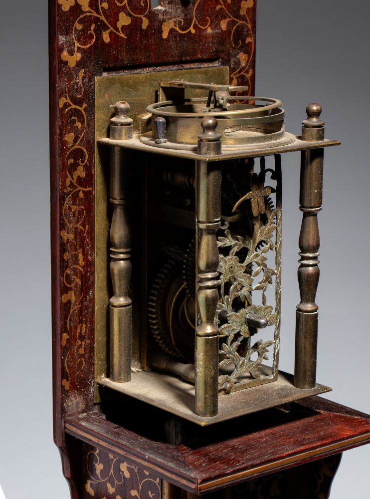 La parte superiore, protetta da una teca, presenta decorazioni in ottone finemente traforate, che lasciano intravedere il movimento meccanico. Il corpo slanciato è realizzato in legno, che mette in risalto l'ottone delle placchette. Alla base, un piccolo cassetto segreto custodisce la chiave. Pensato per essere appeso, a differenza degli orologi occidentali dell'epoca, questo orologio non utilizza un quadrante circolare ma il tempo scorre verticalmente: una lancetta, fissata al peso che scende nel tronco, segna le ore lungo la scala di placchette. Questo sistema permetteva di regolare la durata delle ore tra il giorno e la notte, adattandosi ai mutamenti della luce solare durante l'anno.