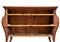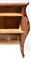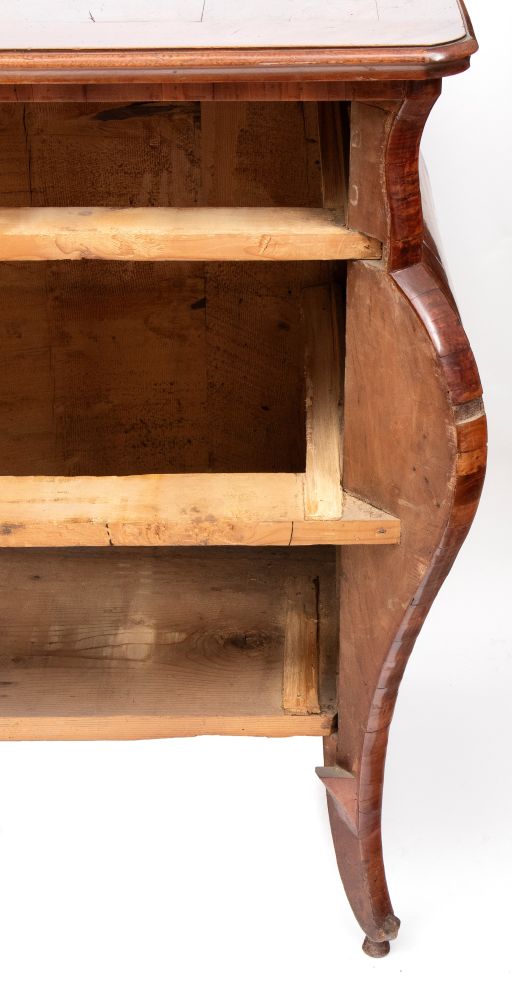 a fronte mosso di linea barocchetta, lastronato in radica di noce posta a motivi speculari. Piano sagomato, fascia sotto piano con cassetto, corpo bombato e grembiule mistilineo, poggiante su gambe mosse.