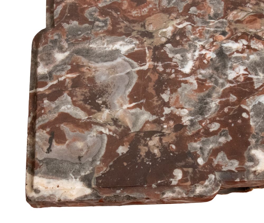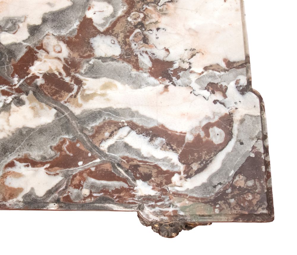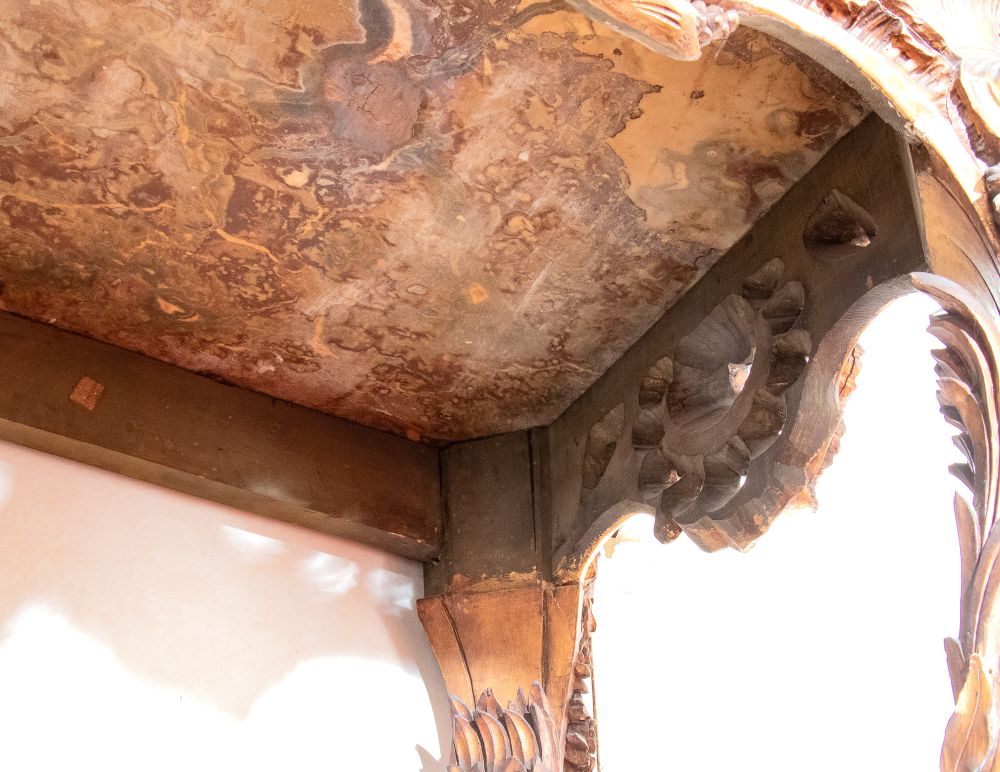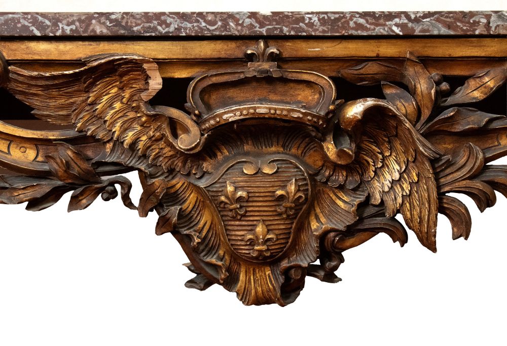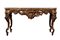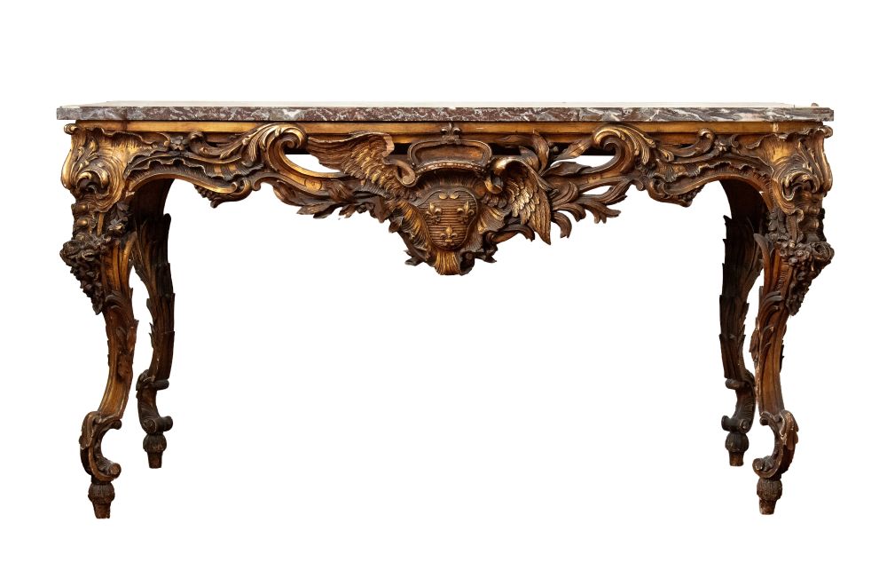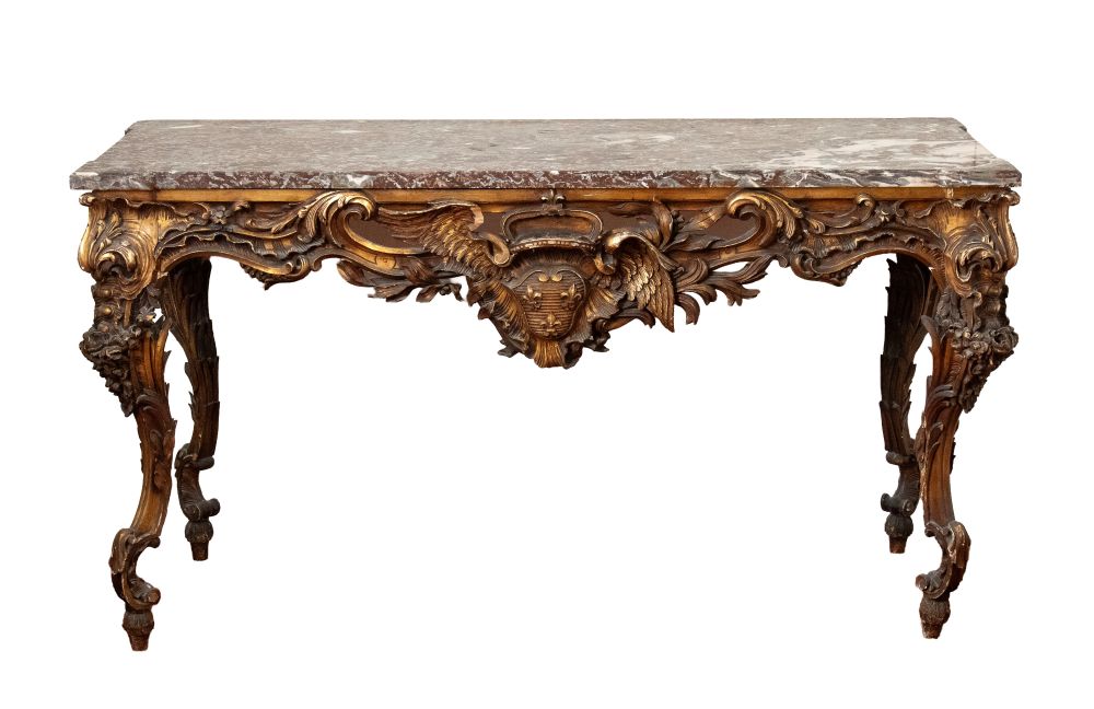 caratterizzate da struttura mossa con gambe fortemente sinuose e ricca decorazione rocaille. Fronte centrato da importante cartiglio con stemma araldico sormontato da corona e aquila ad ali spiegate, affiancato da volute e motivi vegetali. Fascia sotto piano traforata e movimentata. Piano in marmo sagomato coevo.
