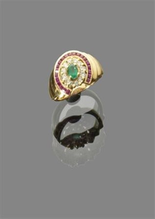 ANELLO Anello in oro giallo con smeraldo,diamantini taglio brillante e rubini...