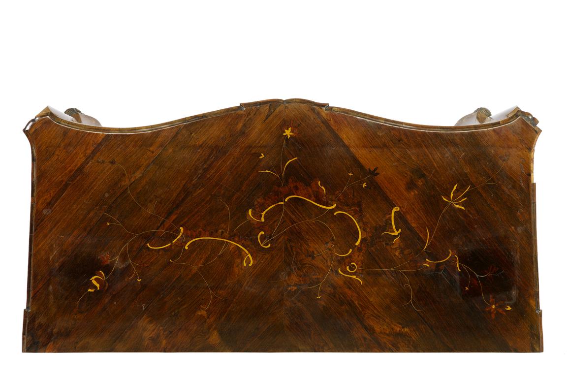 in palissandro e bois de rose, piano sagomato con becco di civetta, fronte e fianchi mossi, due cassetti sotto al piano e altri due sottostanti, gambe a zoccolo stilizzato, cm 137x65x92 (2)
