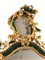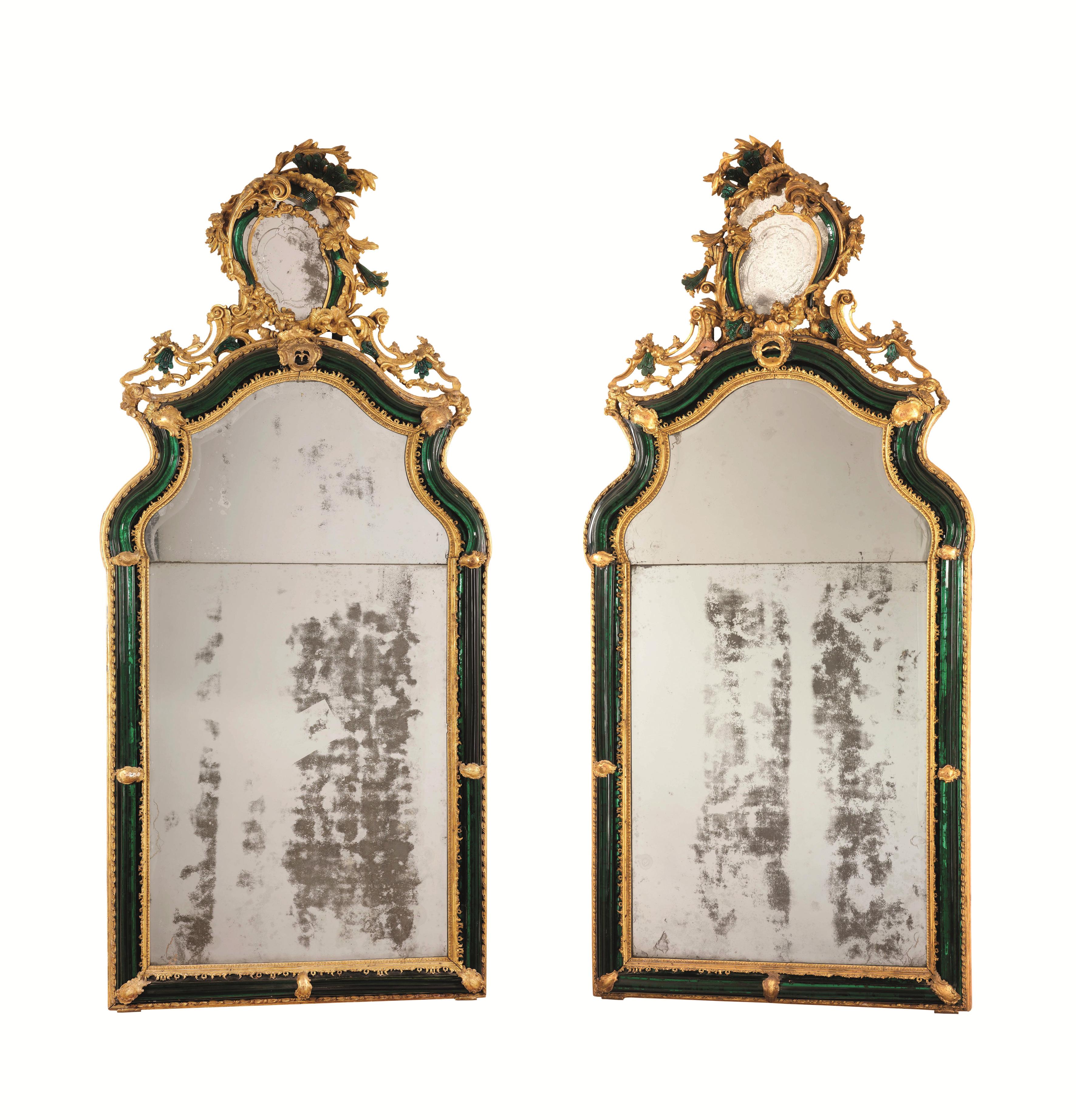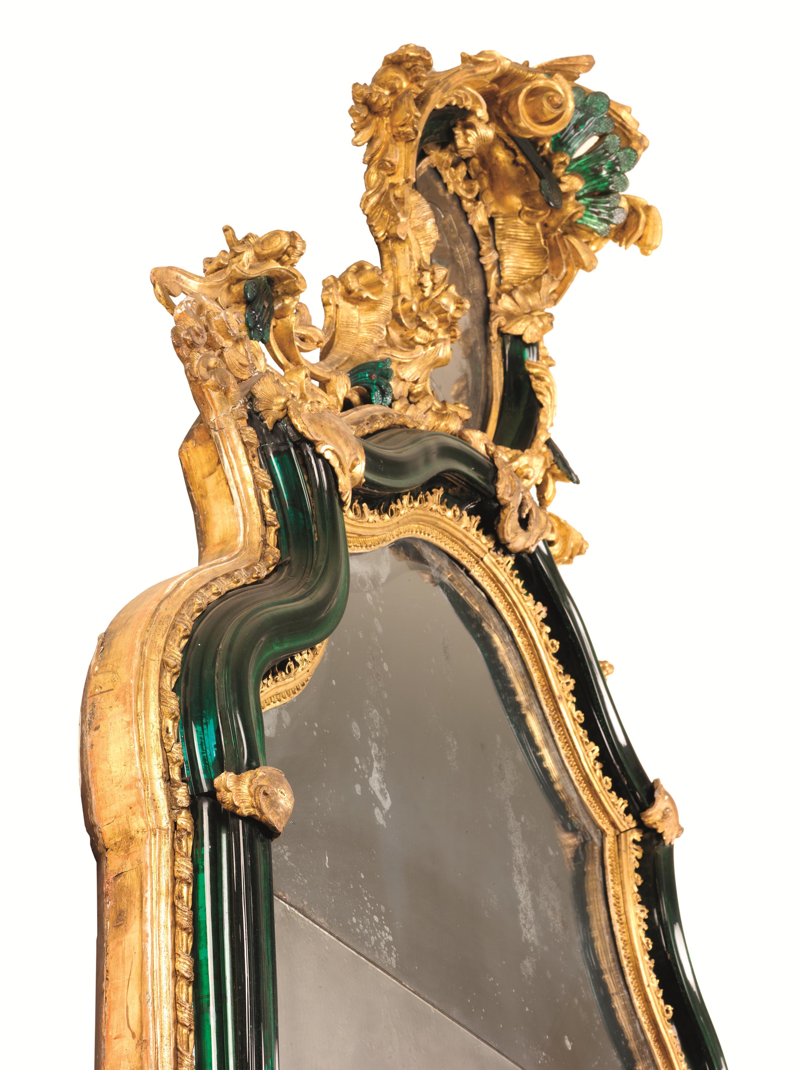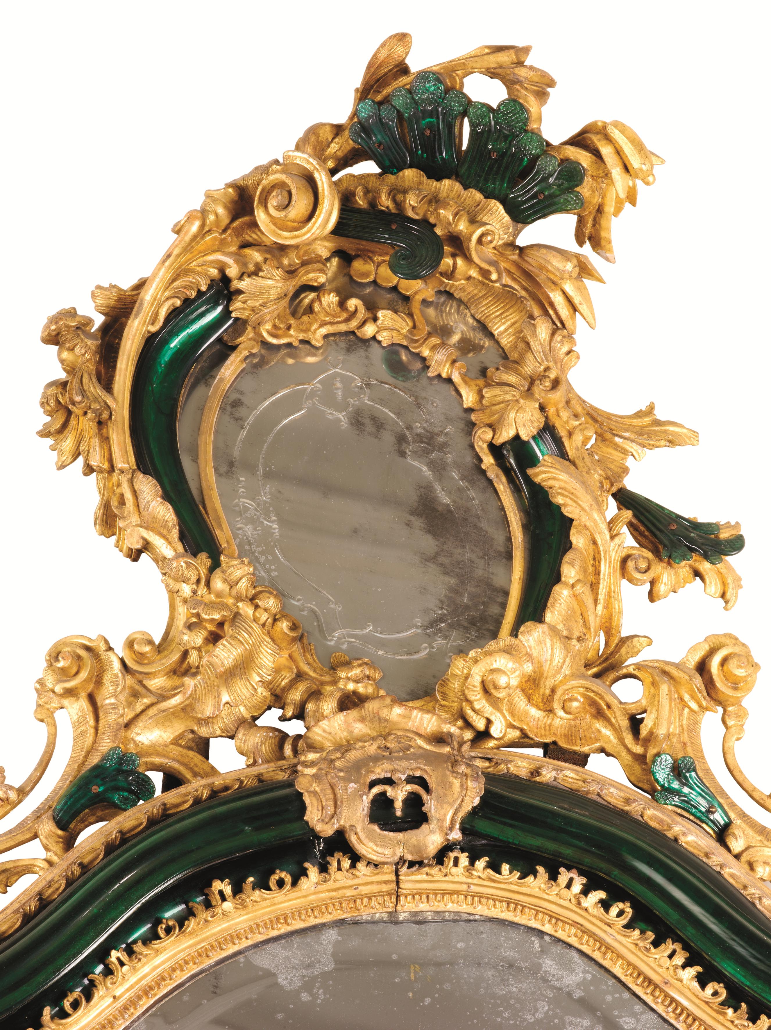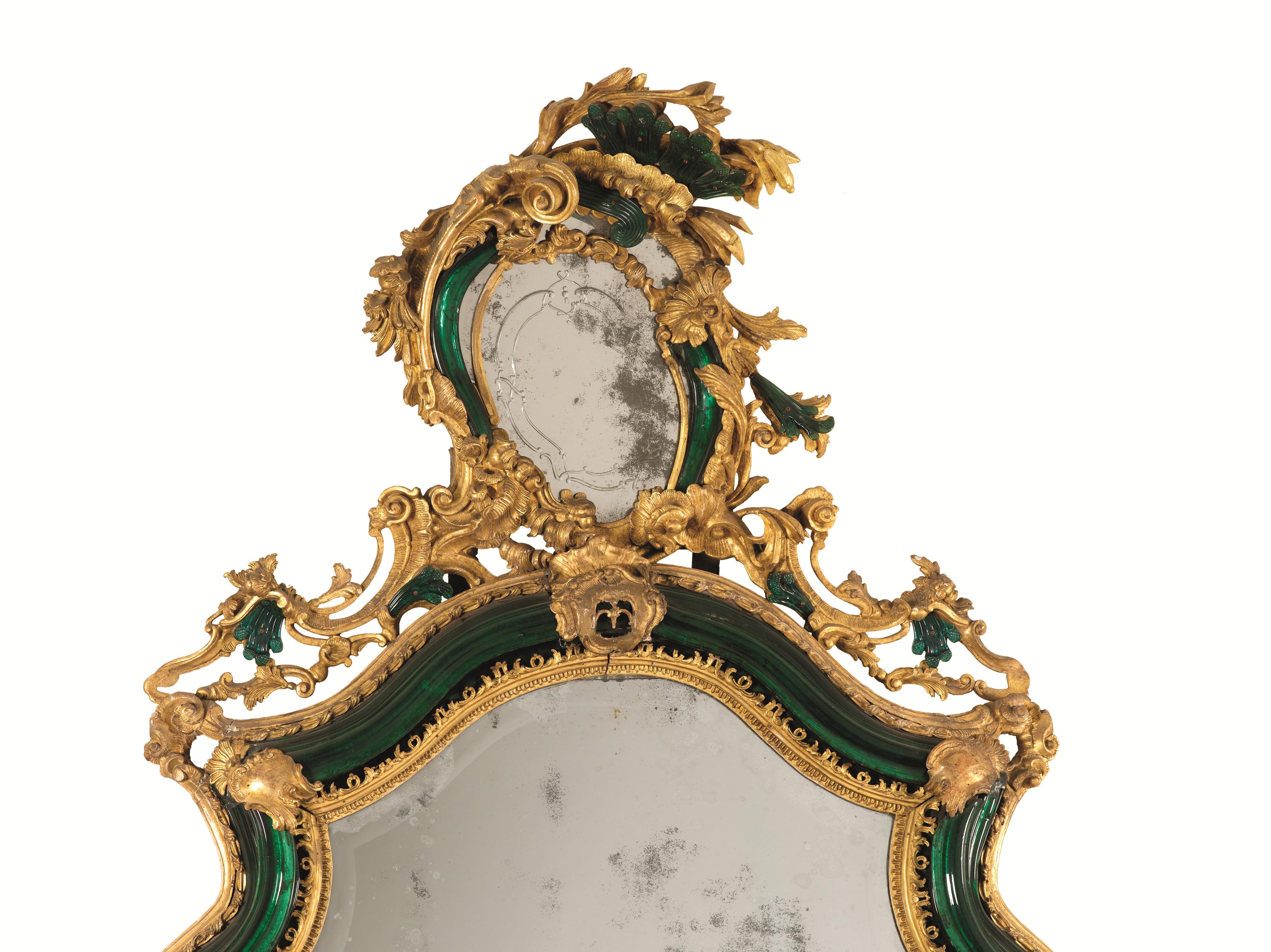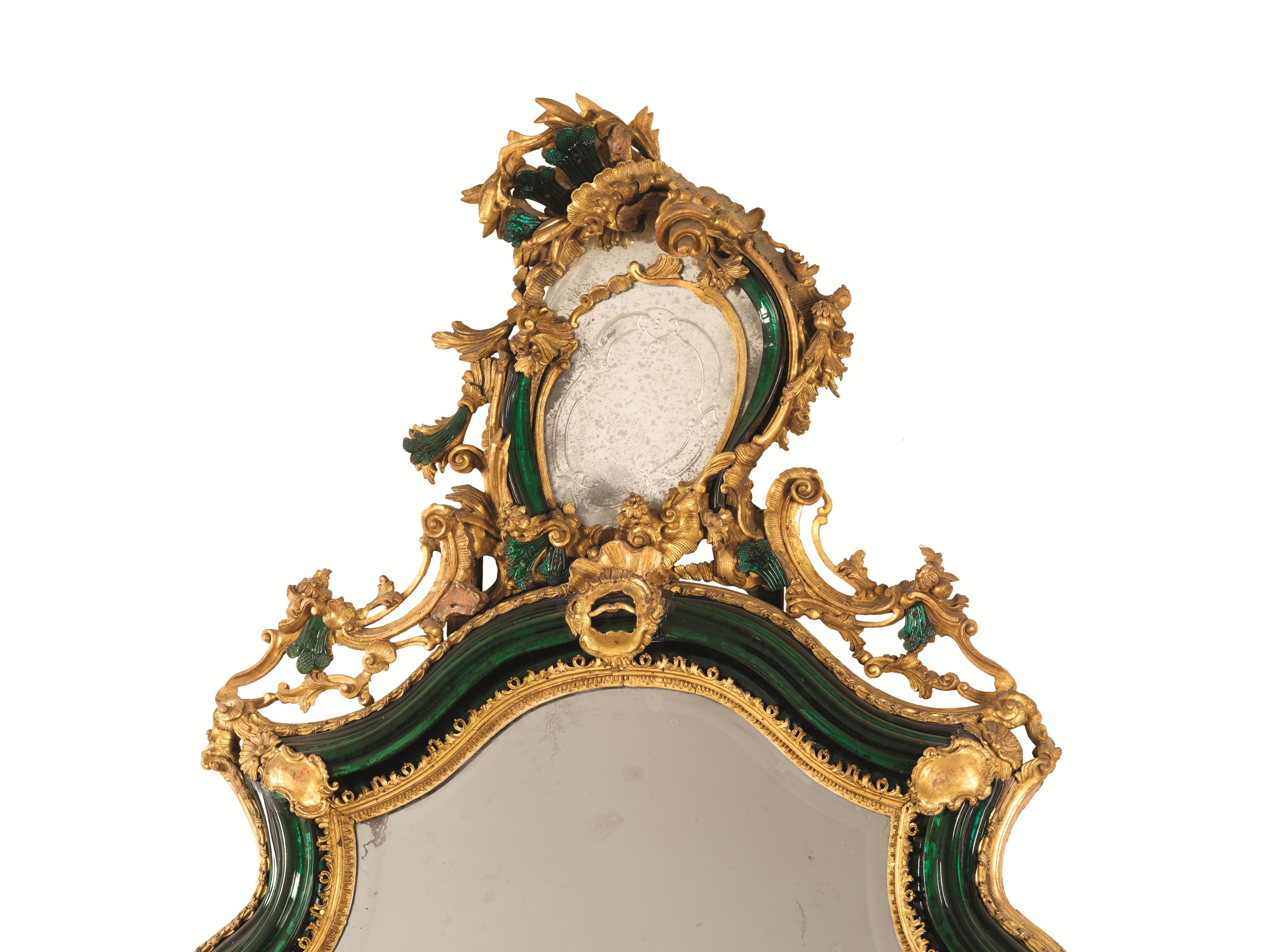 in legno intagliato e dorato con applicazioni in vetro. Il battente ligneo include una larga modanatura in vetro verde chiusa fra registri intagliati e dorati a motivi di foglie e dentelli e interrotta da cartigli; la parte superiore è incurvata con un andamento spezzato e sormontata da una rocaille asimmetrica, arricchita di altri elementi in vetro verde, e di foggia speculare nei due esemplari, cm 240x110.