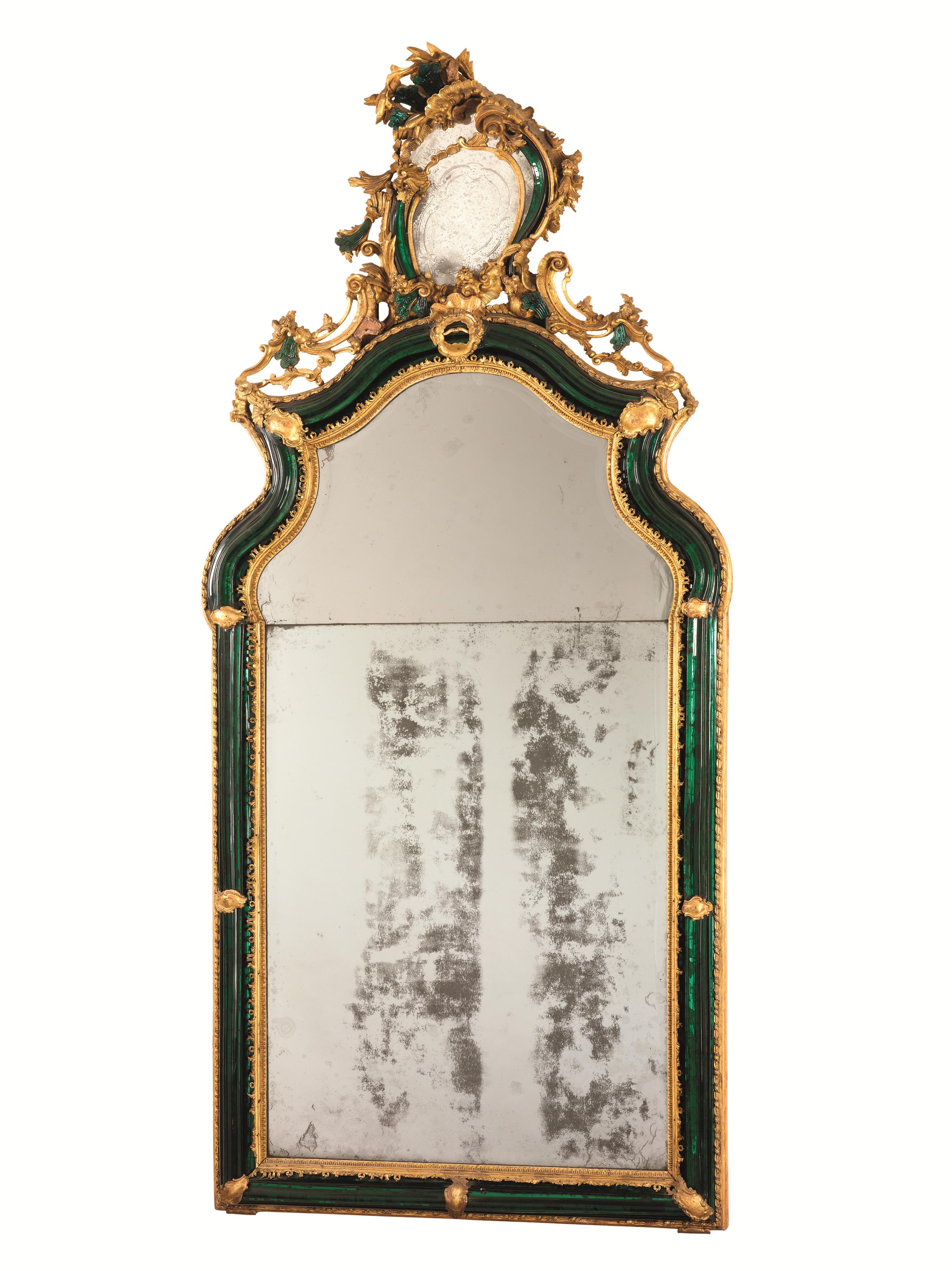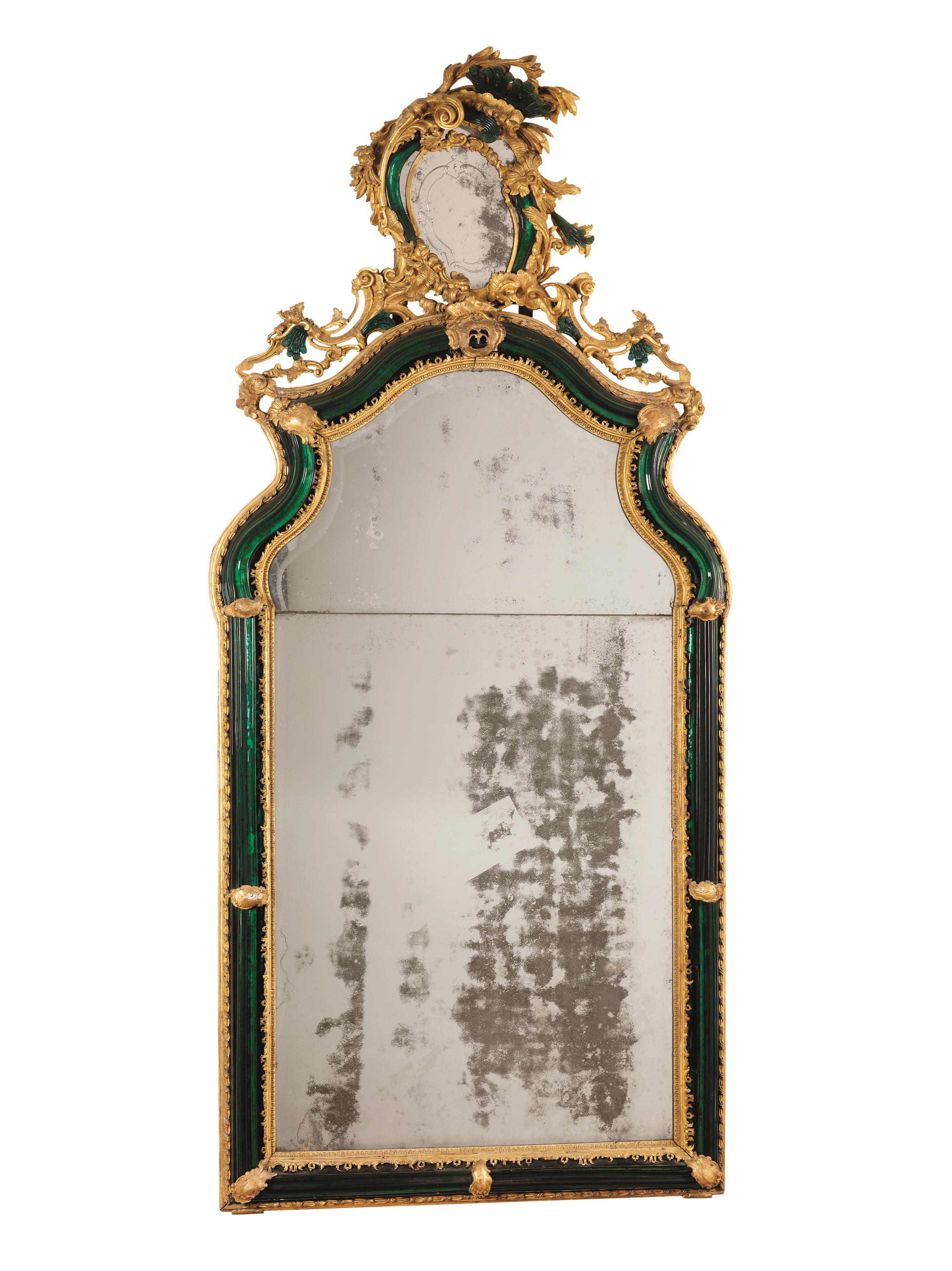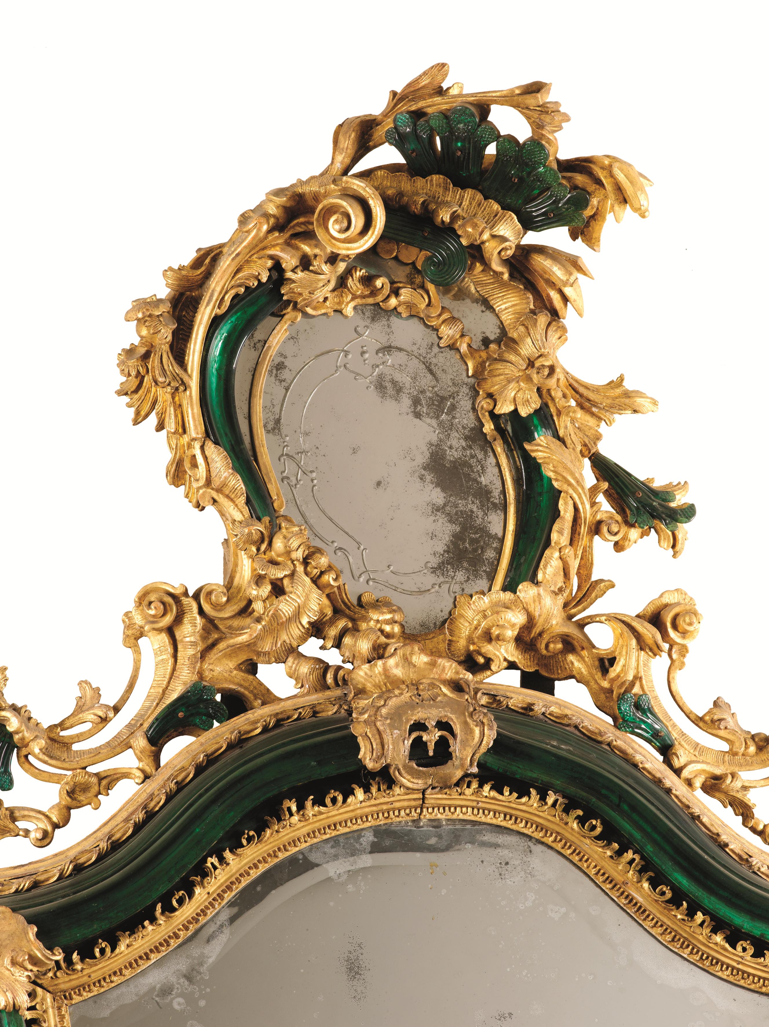 Motivo principale di quegli arredi e delle nostre specchiere è la presenza di rifiniture in vetro di Murano verde che compongono dei battenti, gocce, foglie e piccole rocaille adattandosi alle sagome lignee intagliate.