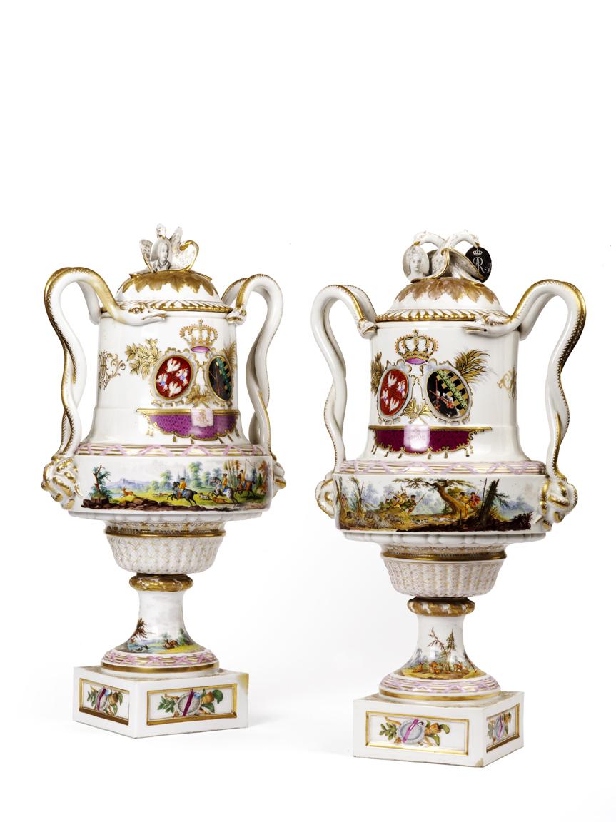 in porcellana dipinta con gli stemmi reali di Polonia-Lituania e dell’Elettorato di Sassonia, e con scene di caccia e trofei. Grandi anse serpentiformi, basi quadrate decorate con trofei, coperchi sormontati da ovali con ritratti di Augusto il Forte e Augusto III con le relative consorti e da monogramma AR in blu sottosmalto, alt. cm. 60 (2)