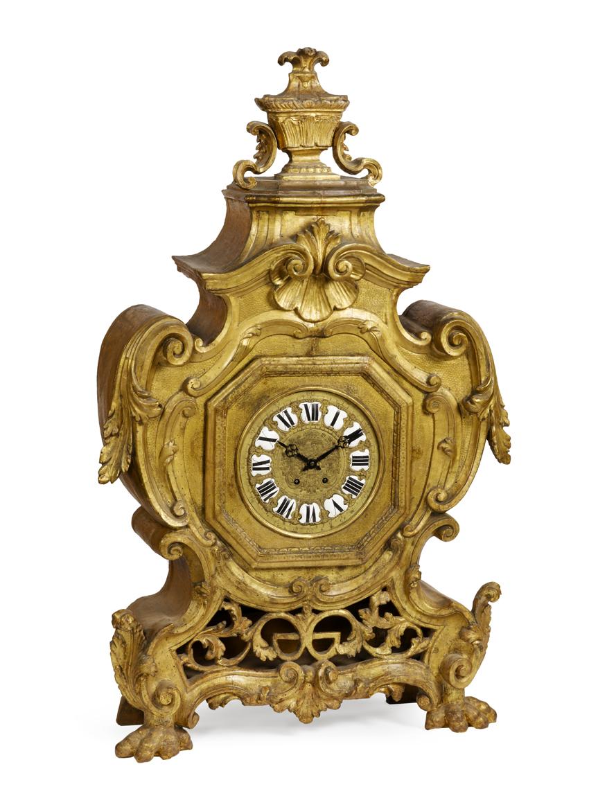 in legno intagliato e dorato, quadrante circolare in bronzo dorato e inciso con muneri romani su smalti entro cassa ottogonale, cimasa sormontata da vaso stilizzato, ampie volute laterali decorate con foglie, base traforata poggiante su piedi a zampa ferina, cm 135x80x25