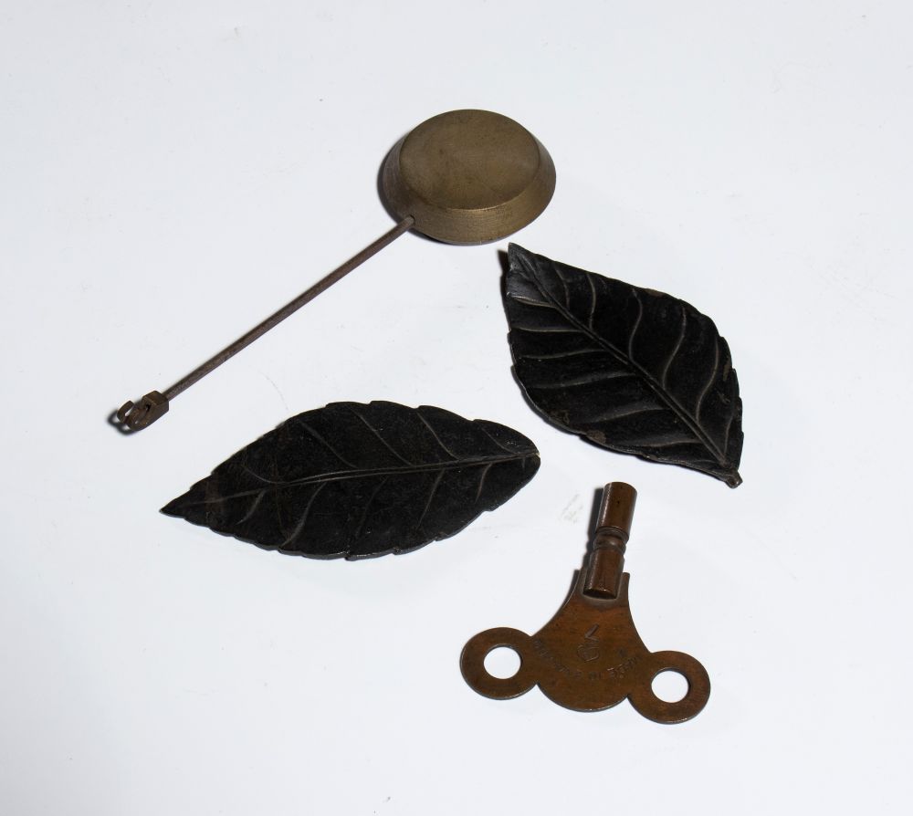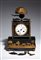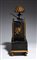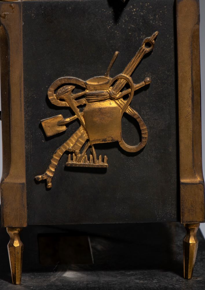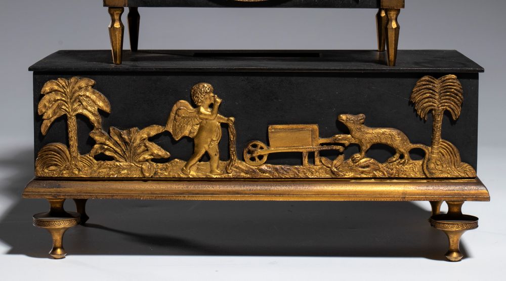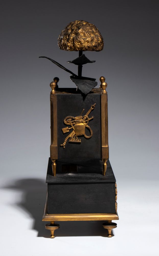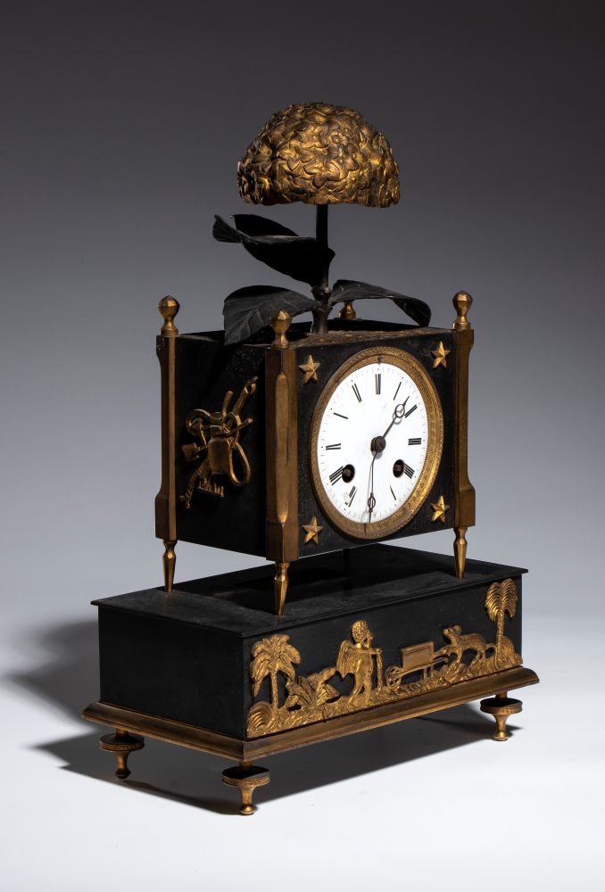 finemente cesellato e dorato, con elementi in bronzo patinato scuro. Il fronte è decorato con un fregio figurato con amorino e scena agreste, mentre la cassa, sostenuta da montanti con terminali a pinnacolo, presenta applicazioni a stella e trofei musicali sui lati. Sormontato da elemento decorativo naturalistico raffigurante un fiore stilizzato con foglie in bronzo patinato a corolla in bronzo dorato e traforato. Quadrante in smalto bianco con numeri romani. Movimento meccanico a carica manuale con suoneria su campana, di produzione francese, numerato e recante medaglia "Médaille d'argent-Honneur" indicativa di manifattura premiata in esposizioni industriali della prima metà del XIX secolo.