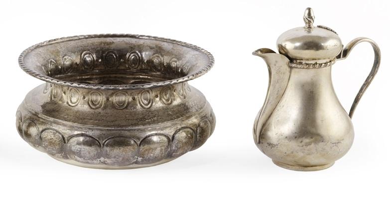 CACHE POT, SECOLO XX in argento sbalzato, diam. 22,5, g 785, CAFFETTIERA ALLA...