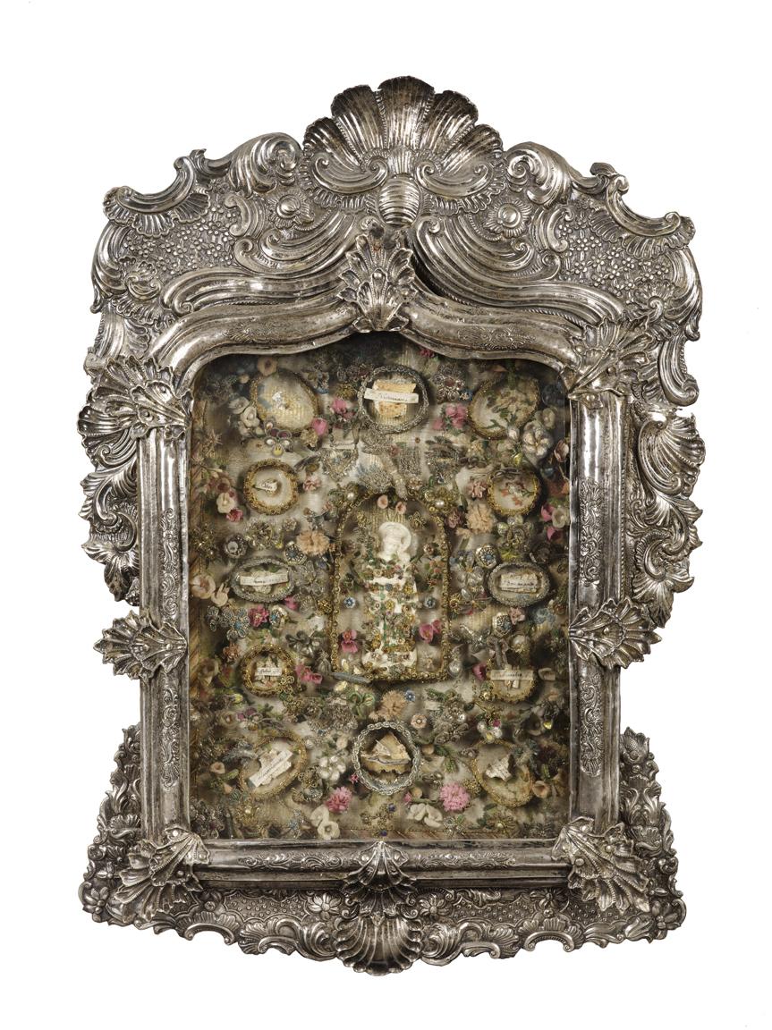 con cornice in argento decorata da volute, cm 61x33, completa di reliquie