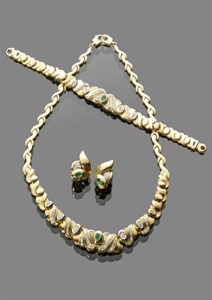 PARURE Parure composta da girocollo , bracciale e coppia orecchini in oro giallo e oro bianco con smeraldi di taglio ovale e diamanti taglio brillanti per complessivi ct 0,90 ca Peso complessivo gr 117,90 Ensemble consists of necklace, bracelet and pair earrings in yellow and white gold with an oval cut emeralds and brilliant-cut diamonds totaling about 0.90 ct Total weight 117.90 gr