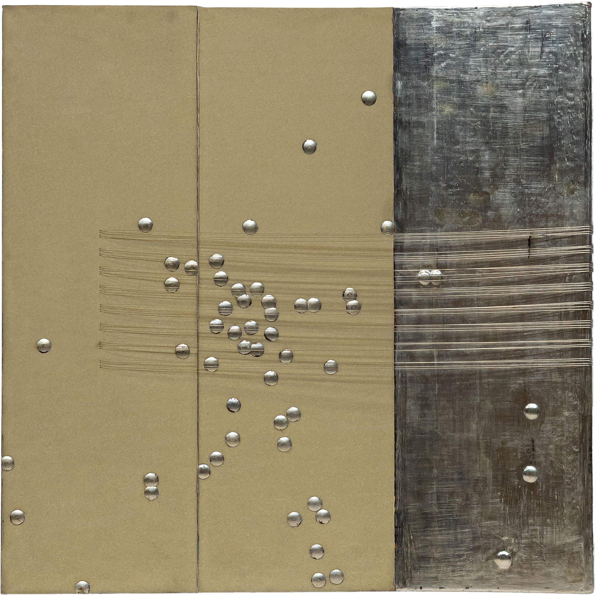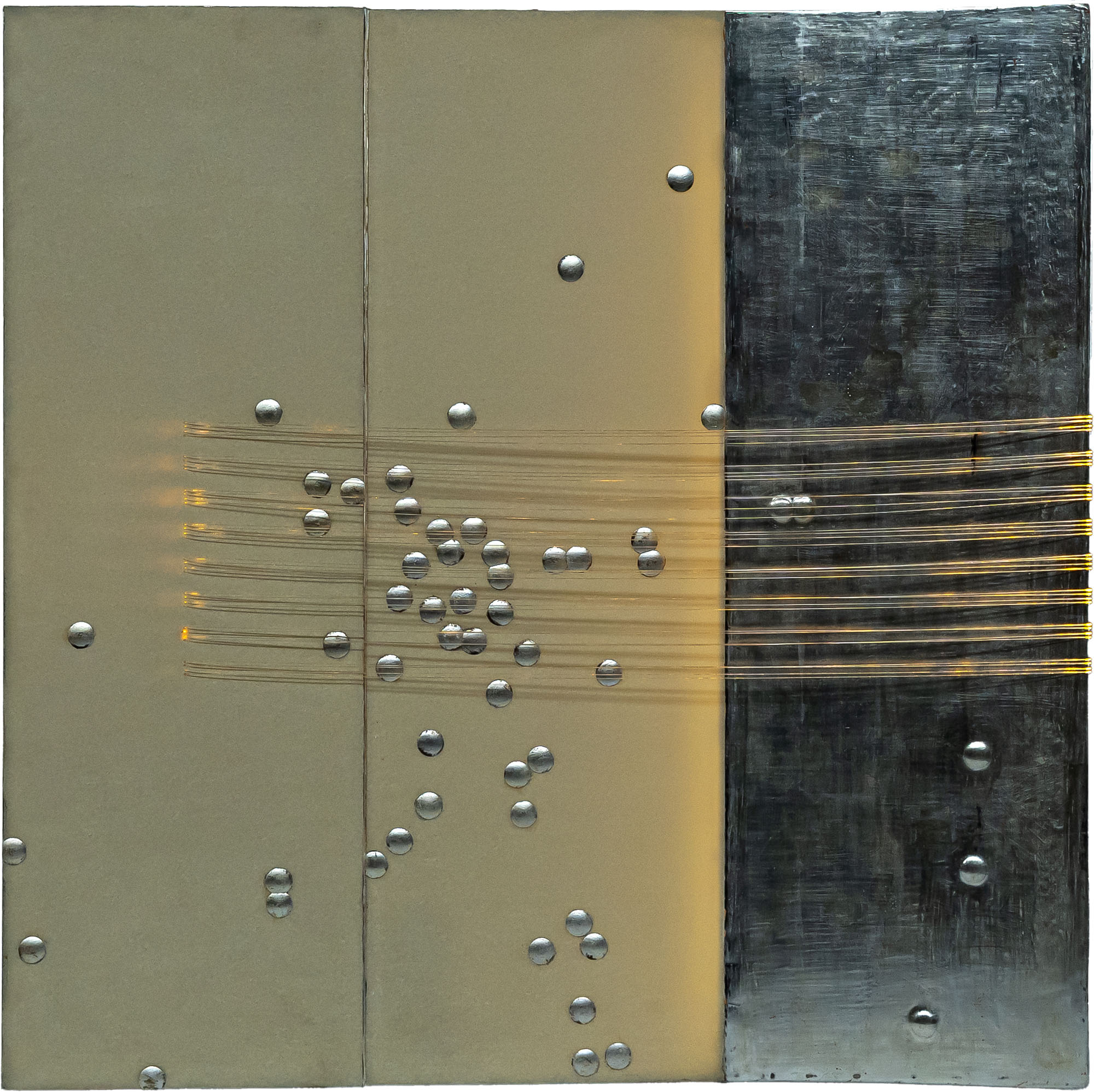 SHINJI YAMAMOTO(1965)QuadratusPergamena sintetica, foglia d'argento, gesso a oro, alluminio, legno, tela, carta, lampada dicroica, fibre ottiche; es. 5/20120 x 120 cmFirma e numerazione su targa TARGETTIARTLIGHTCOLLECTIONOpera accompagnata da autentica su fotografia firmata dall'artistaOpera accompagnata da certificato di autenticità a cura della TARGETTIARTLIGHTCOLLECTION, FirenzePROVENIENZA:TARGETTIARTLIGHTCOLLECTION, FirenzeCollezione privata