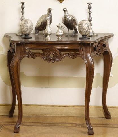 in noce, piano sagomato, pendaglina frontale traforata e centrata da conchiglia rocaille, gambe sinuose, piedi a zoccolo stilizzato, cm 80x98x52 (2)