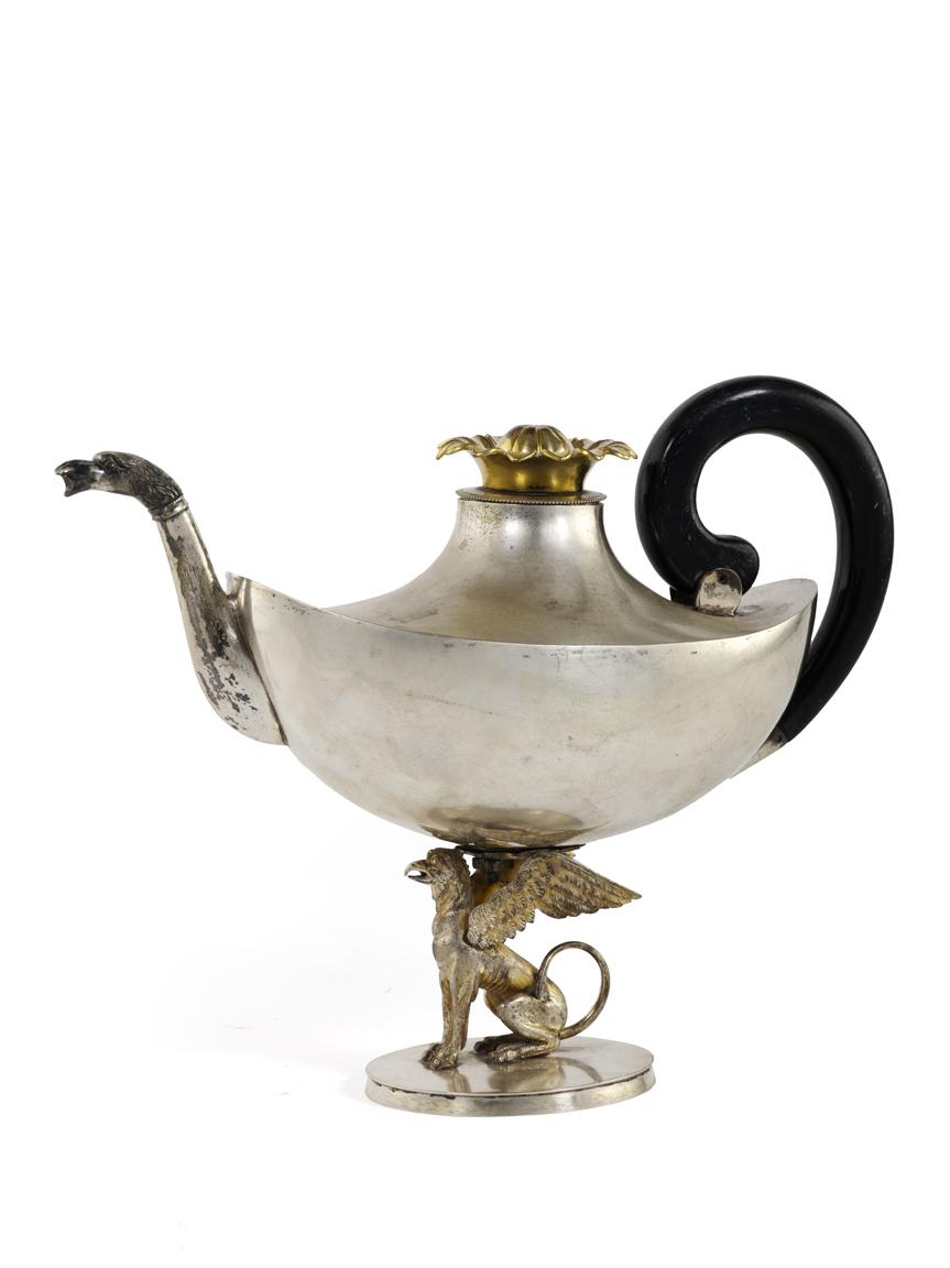TEIERA in argento, di forma ovale poggiante su figura di leone alato, presa...