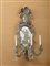 in vetro a tre luci, cornice sagomata sormontata da cimasa aperta in una palmetta centrata da mascherone, vetro decorato con figure, cm 80x43, rifacimenti (2)